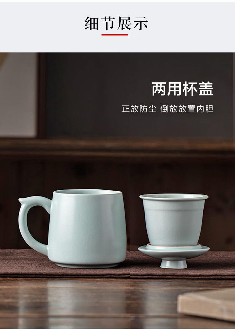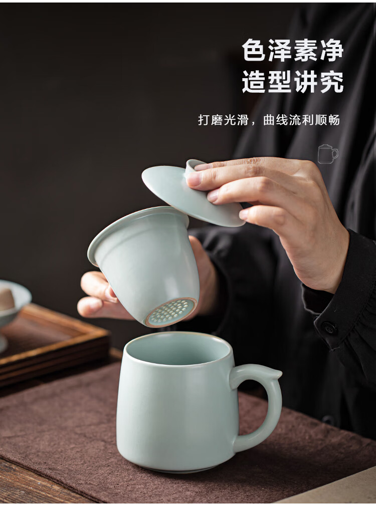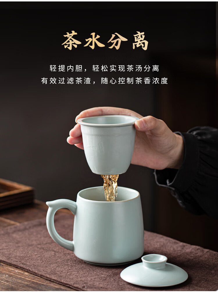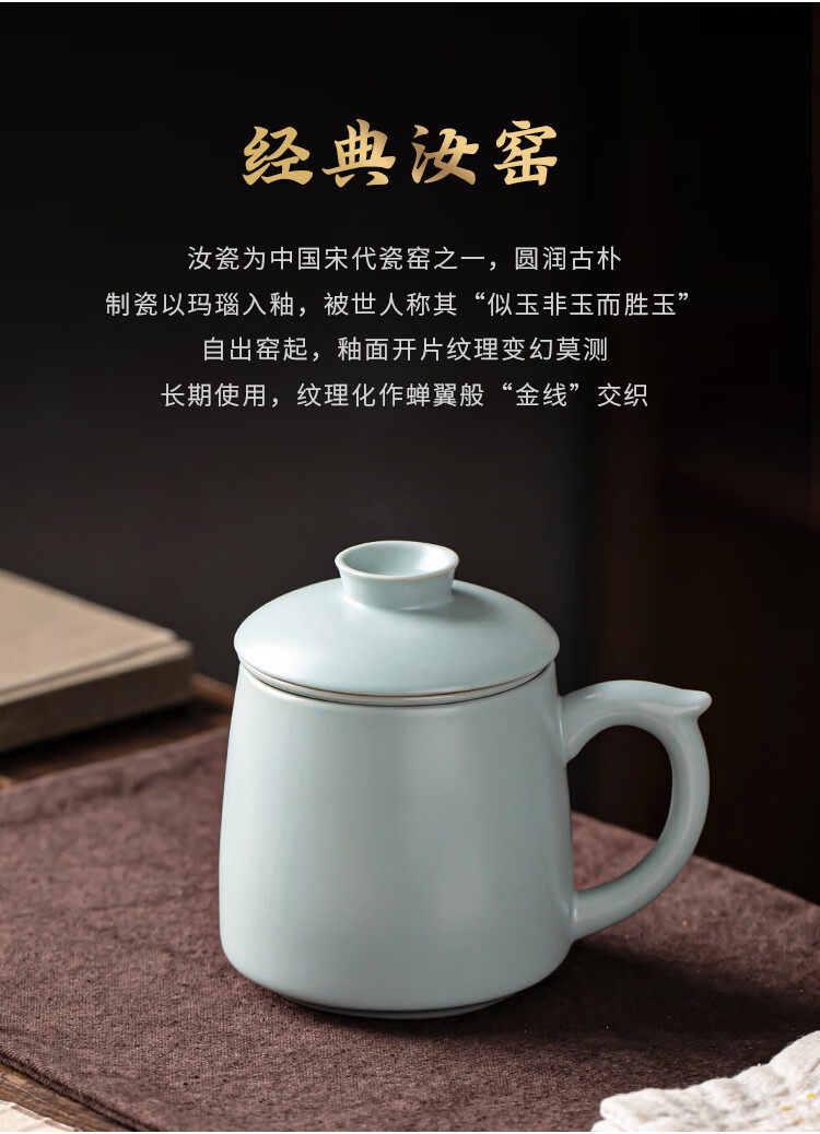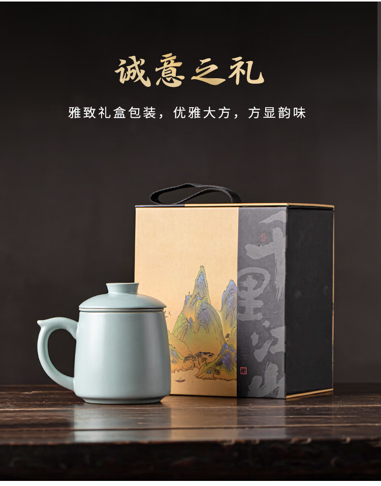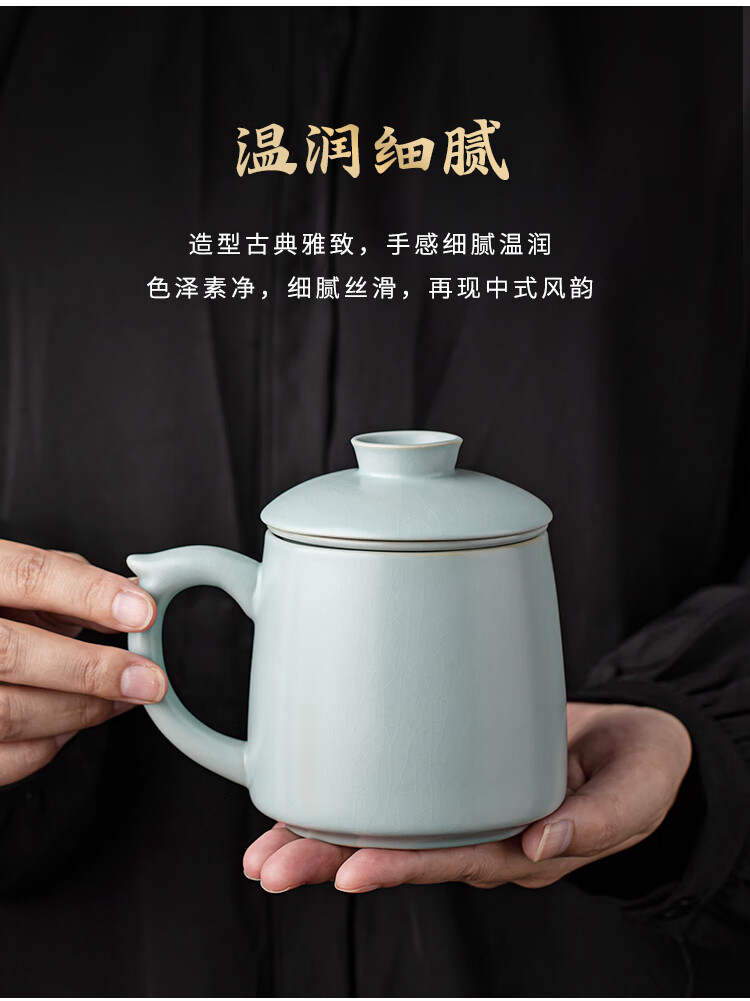经典汝窑 温润细腻 复古国风 自带同材质过滤 滤茶干净 轻松喝茶 颜色雅致 诚意之礼 产品配置:杯子*1 内胆*1 杯盖*1 礼盒*1