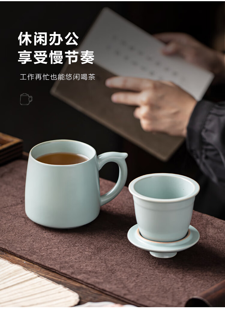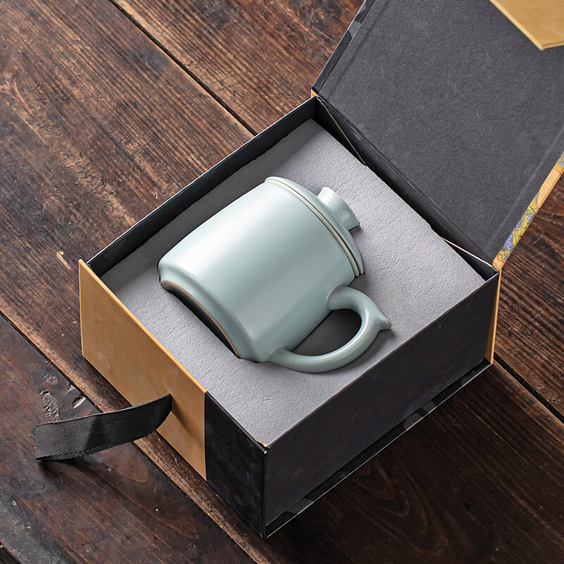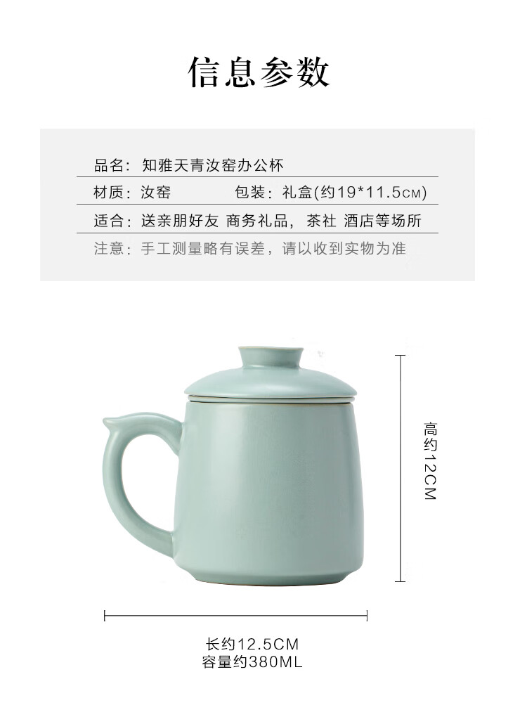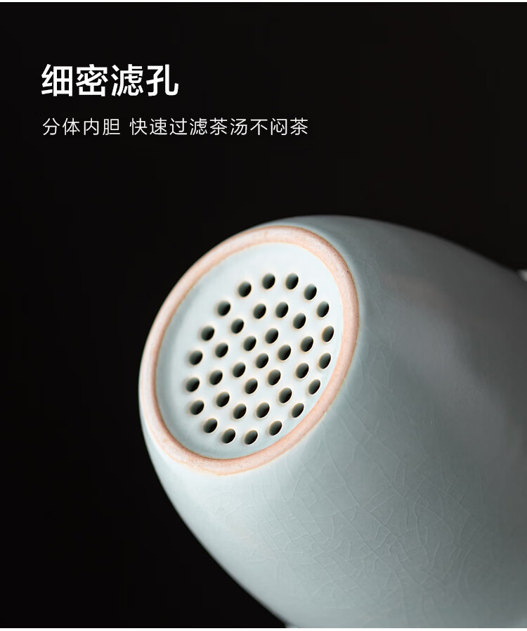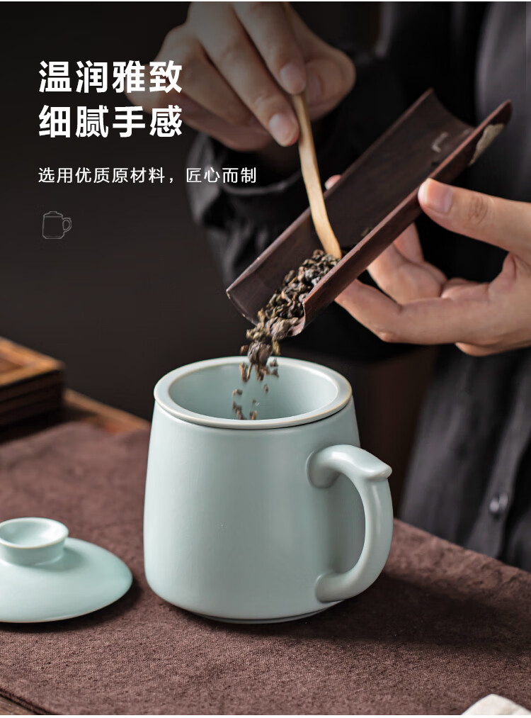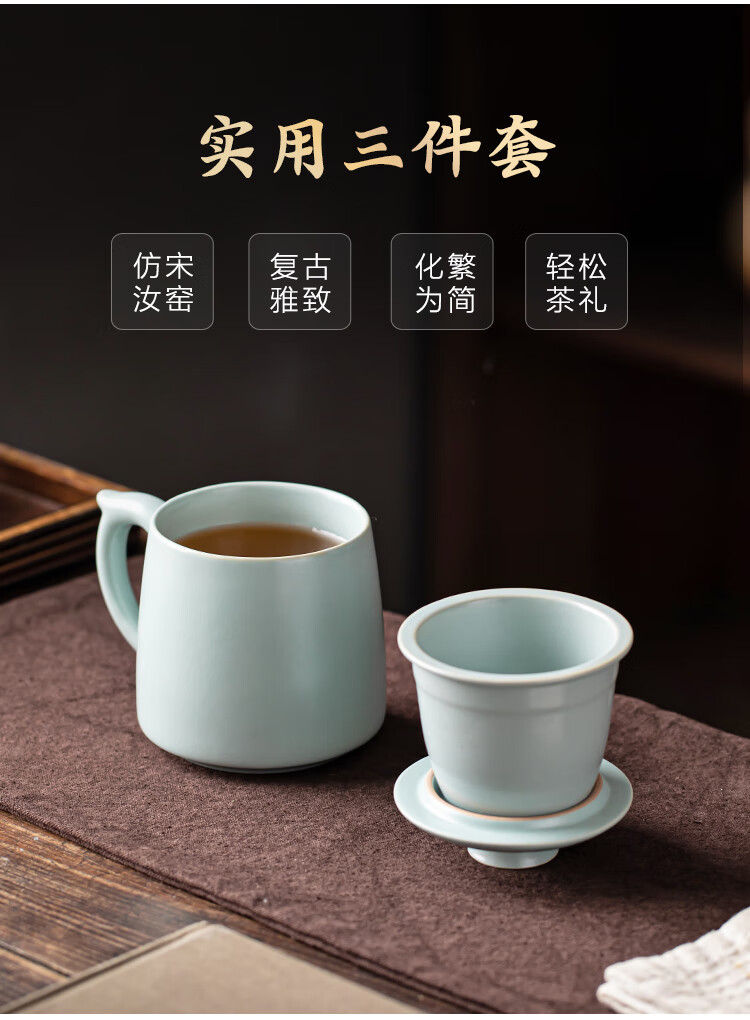 经典汝窑 温润细腻 复古国风 自带同材质过滤 滤茶干净 轻松喝茶 颜色雅致 诚意之礼 产品配置:杯子*1 内胆*1 杯盖*1 礼盒*1