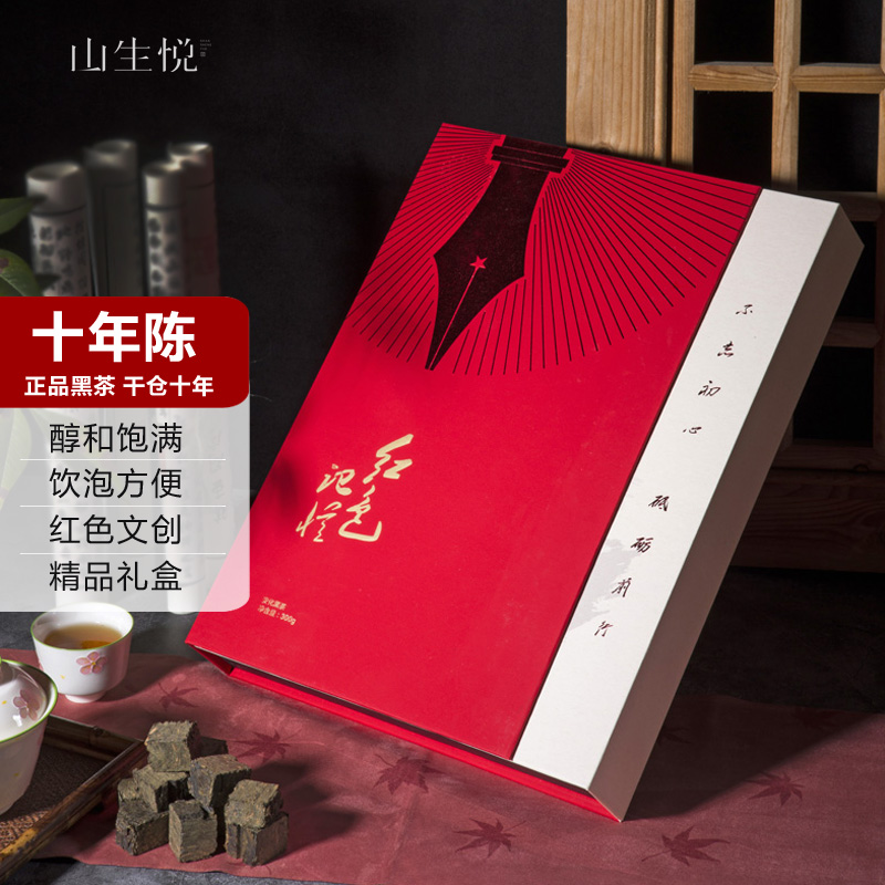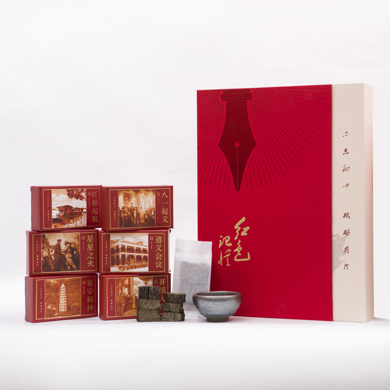 配 料:安化黑毛茶 产品规格: 300g(50gX6盒) 包装规格:350X260X50mm 储存方法:通风、干燥、清洁、无异味 口 感:陈香、醇和、甜柔 六个卡盒分别印有: 重要红色记忆时刻。 每个卡盒内用棉纸代装有6颗黑砖颗粒茶,每盒50g 选用2012年的黑砖颗粒,锯成颗粒茶,方便取泡饮用。