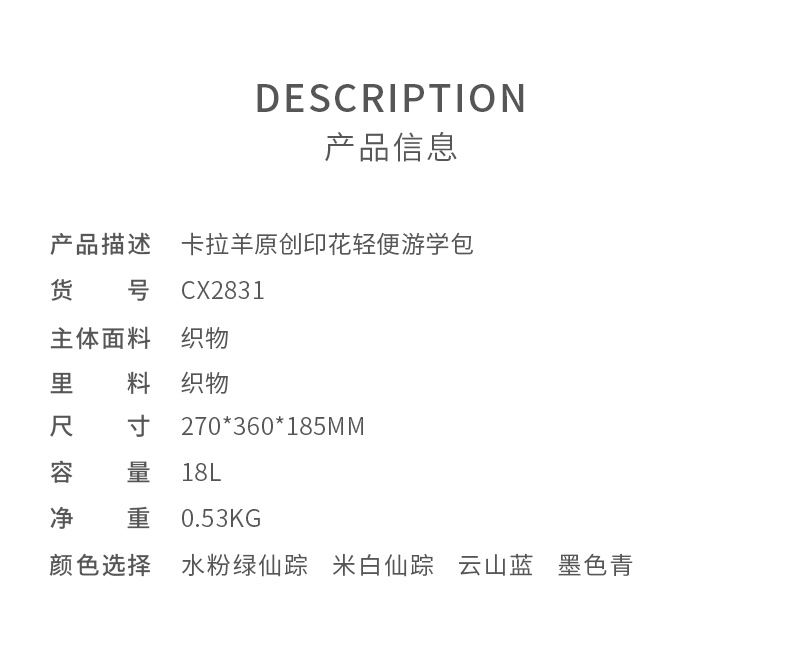 货号:CX2831 主体面料:织物+合成革;里料:织物 颜色:水粉绿仙踪 定位: 1-4年级/110-150cm 净重:0.53kg 18L