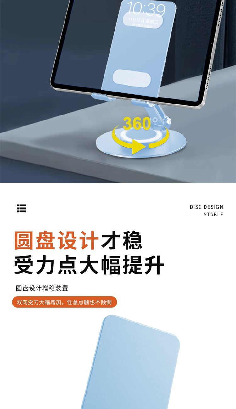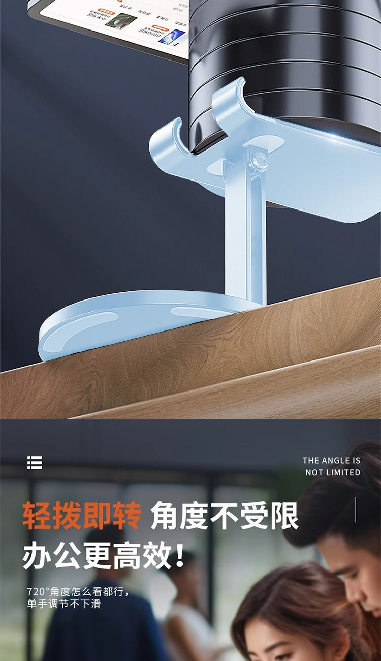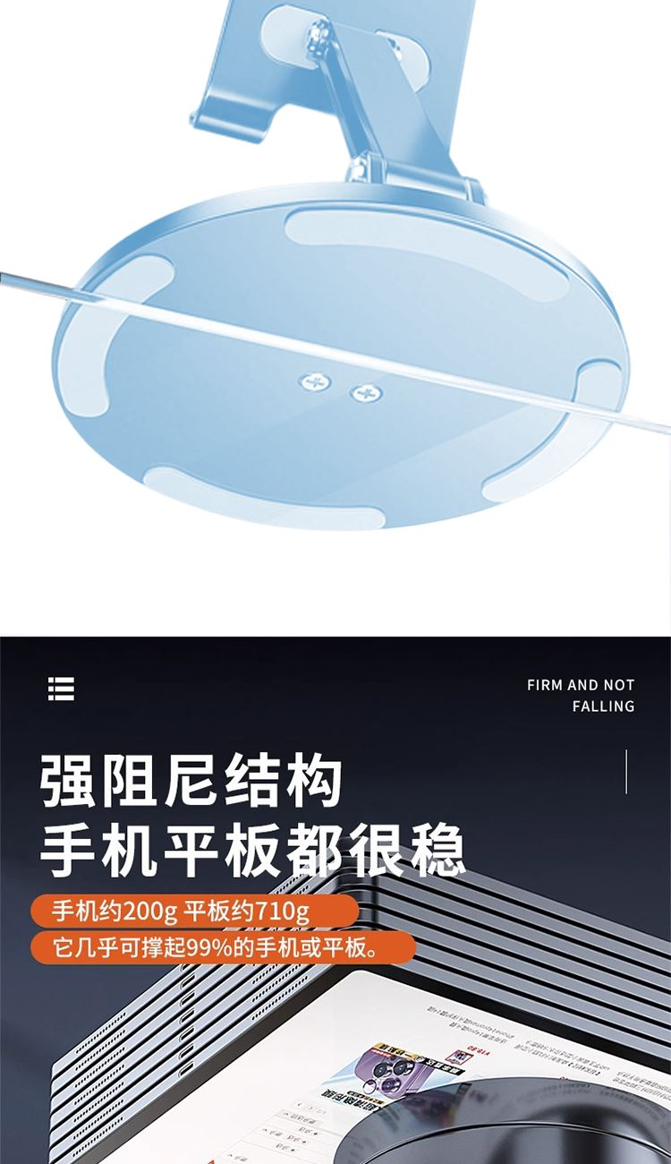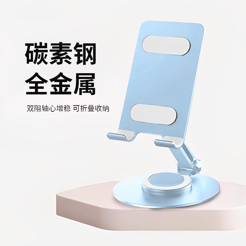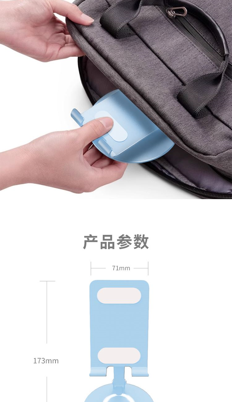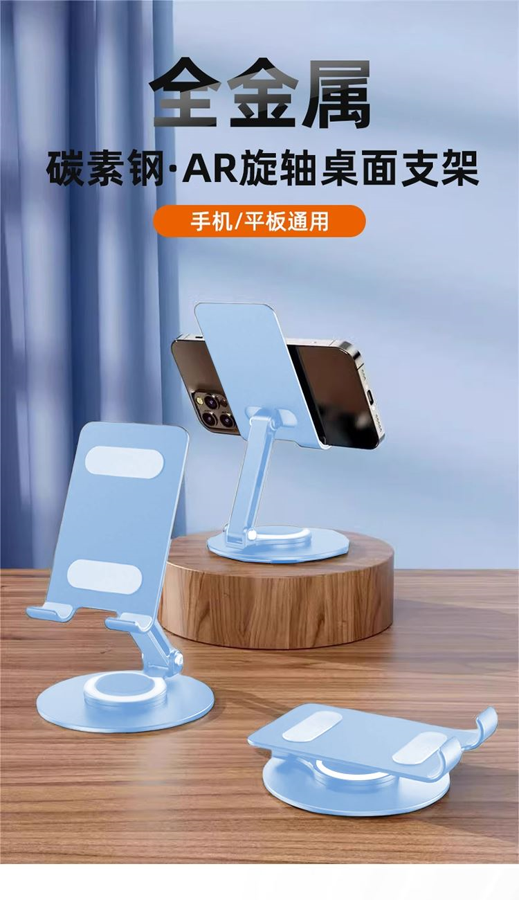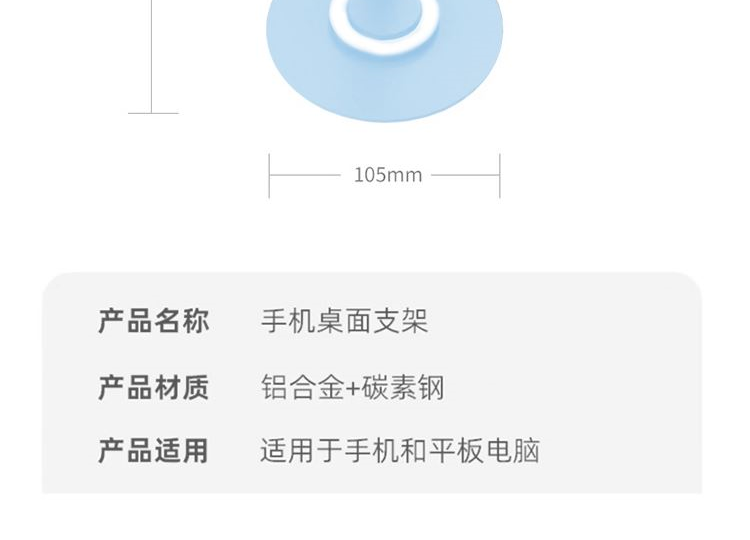 颜 色: 蓝色 材 质:碳素钢+硅胶 产品尺寸:177*105*40mm 包装尺寸:10.2*8.7*3.6cm 产品净重:215g 360度旋转,阻尼效果,大面积硅胶防滑,全金属,大尺寸-可兼容平板,多角度调节,一体折叠便携,底座高密度纯 铁冲压喷漆工艺,圆形设计,更稳固,定制方便