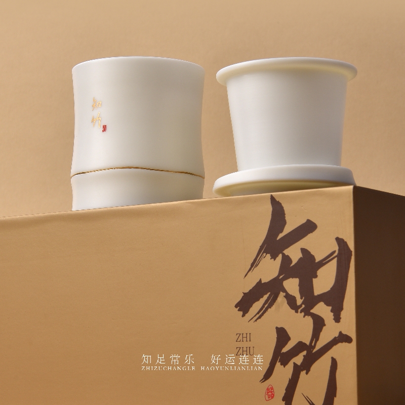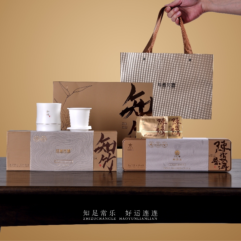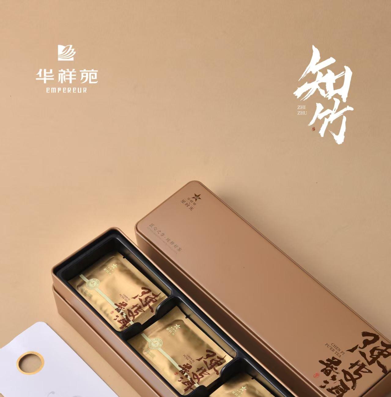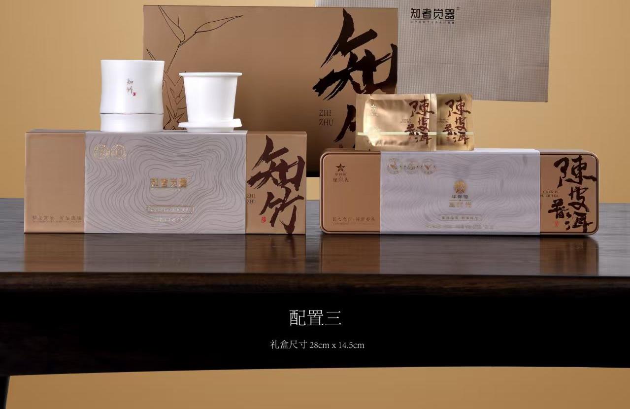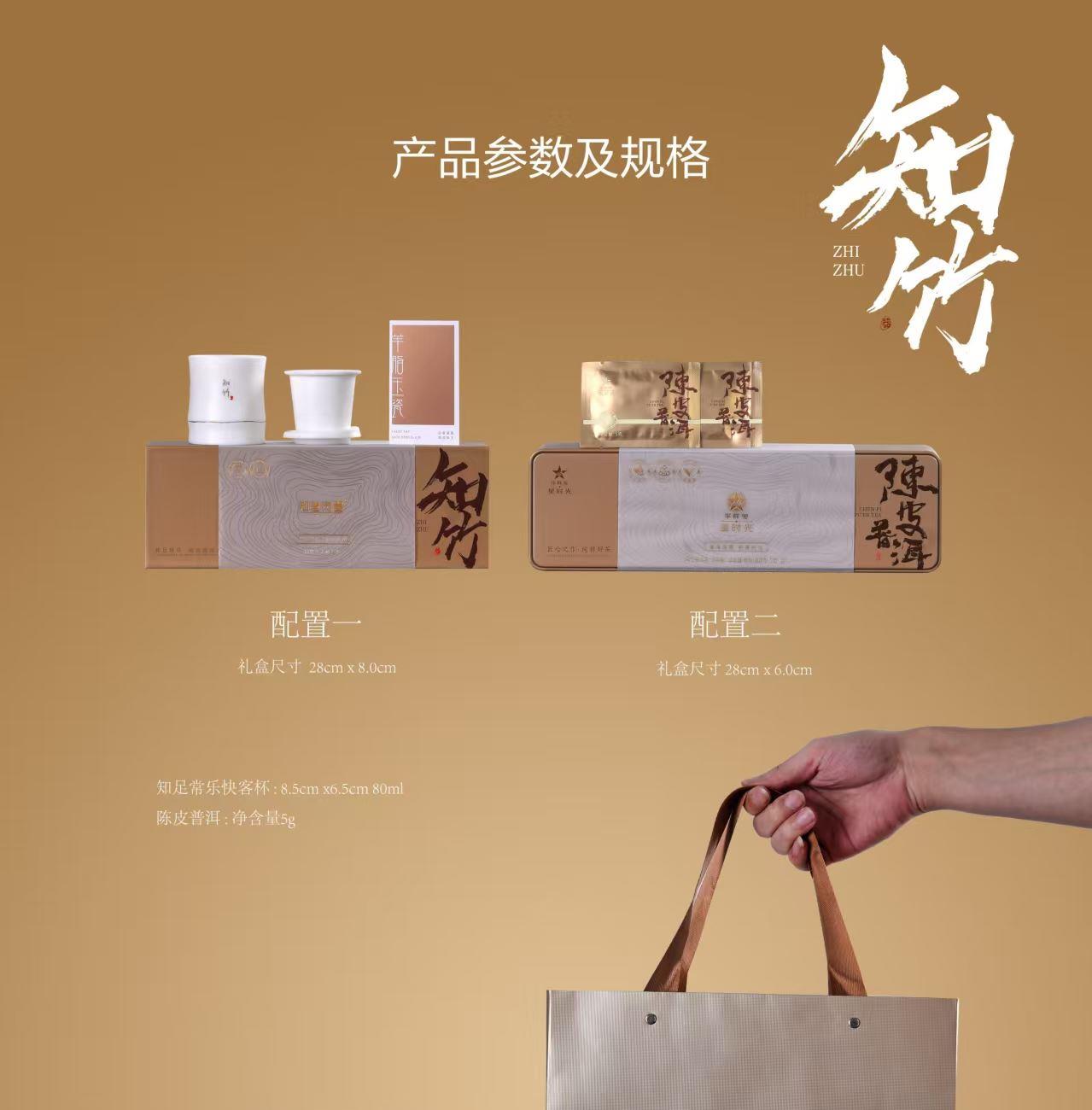 《知竹-旅行快客茶礼套装》 知竹快客杯以羊脂玉瓷为骨,素烧工艺凝练天然温润,釉面如月华初雪,描金竹叶跃然杯身,寓知足常乐之境;茶中良伴,搭配华祥苑陈皮普洱小方块,普洱温养,每片皆可单泡,随行随享,以知竹杯载陈皮普洱,赴一场竹仗芒鞋轻胜马的东方茶旅。 配置:三件套旅行杯*1+105g华祥苑陈皮普洱小方片礼盒装*1+精美礼盒+手提袋 陶瓷材质/工艺:羊脂玉瓷素烧(旅行快客)