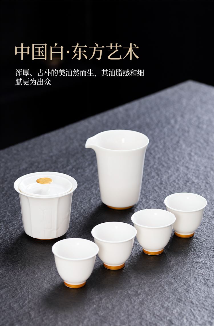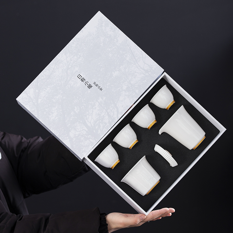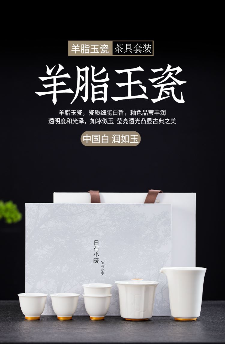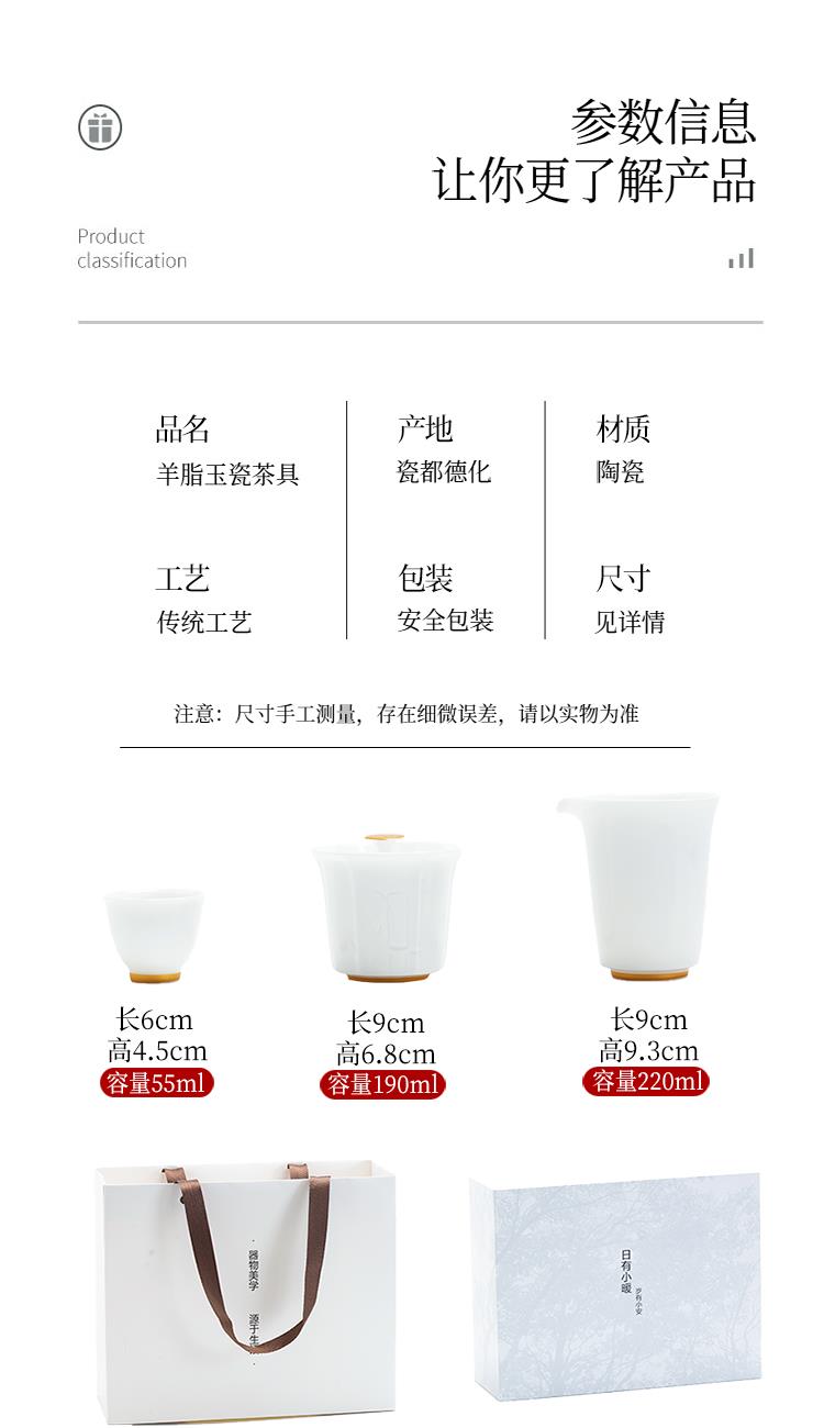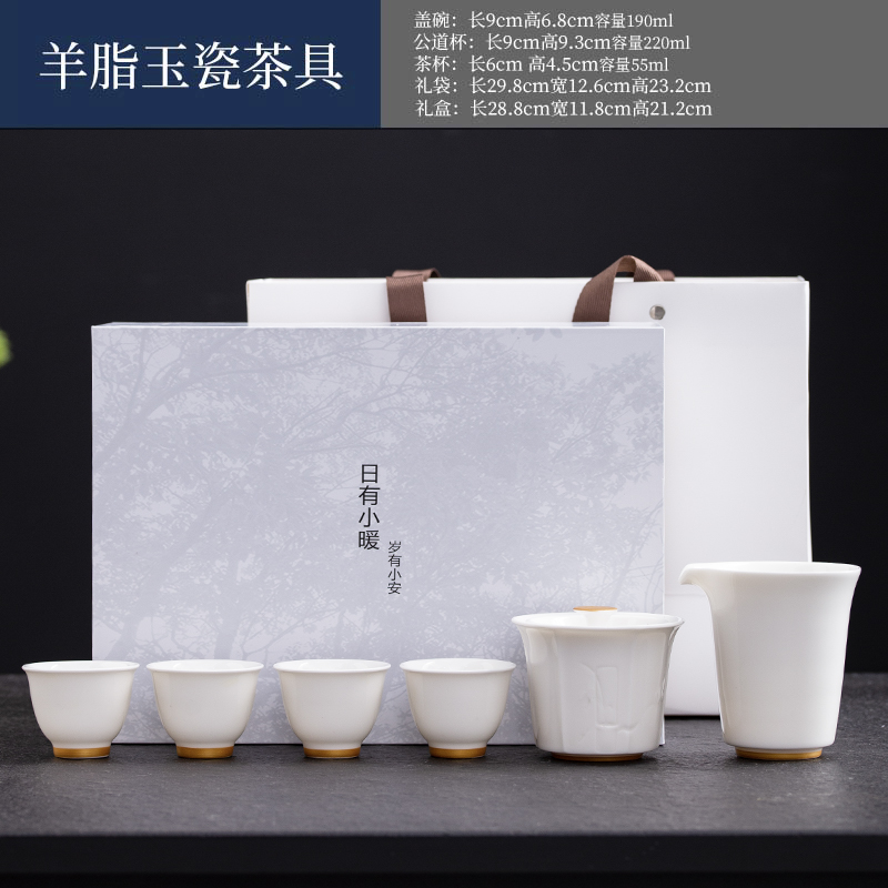 配置:盖碗*1 品茗杯*4 公道杯*1 礼盒*1 材质:羊脂玉 礼盒尺寸:29cm*21cm*12cm 陶瓷容量:杯子:50ml 盖碗:175ml 茶海 195ml