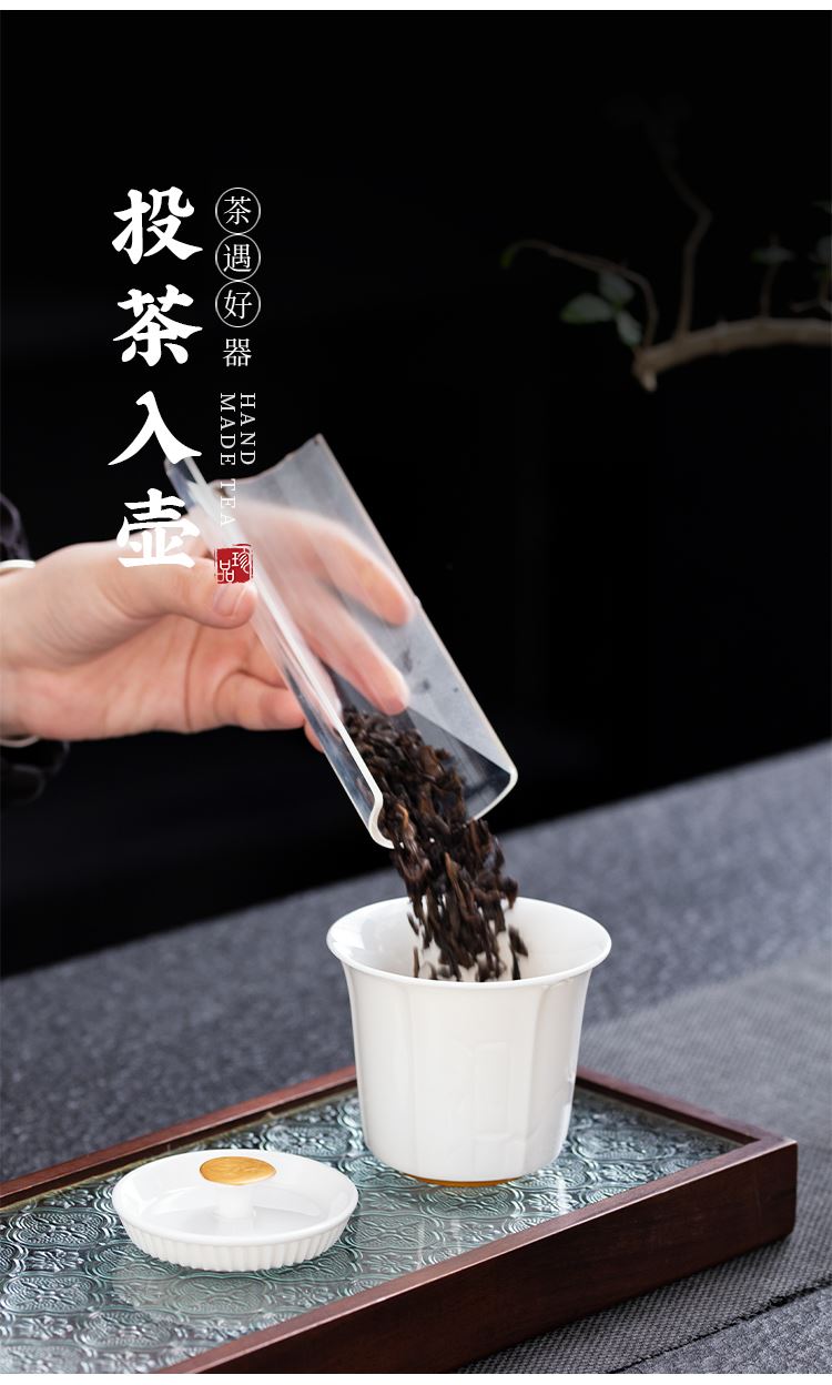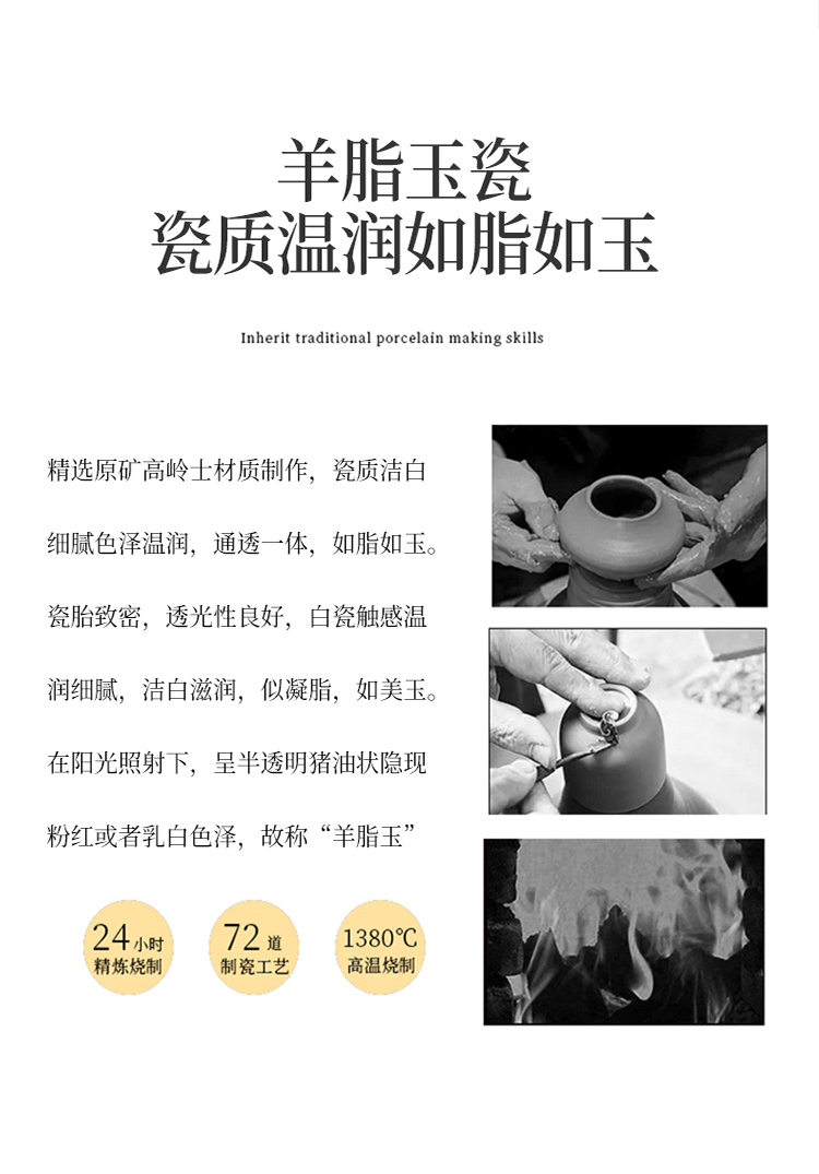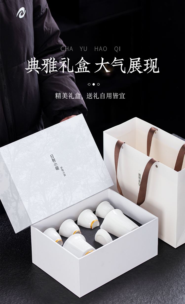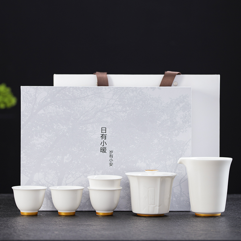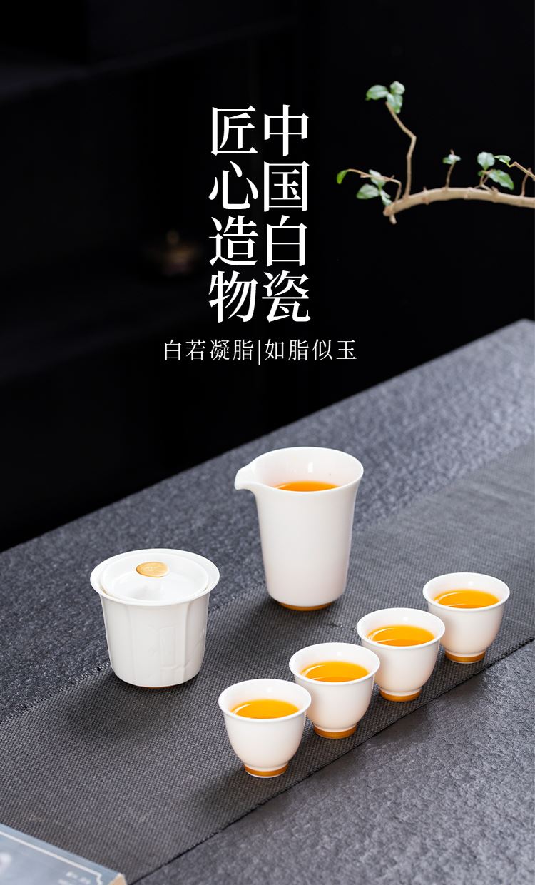 配置:盖碗*1 品茗杯*4 公道杯*1 礼盒*1 材质:羊脂玉 礼盒尺寸:29cm*21cm*12cm 陶瓷容量:杯子:50ml 盖碗:175ml 茶海 195ml