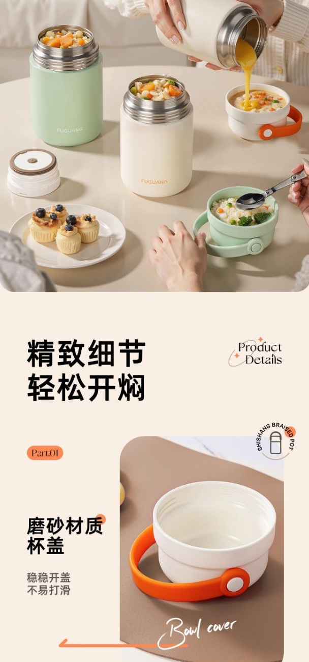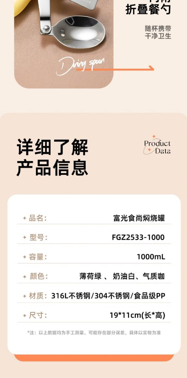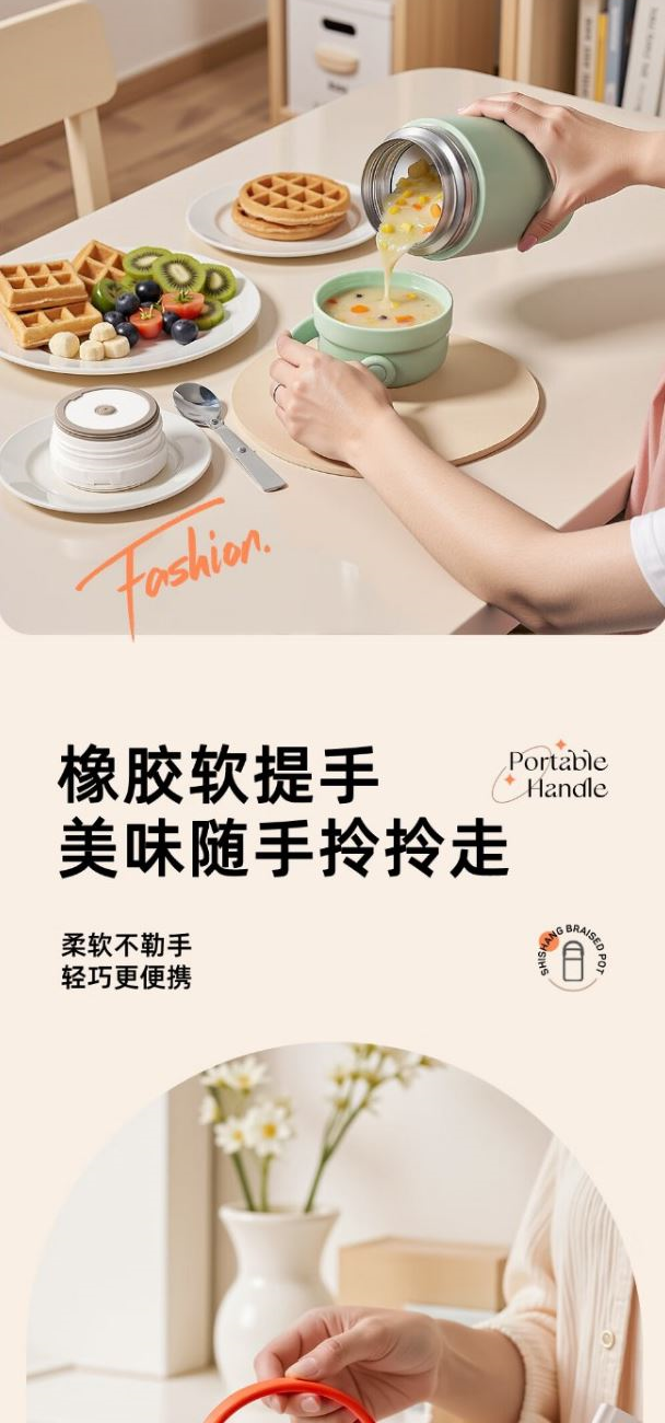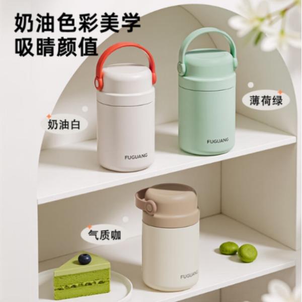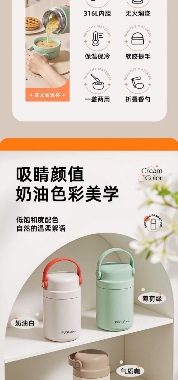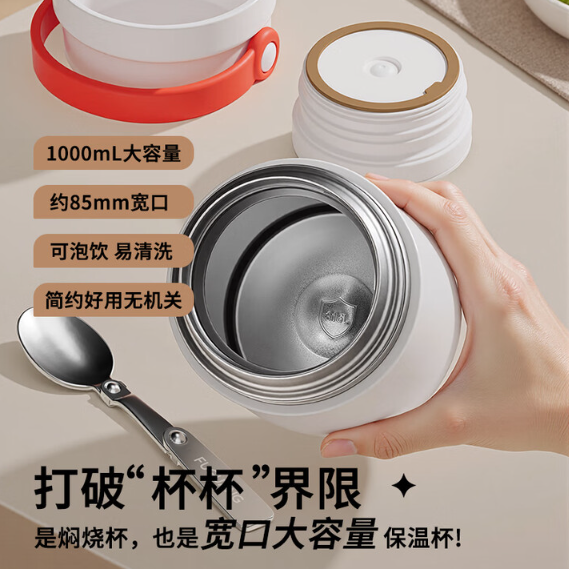 容量:1000ml 颜色:薄荷绿 奶油白 气质咖 尺寸:190*110直径*高 材质:316奥氏体不锈钢镜面处理内胆、无尾真空超长保温。 杯盖亦是分享碗,并独立餐勺。提环设计方便外出携带。 包装:单瓦盒