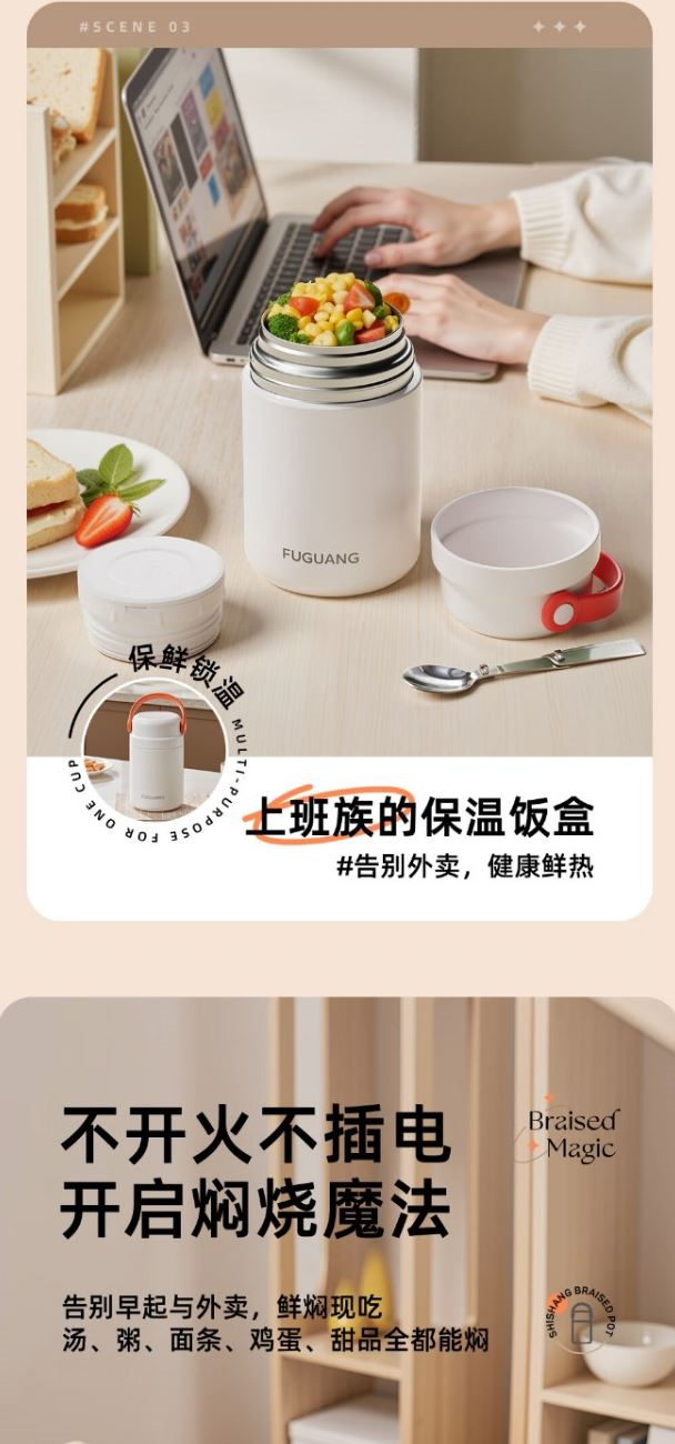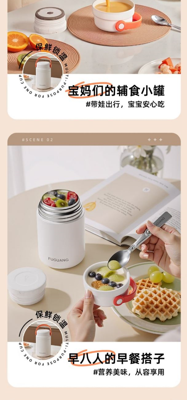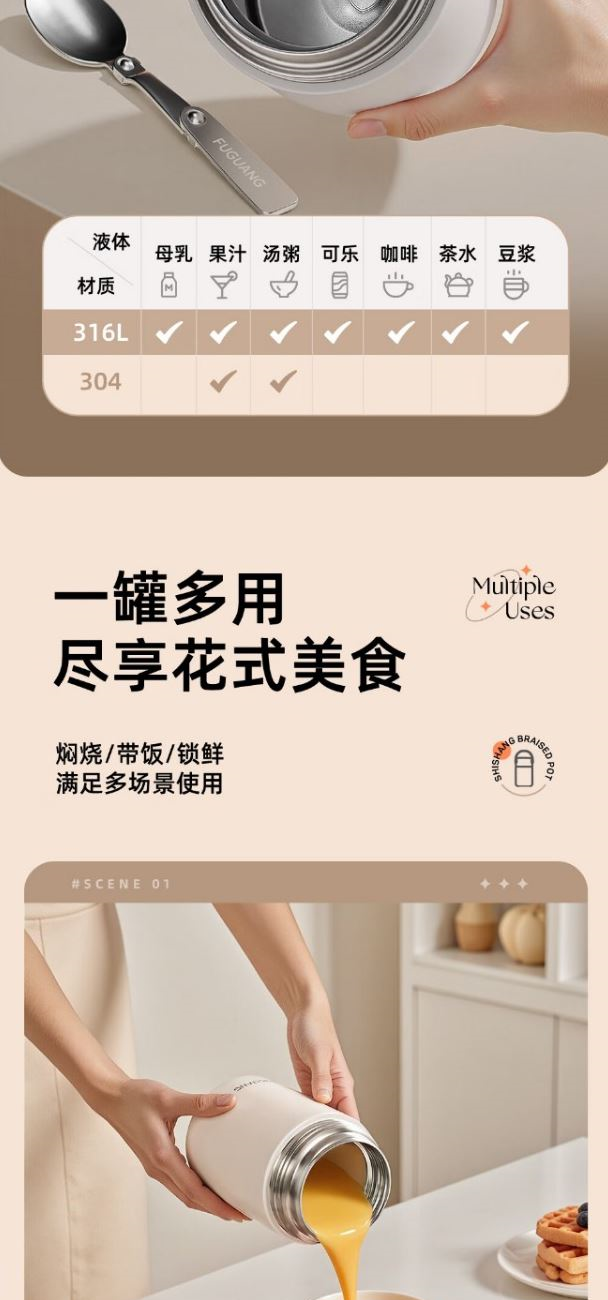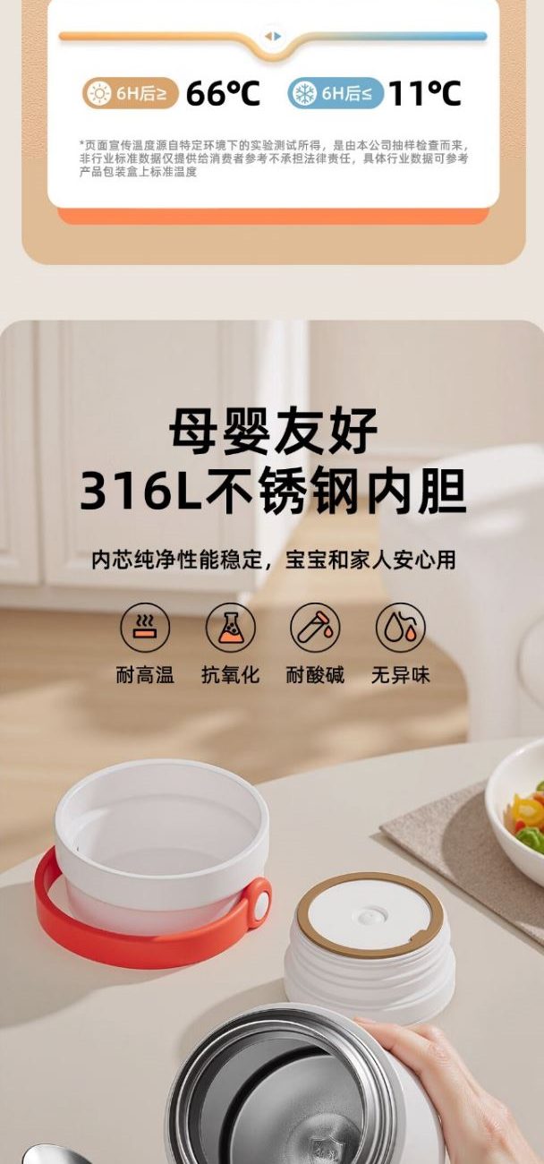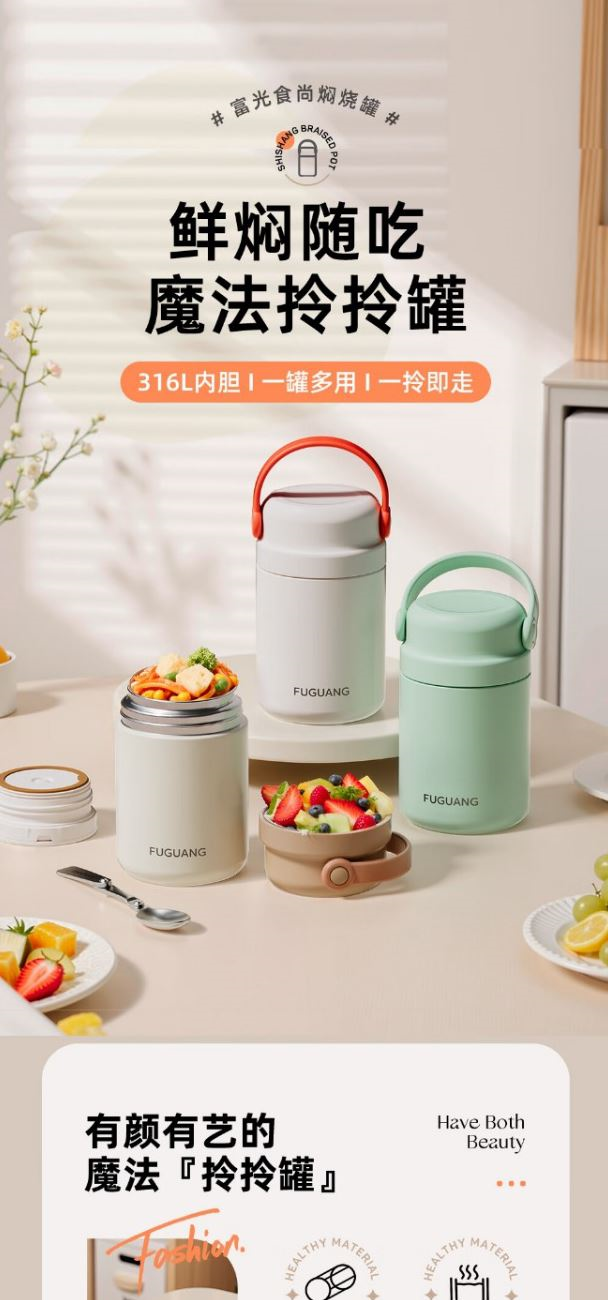 容量:1000ml 颜色:薄荷绿 奶油白 气质咖 尺寸:190*110直径*高 材质:316奥氏体不锈钢镜面处理内胆、无尾真空超长保温。 杯盖亦是分享碗,并独立餐勺。提环设计方便外出携带。 包装:单瓦盒
