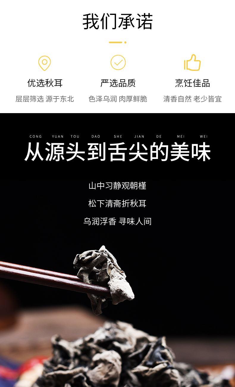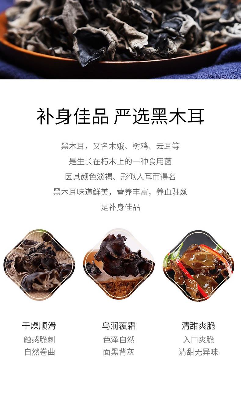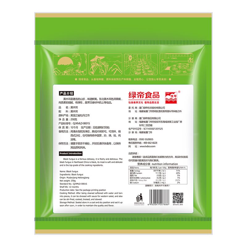 配料:黑木耳 原料产地:黑龙江牡丹江市 净含量:250克 保质期:12个月 生产日期:见包装物打印处 食用方法:用清水浸泡软洗净后,撕成片状即可。可凉拌、做西式沙拉,也可做传统菜,炒、烧、烩、炖、汤等。 黑木耳是山珍,味道鲜美。东北黑木耳色泽黑褐,肉质柔软细腻、有弹性,是烹饪食材中的上等佳品。