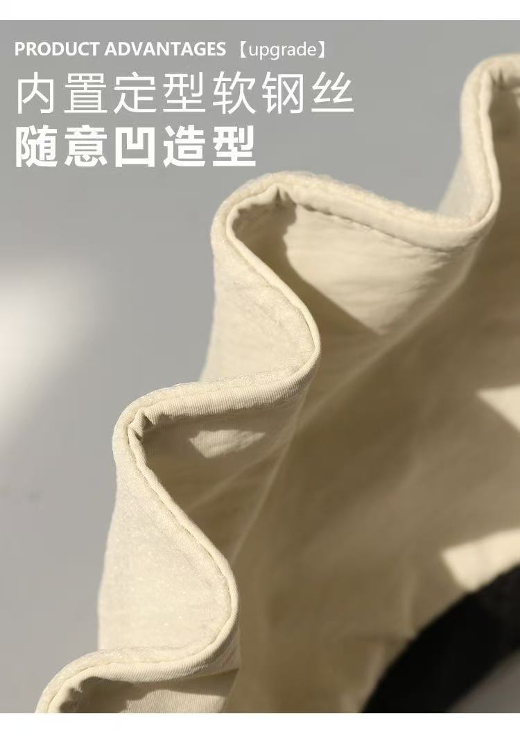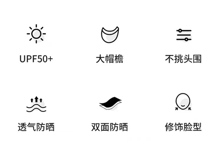 产品卖点: 1. UPF50+、紫外线阻隔率≥95% 2. 透明网纱裕丝滑面料的结合 增加凉爽感 3. 立体裁剪 轻松打造小V脸 4. 帽圈可塑双龙骨 支撑力更强 抗风不变形 5. 可折叠 收纳更便携 产品面料:聚酯纤维 产品尺寸:均码