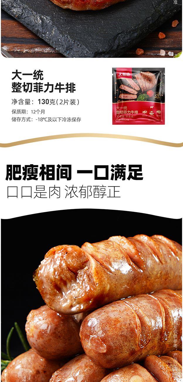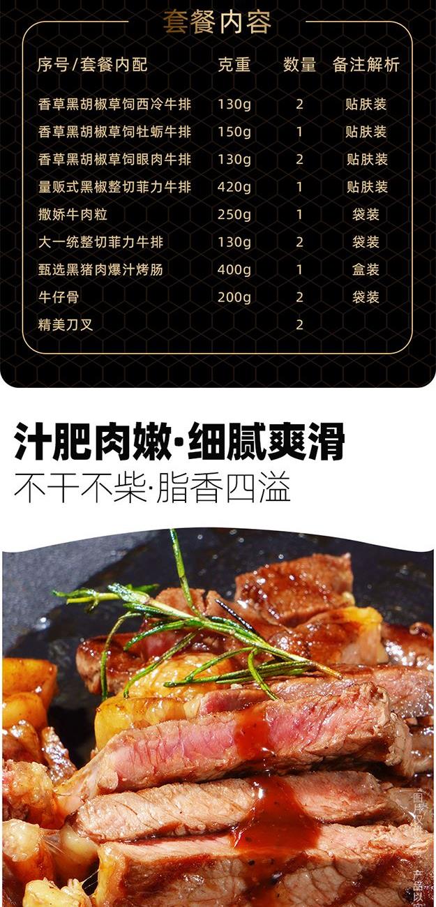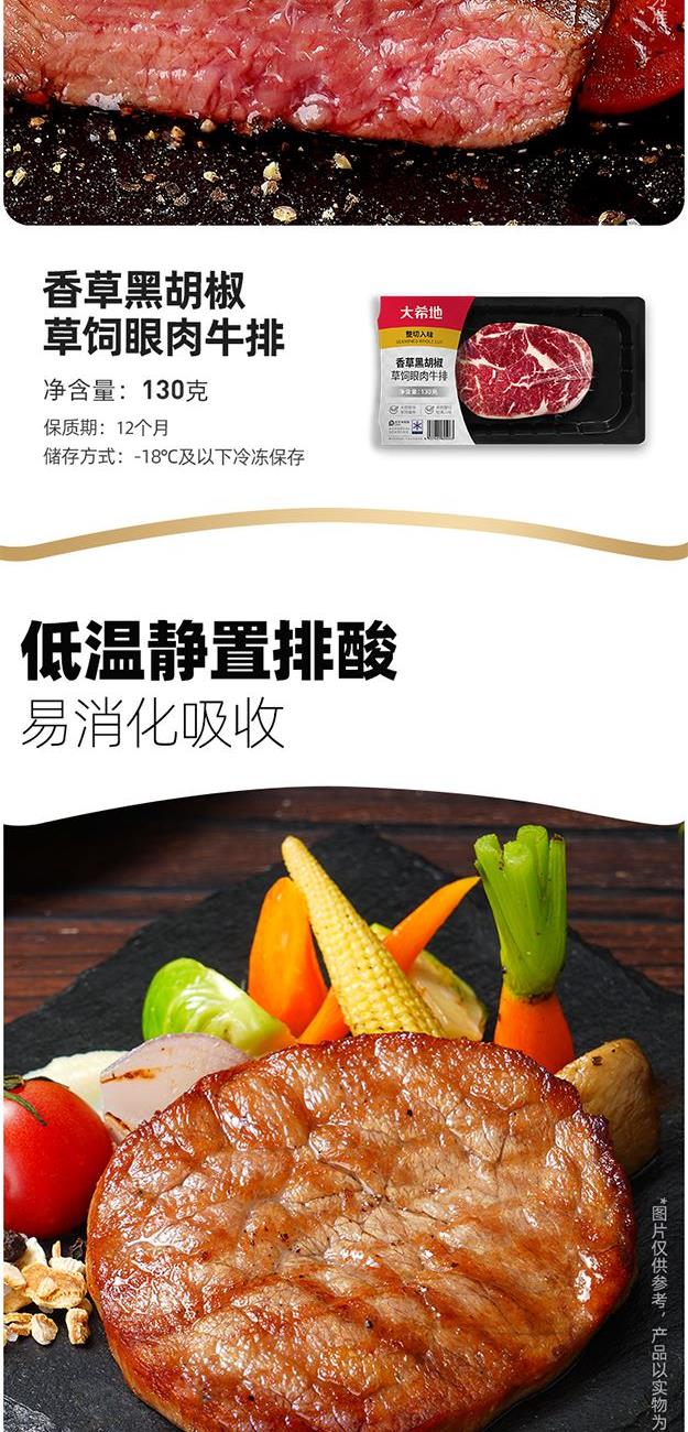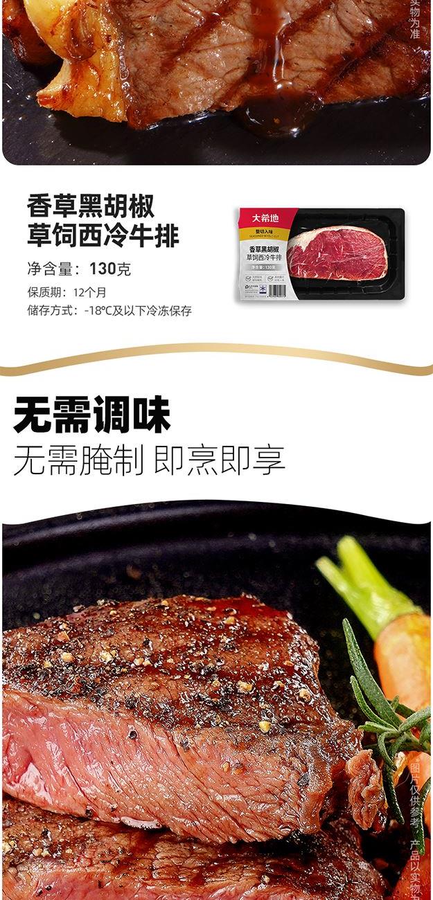 大希地 香草黑胡椒草饲西冷牛排130g*2 大希地 香草黑胡椒草饲牡蛎牛排150g*1 大希地 香草黑胡椒草饲眼肉牛排130g*2 大希地量贩式黑椒整切菲力牛排420g*1 大希地 撒娇牛肉粒250g*1 大一统整切菲力牛排130g*2 大希地甄选黑猪肉爆汁烤肠400g*1 大希地牛仔骨200g*2 精美刀叉一副 精美刀叉一副