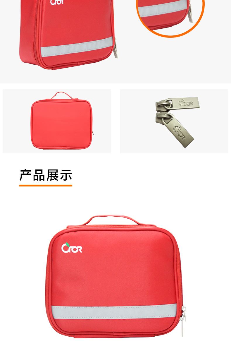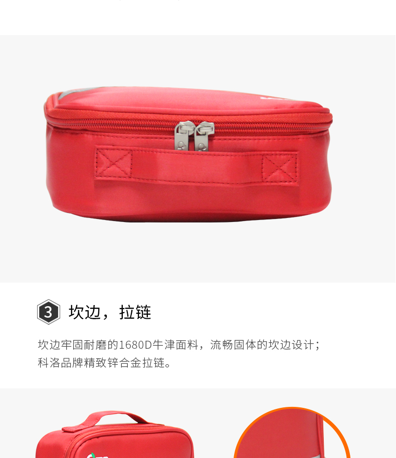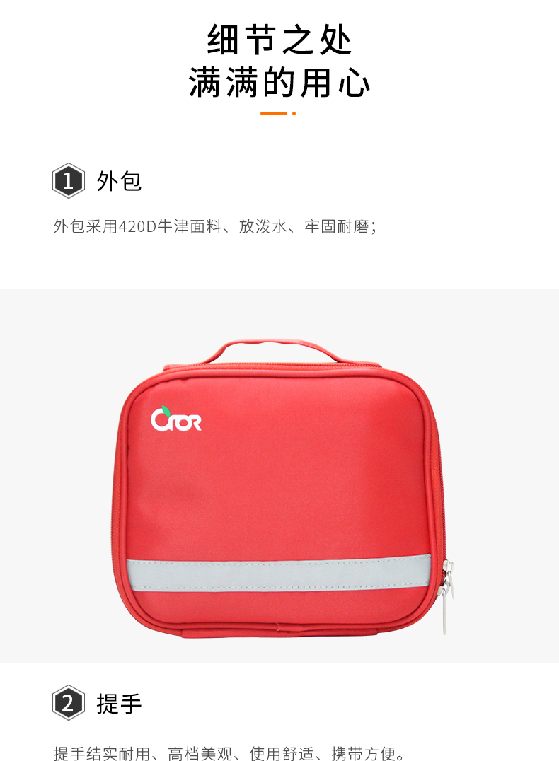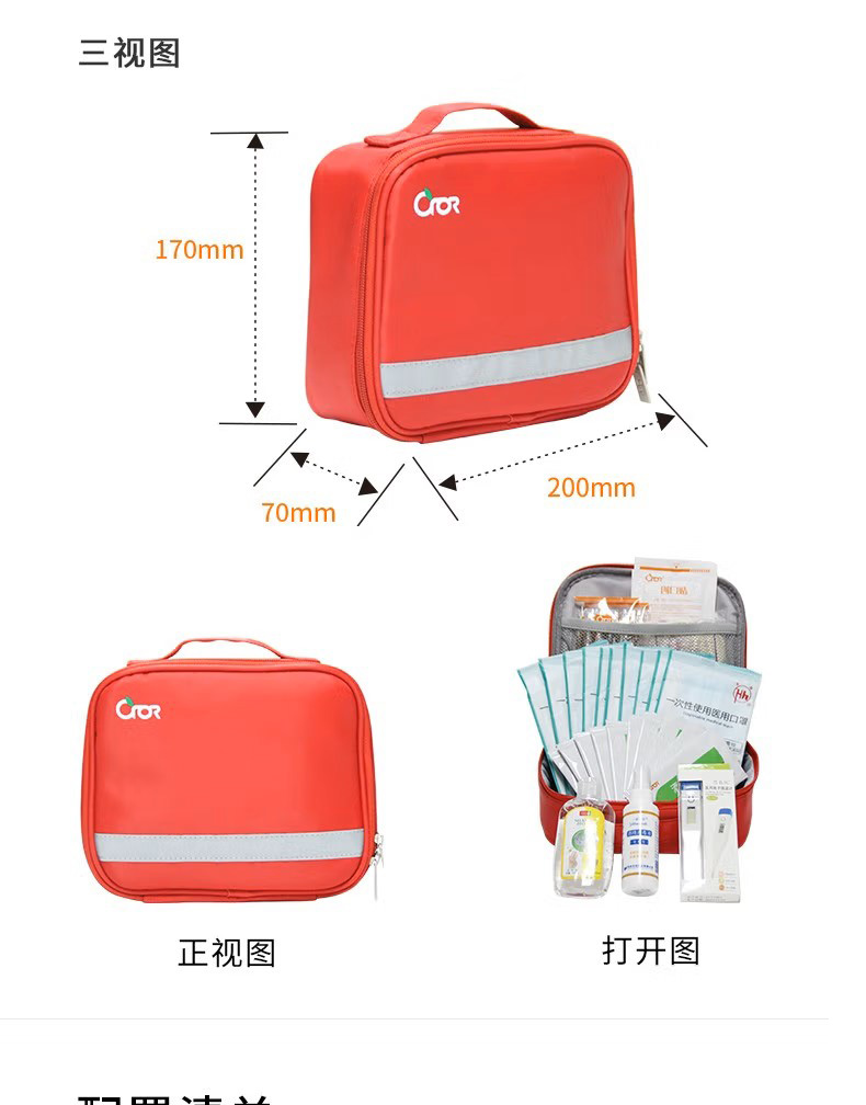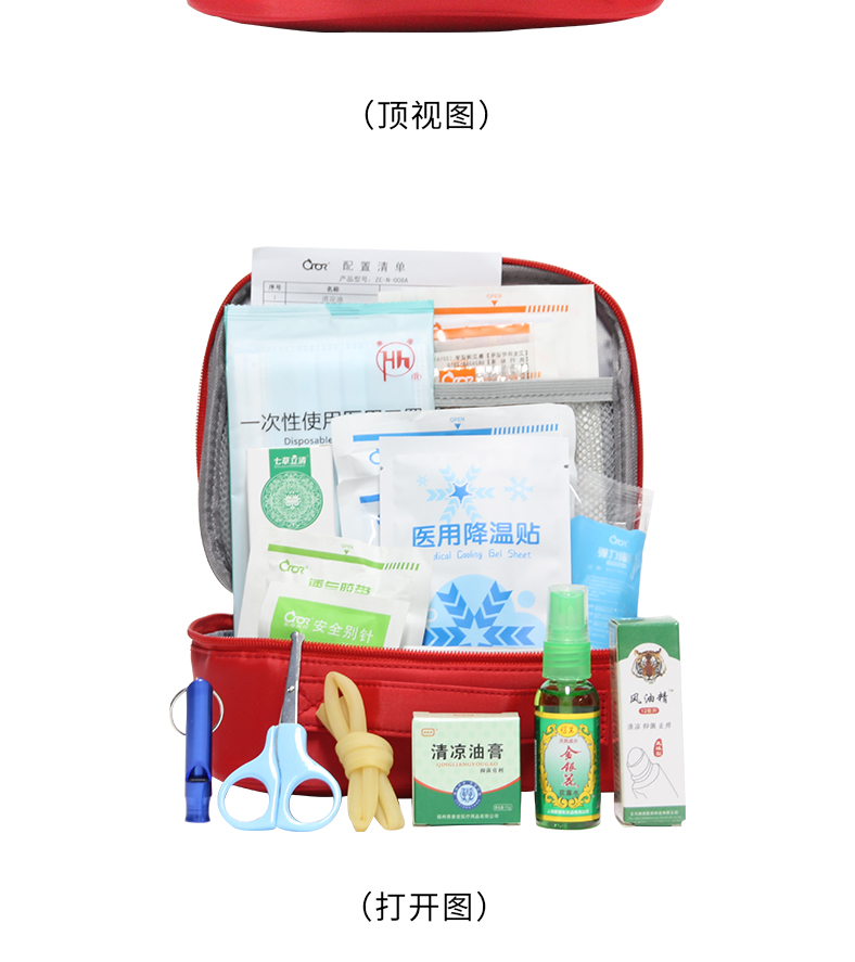 产品材质:190D发泡尼龙 产品规格:200*170*70mm 产品颜色:红色 产品配置: 含6大类24种急救用品