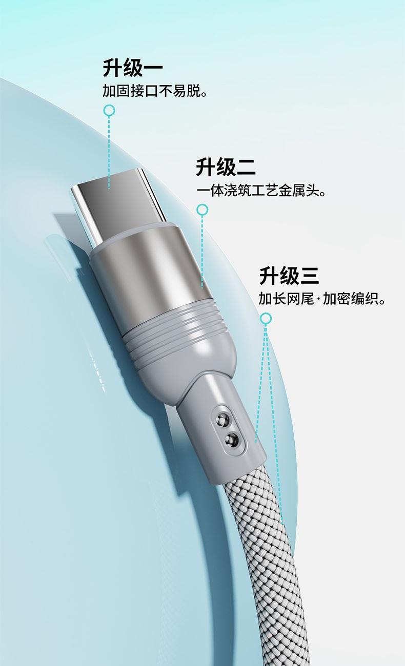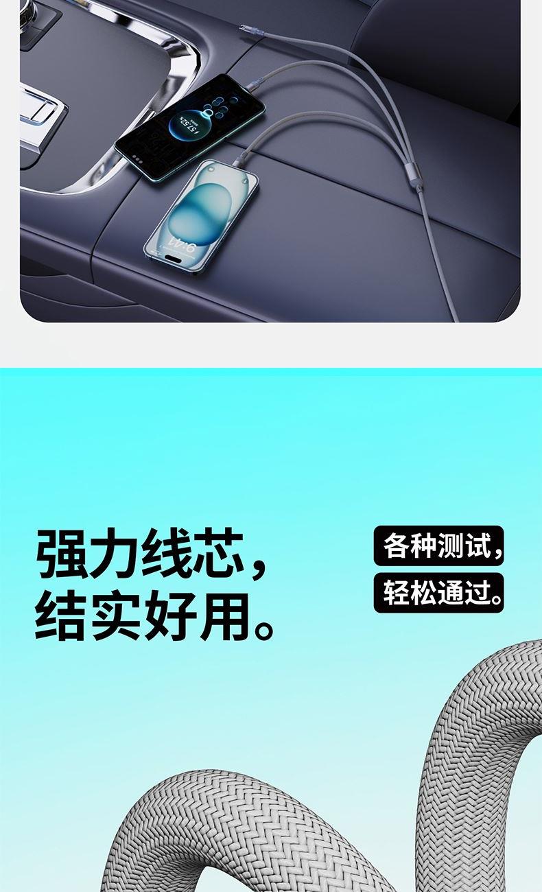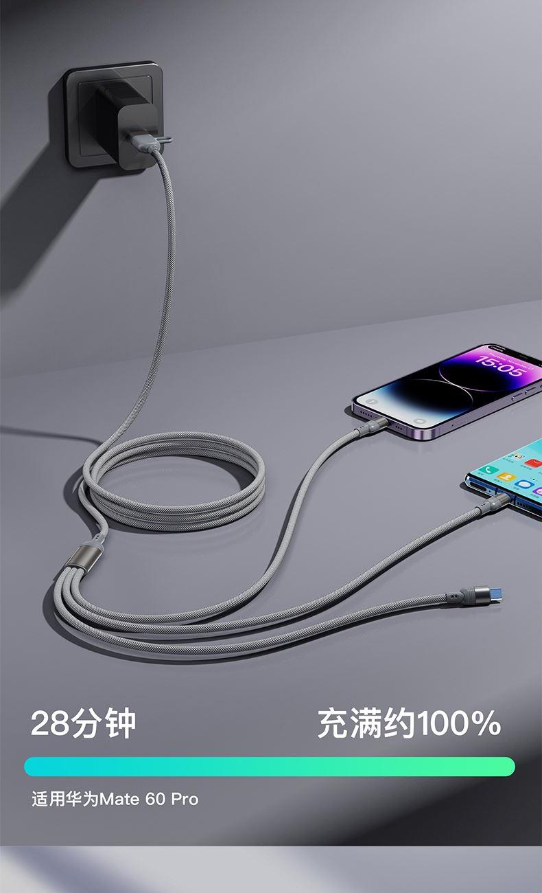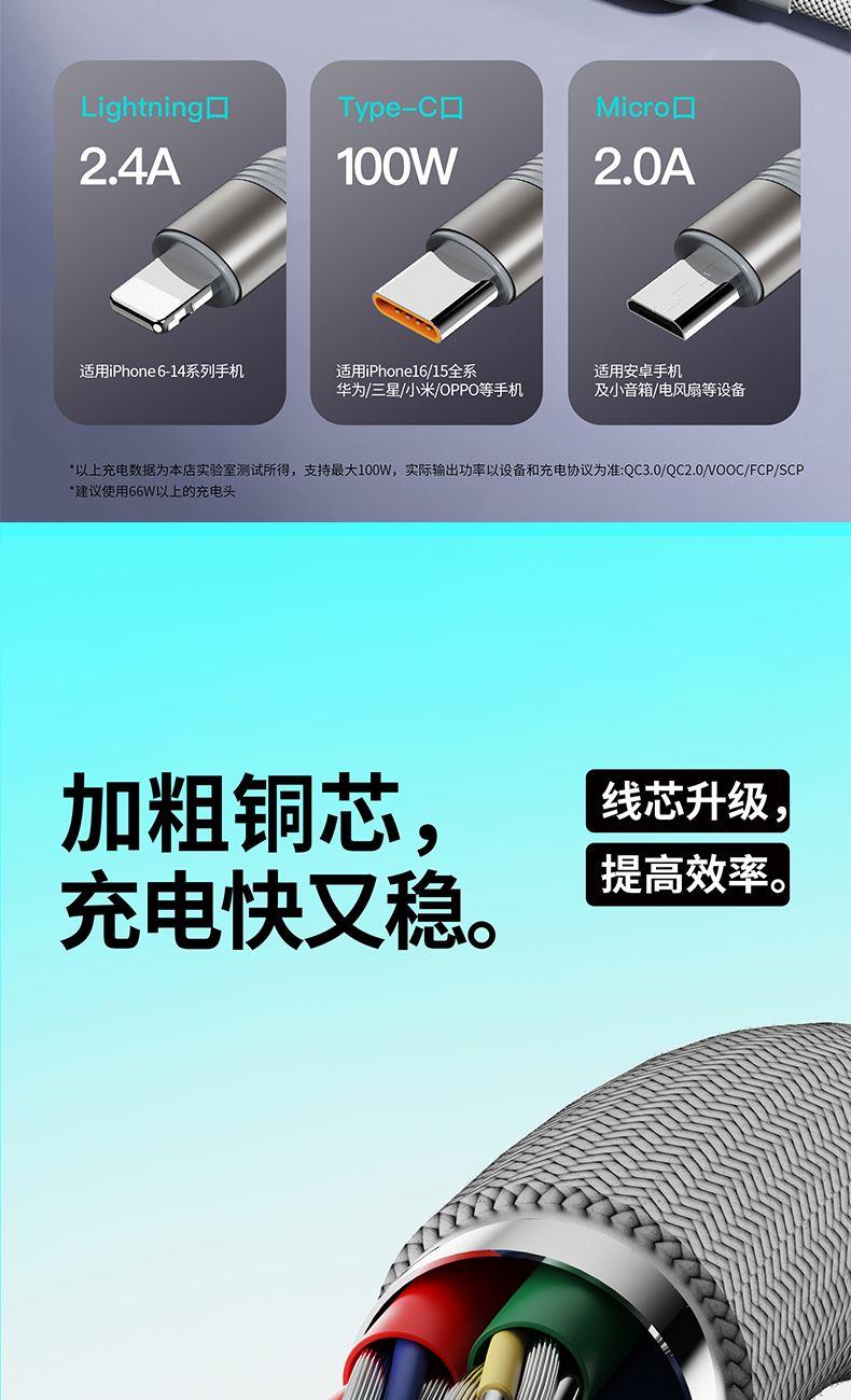 ● 不挑设备的100W三合一金属线 ● 粗铜芯充电快又稳 ● 能芯片护机周全