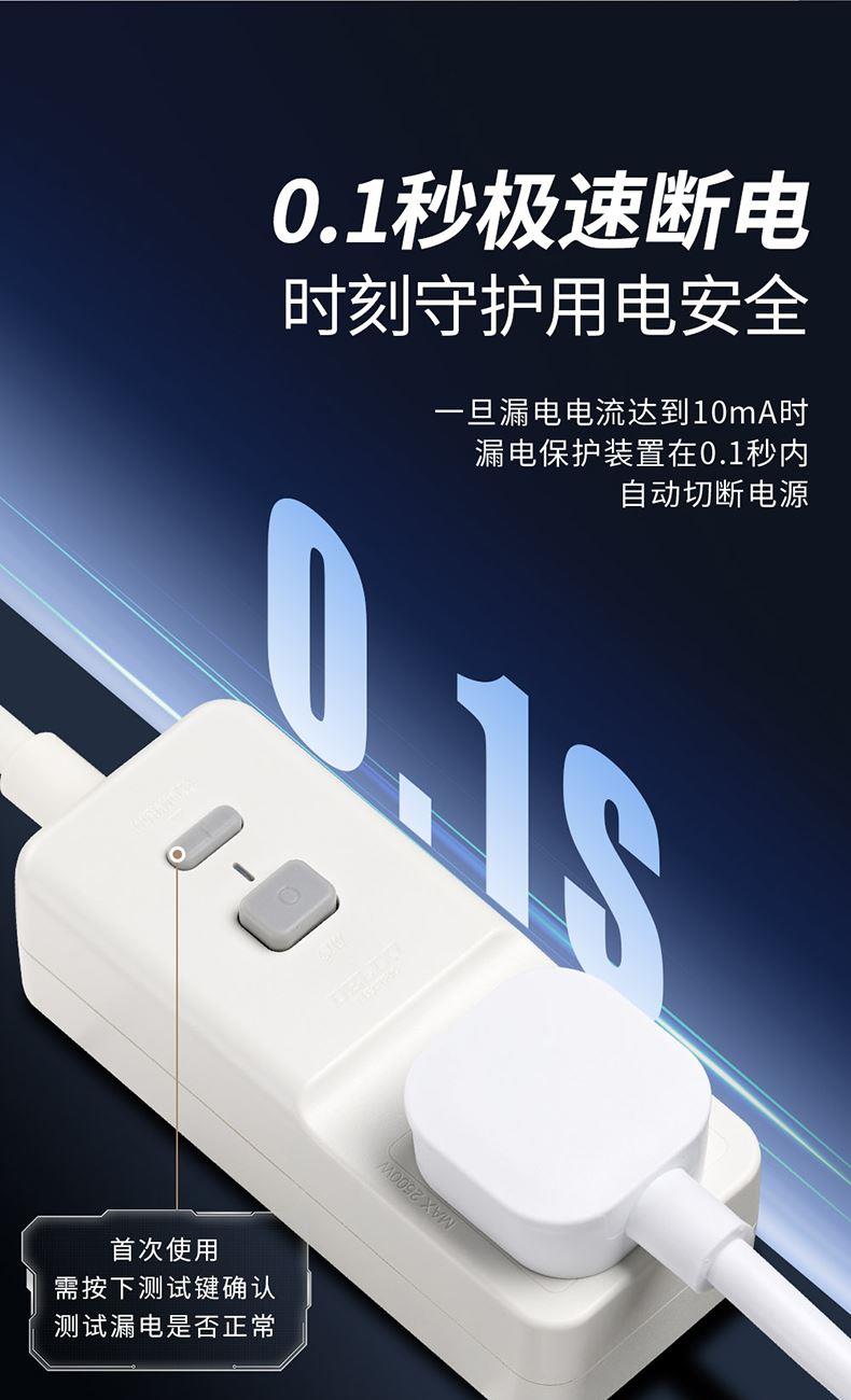 德力西电气柔性漏电保护插座 一位五孔 10A 产品型号:DE-LBZS 额定电流:10A 额定功率:2500W 额定电压:250V 额定频率:50HZ 额定剩余动作电流:10mA 剩余动作电流时间:0.1S 工作温度范围:-5℃~40℃ 插座尺寸:44*107*32/29 产品线长:30mm 执行标准:GB/T 20044