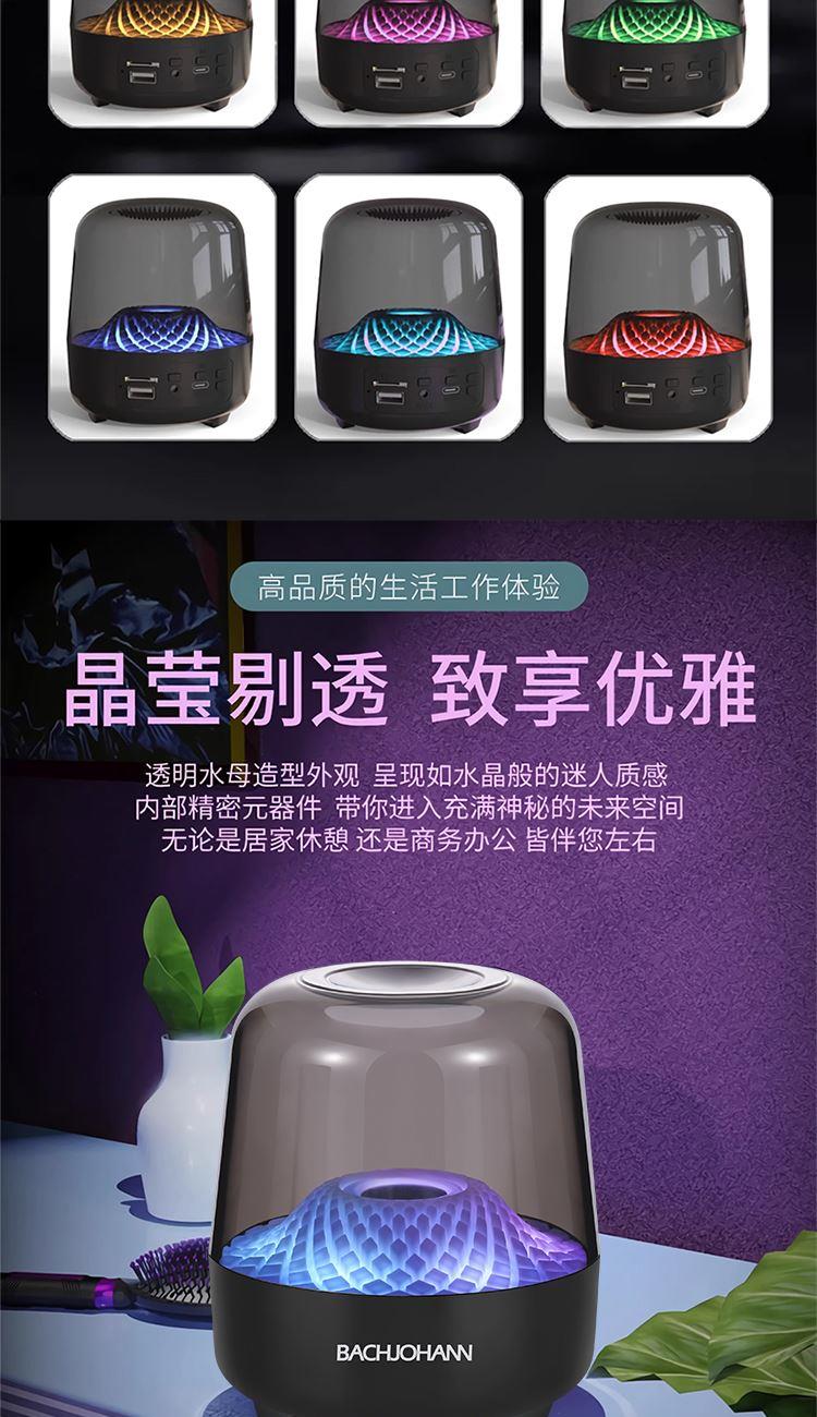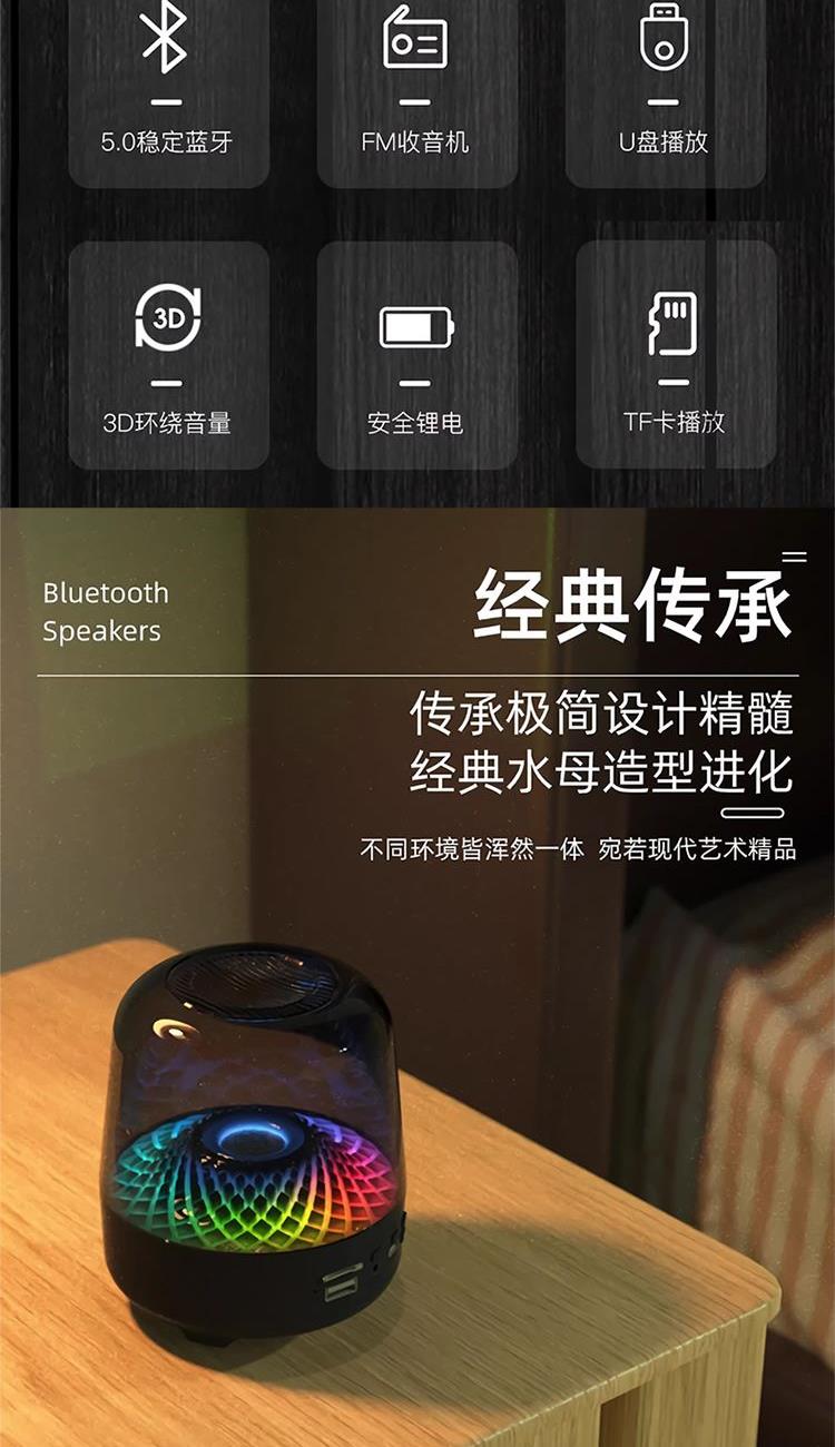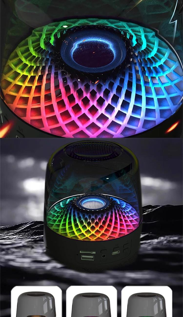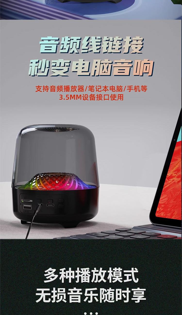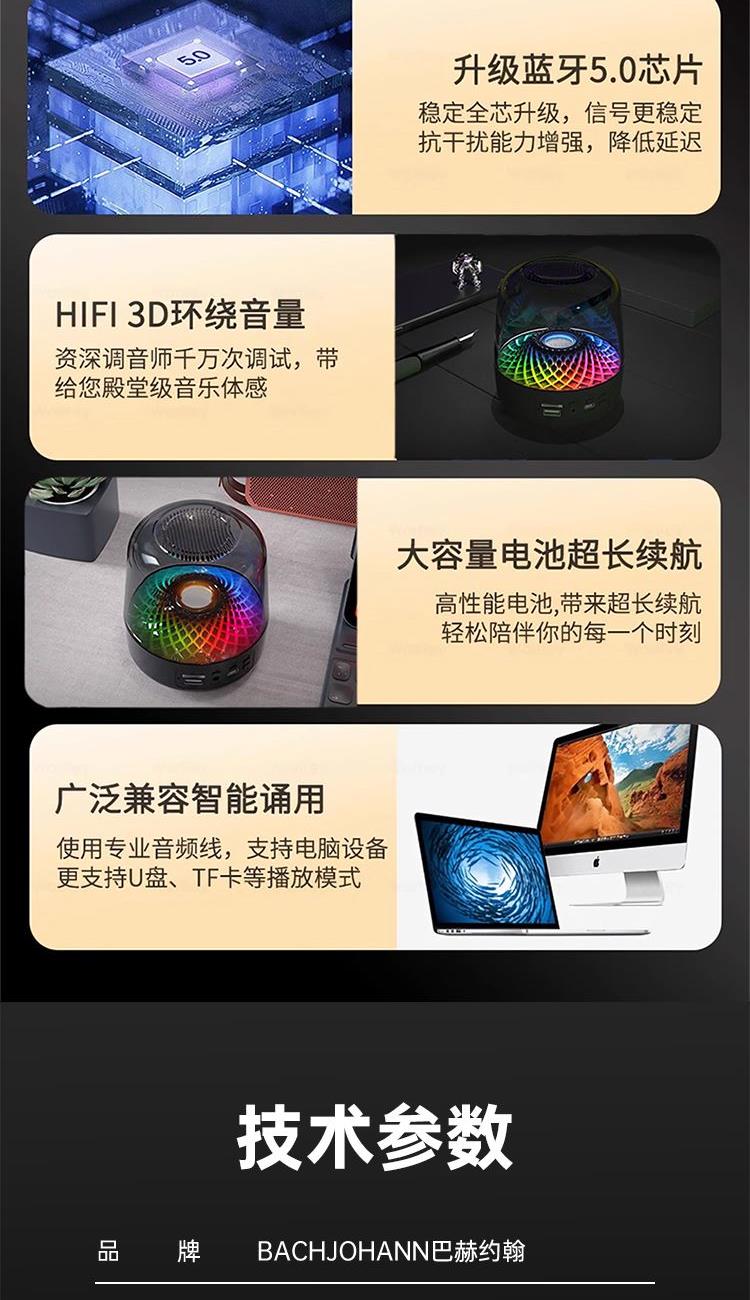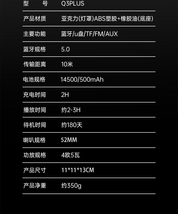 技术参数 型号:Q3PLUS 产品材质:亚克力(灯罩)ABS塑胶+橡胶油底座 主要功能:蓝牙,U盘,TF,FM,AUX 蓝牙规格:Bluetooth5.0 传输距离:约10M 电池规格:14500/500mAh 充电时间:约2H 播放时间:约2-3H(50%音量) 待机时间:约180天 喇叭规格:52MM 功放规格:4欧5瓦 产品尺寸:11*11*13CM 产品净重:约350g 功能特点 ◆高分辨率360LED,光效随着音乐律动且变幻无穷 ◆稳定全芯升级,信号更稳定,抗干扰能力增强,降低延迟 ◆使用专业音频线,支持电脑设备,更支持U盘、TF卡等播放模式 ◆高性能电池,带来超长续航,轻松陪伴您的每一个时刻