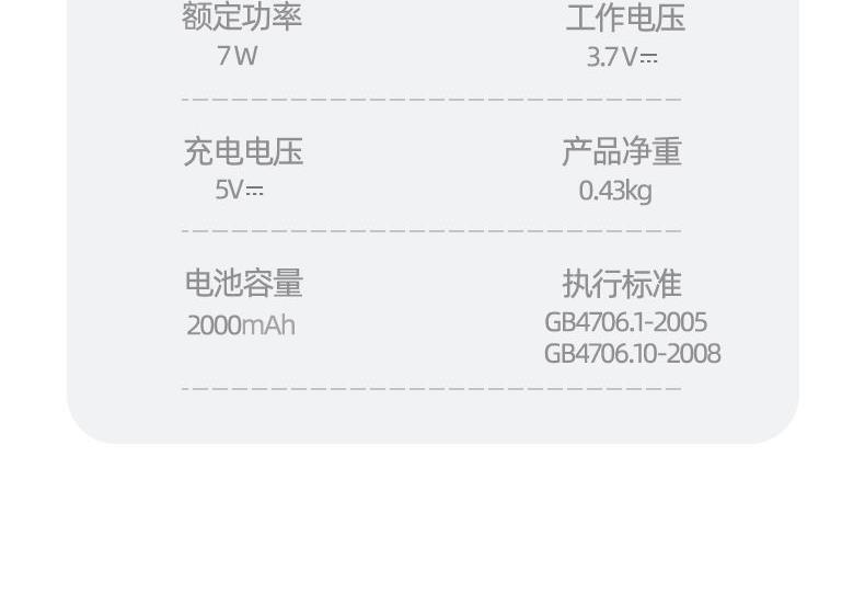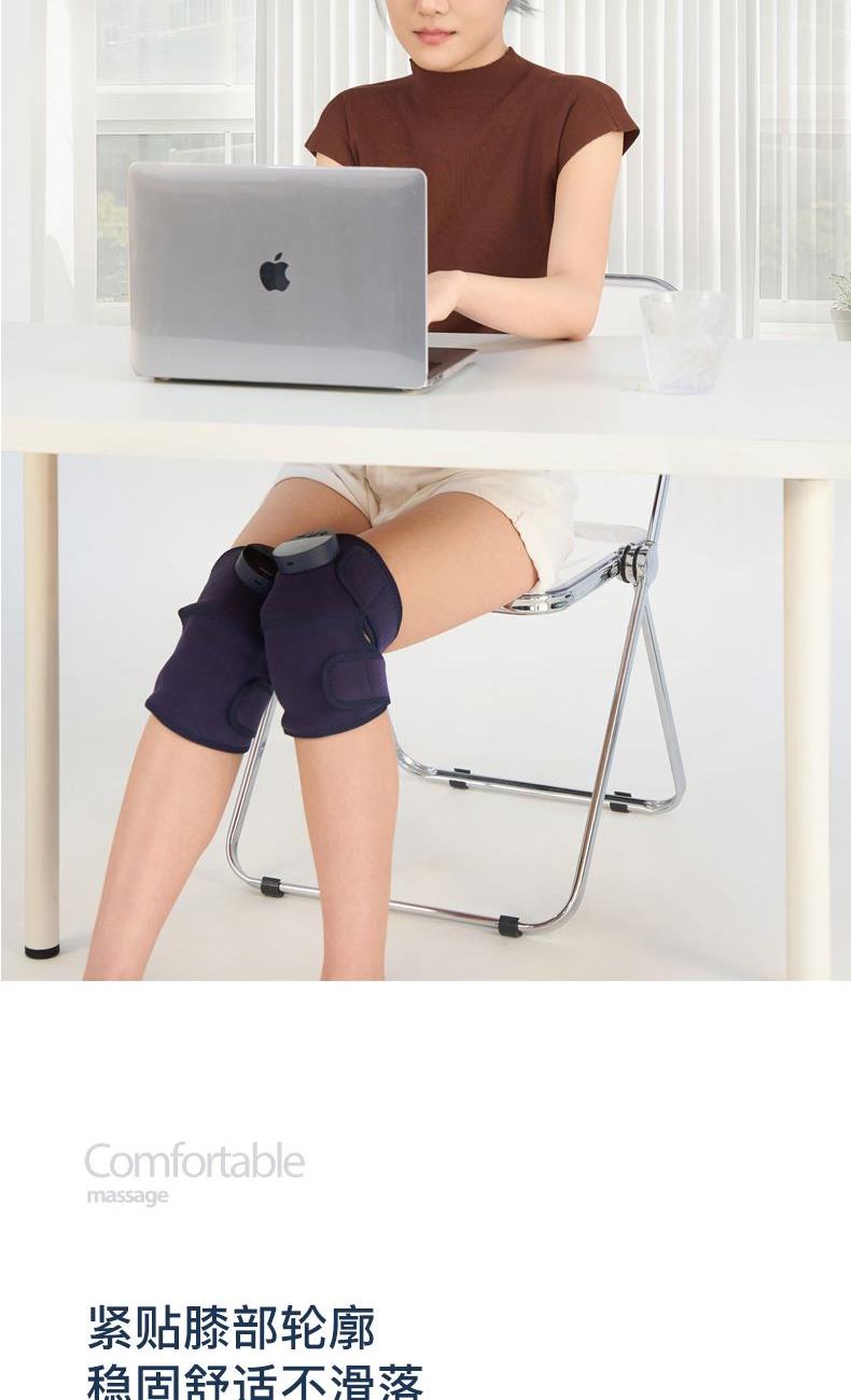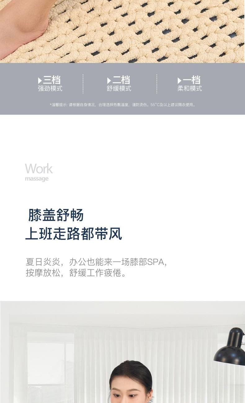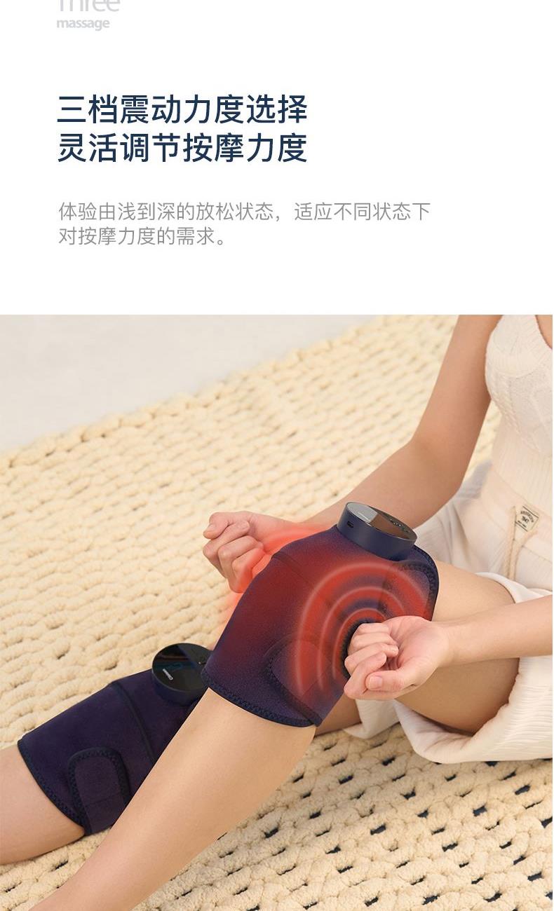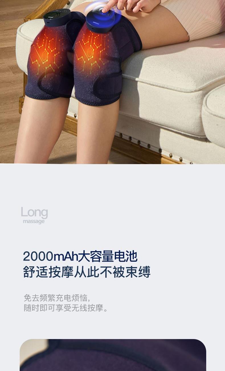 工作电压:3.7V 充电电压:5V 额定功率:7W 电池:2000mAh 产品尺寸:530*248*28(mm) 包装尺寸:315*174*70(mm) 产品毛重:0.6kg 包装清单:按摩仪X2、充电线x1、说明书x1 核心卖点: 1. 三档力度选择 ,灵活调节震动力度 2、紧贴膝部轮廓,稳固舒适不滑落 3、五档温控,科学调节,升级加大热敷面积 4、轻松承包膝/肩/肘按摩,15分钟智能定时