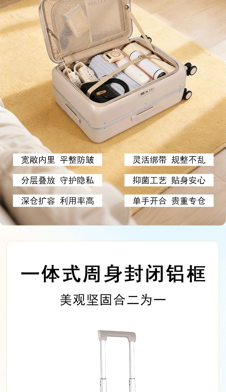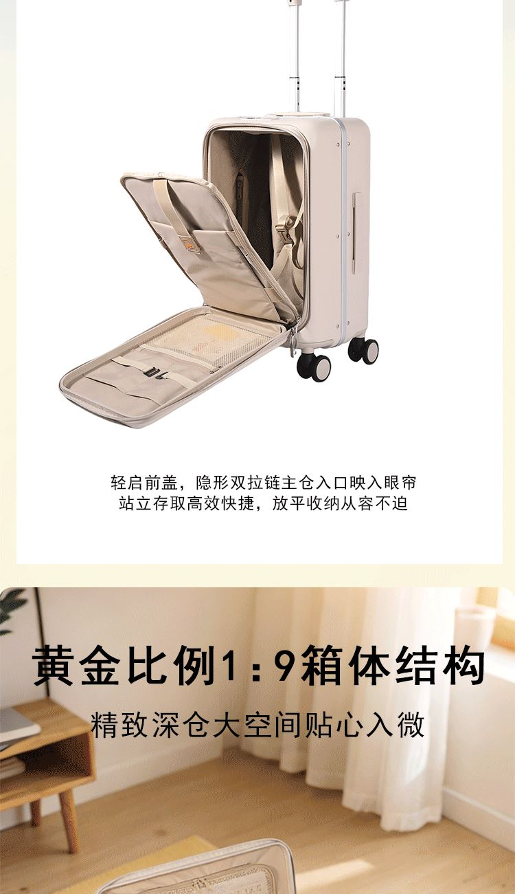 1、极简美学圆润设计,轮廓精致典雅靓丽 2、纯然同配色哑光工艺,自带轻奢质感 3、前置电脑快捷仓,随取随用从容办公快速安检 4、黄金1:9比例布局,科学释放近 99% 储物空间 5、浑然一体大深仓,多层分类归置尽享温度与安心 6、多处创新工艺暗藏巧思,贴心诠释移动出行助理