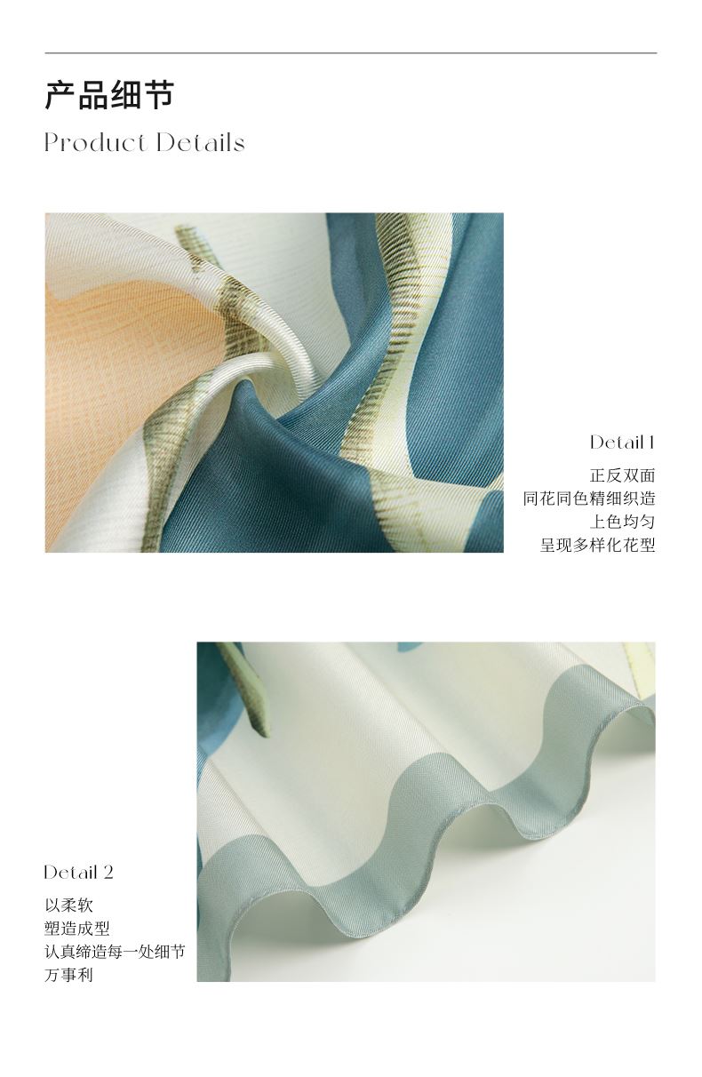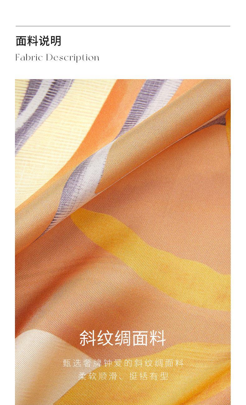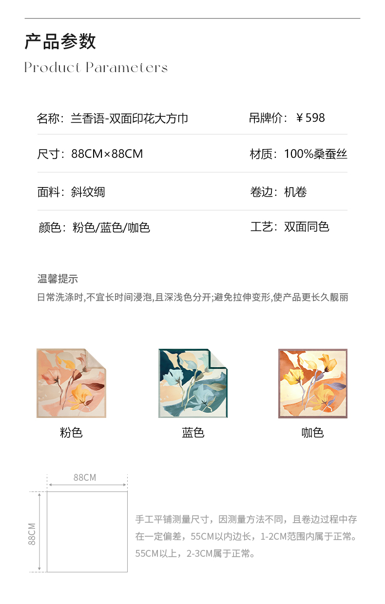 尺寸:88CM×88CM 材质:100桑蚕丝 面料:斜纹绸 卷边:机卷 颜色:粉色/蓝色/咖色 工艺:双面同色