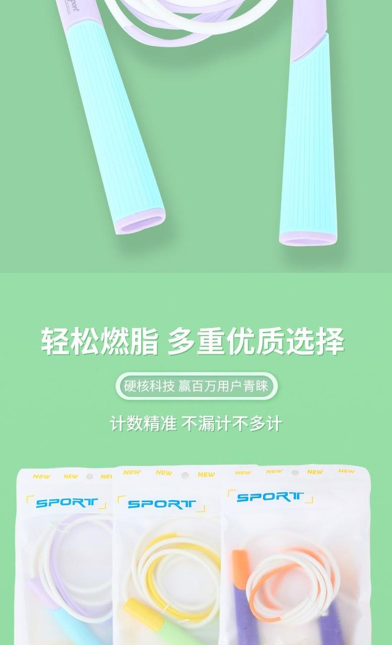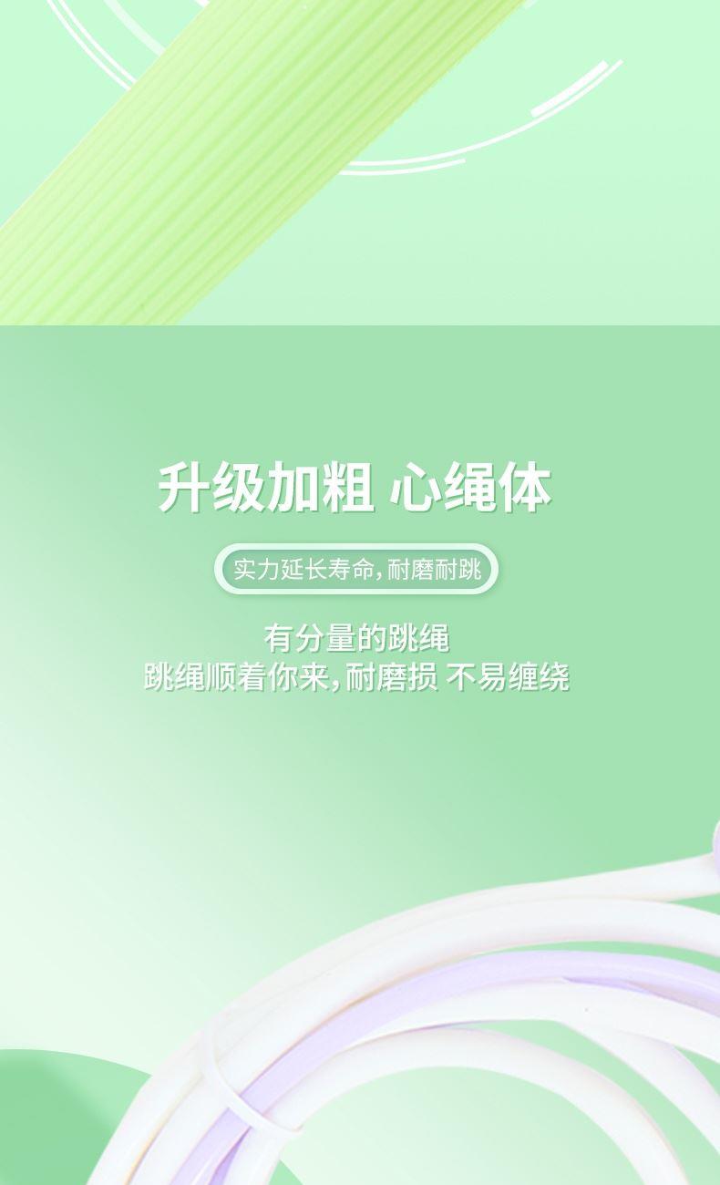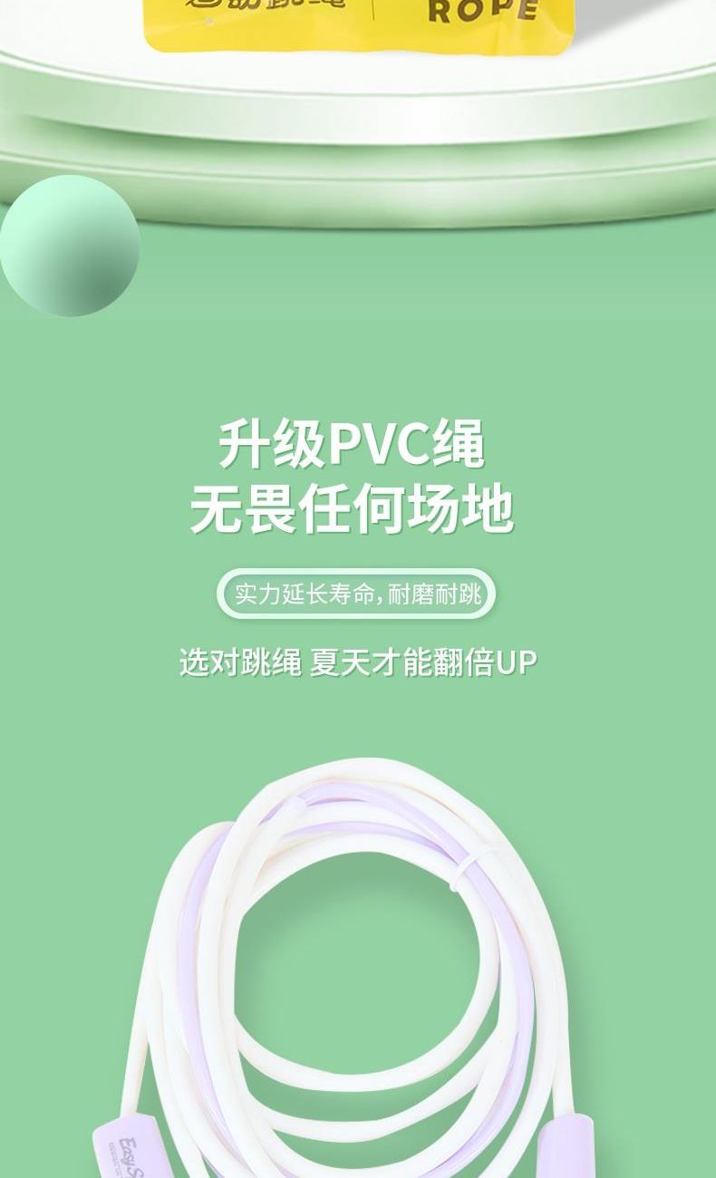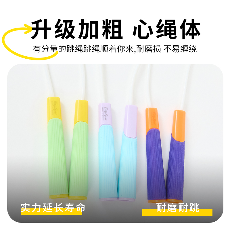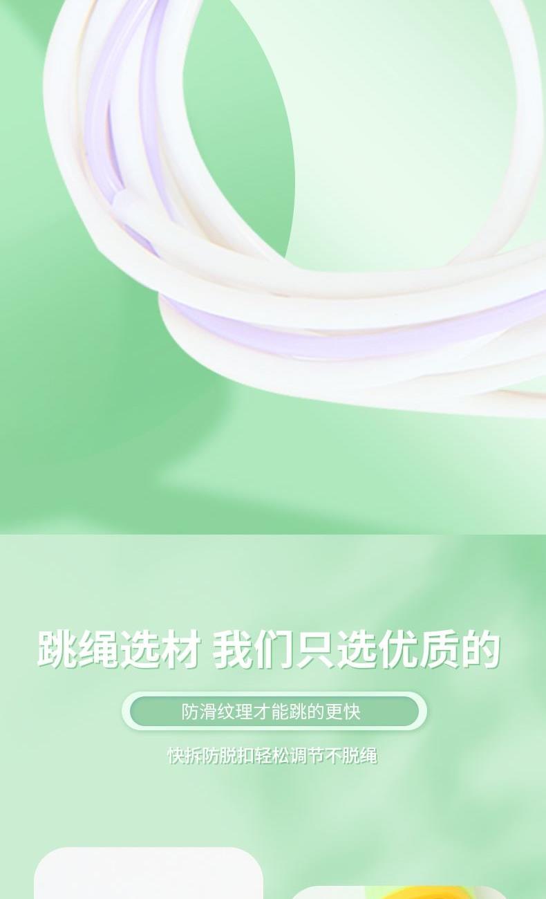 产品介绍: 专为儿童设计,跳绳不缠绕,不打结,特别适合小学生学习跳绳 硅胶手柄设计,有效防滑,整体轻变设计,可大幅提升每分钟的跳绳数量 双色撞色设计,深受小朋友喜爱 产品规格: 手柄125*18mm 绳长约2.6米 重量:0.12KG 材质:硅胶/ABS/PVC