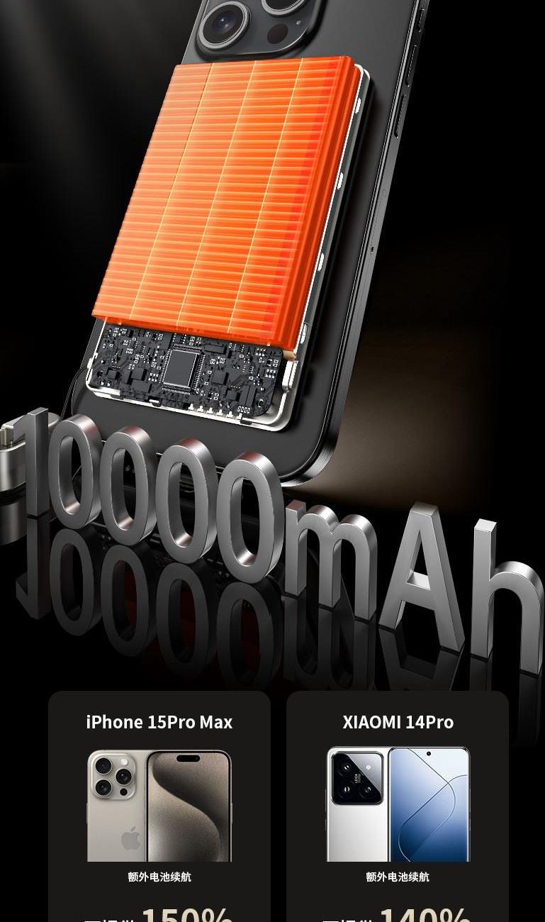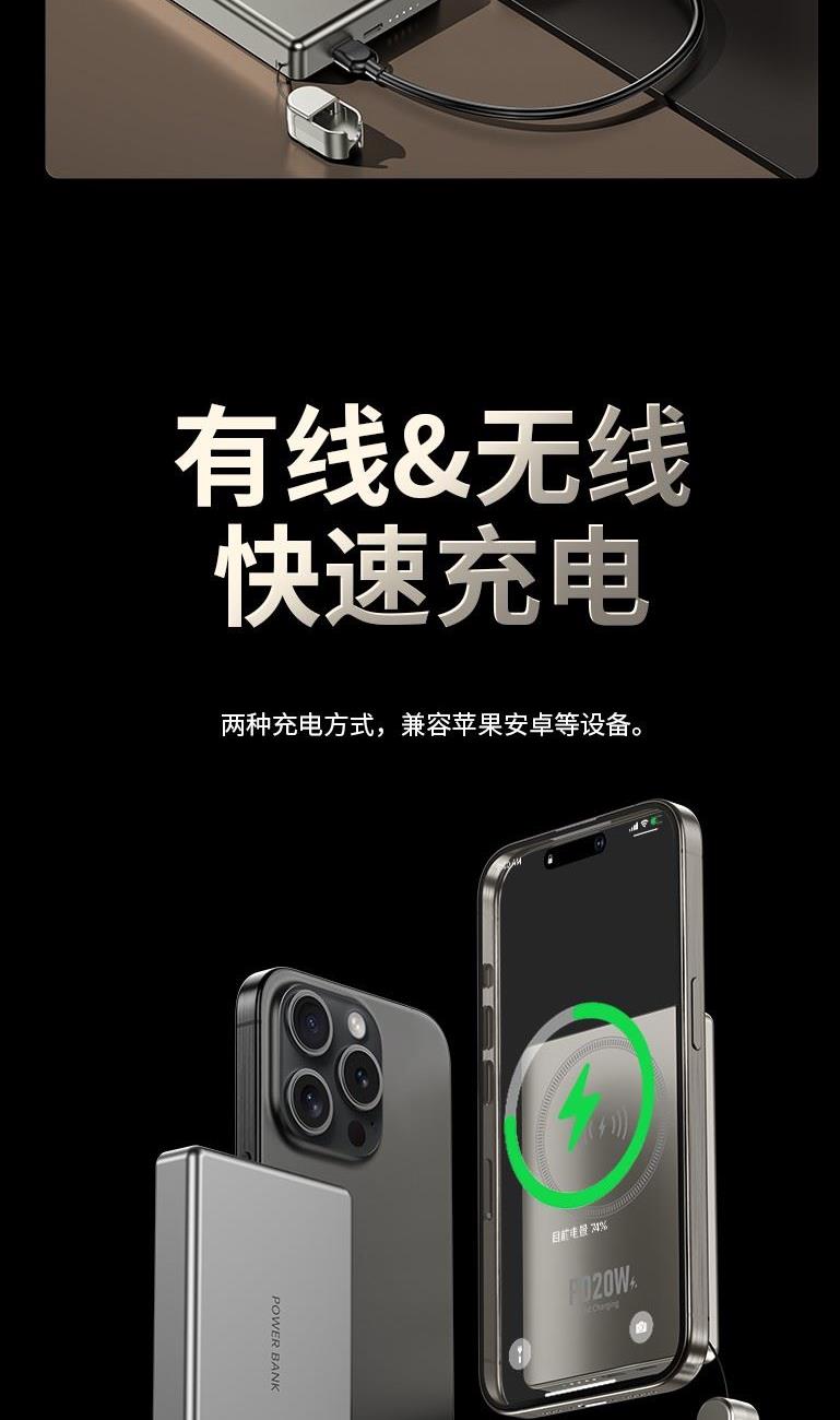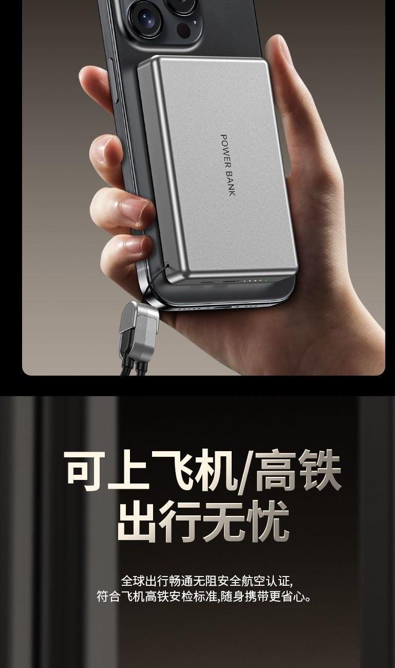 10000毫安22.5W双向超级快充 15W超强磁吸无线充电 铝合金超薄机身 3C认证,自带双向快充数据线 符合民航局标准,可随身携带