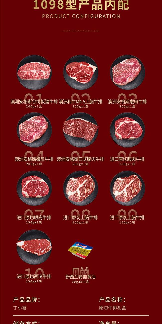 澳洲安格斯谷饲板腱牛排200gx1盒 澳洲和牛M4-5上脑牛排200gx1盒 澳洲安格斯嫩肩牛排200gx1盒 澳洲安格斯嫩肩牛排200gx1盒 澳洲安格斯日式腹肉牛排200gx1盒 进口原切眼肉牛排150gx1袋 进口原切眼肉牛排150gx1袋 进口原切上脑牛排150gx1袋 进口原切上脑牛排150gx1袋 进口原切西冷牛排150gx1袋 赠:新西兰安佳黄油10gx8小盒 包装(泡沫箱+礼盒)