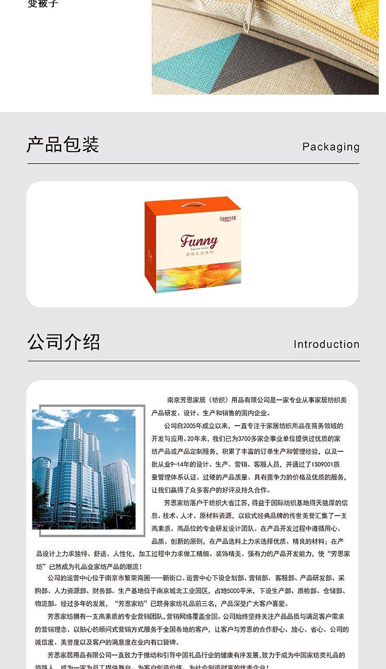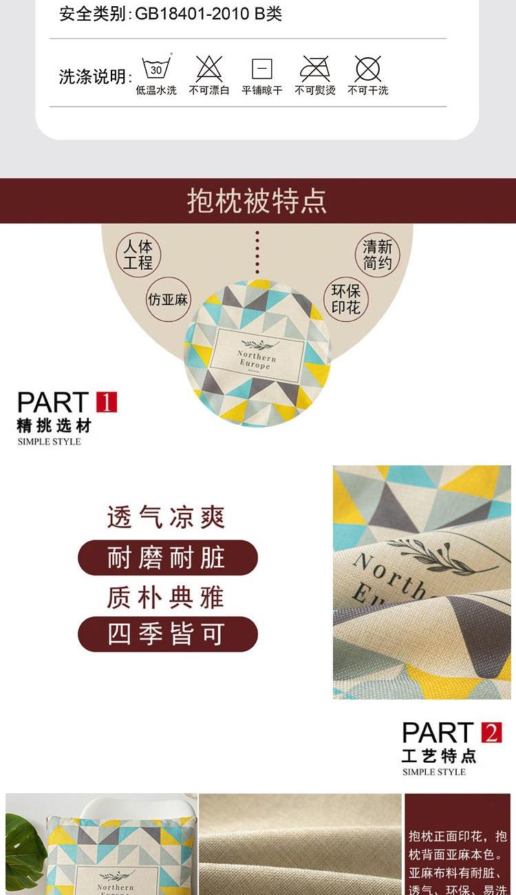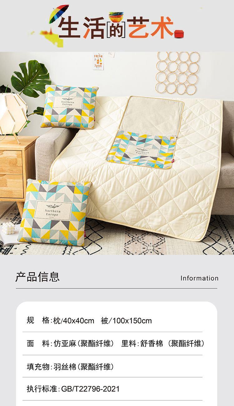 枕:40×40cm 被:100×150cm 【面 料】仿亚麻(聚酯纤维) 【里 料】舒香棉(聚酯纤维) 【填充物】羽丝棉(聚酯纤维) 1.枕面使用仿亚麻面料,手感细密有质感;被面使用舒香棉面料,柔软亲肤,透气性能强; 2.进口定位数码印花工艺,色彩鲜亮,不易褪色; 3.一物多用,可盖,可靠,方便携带; 4.可整版定制客户专属花型;