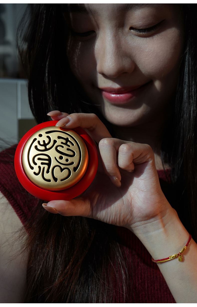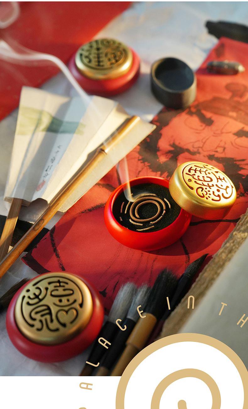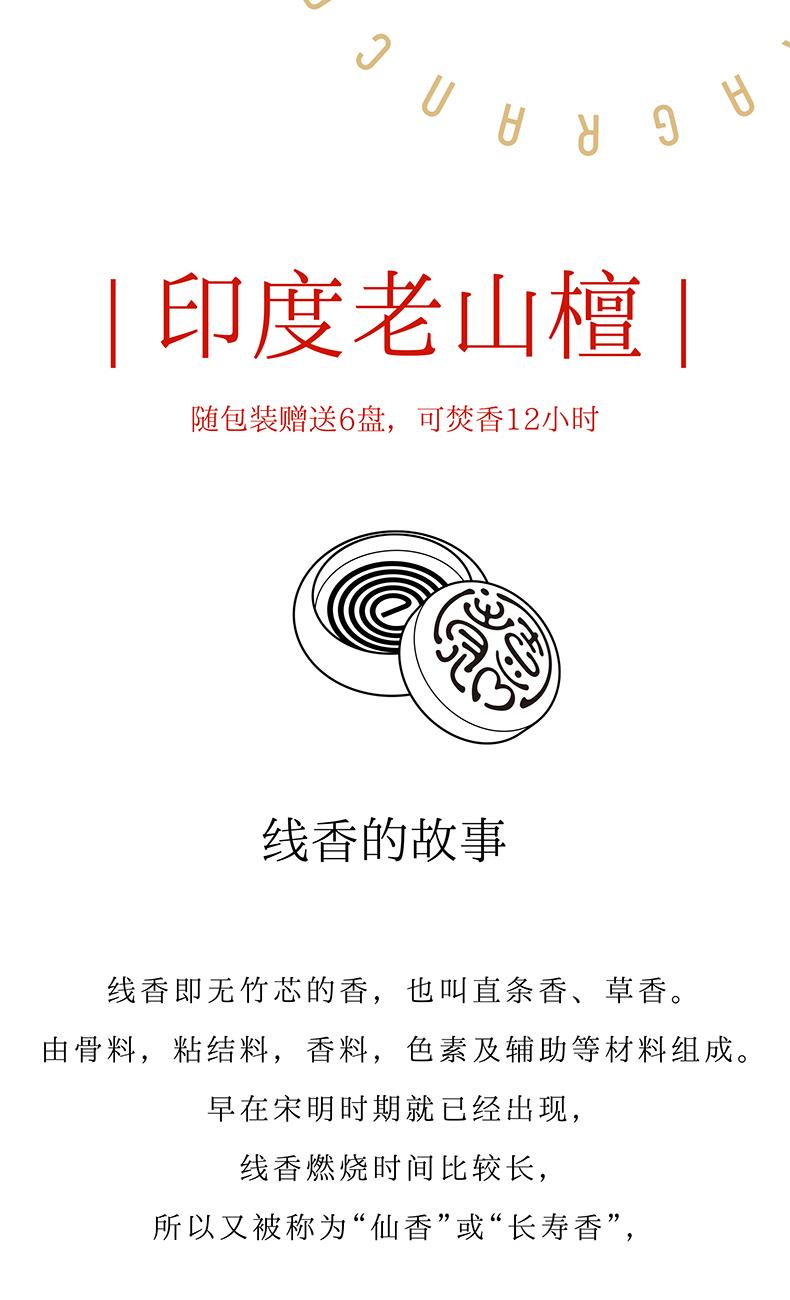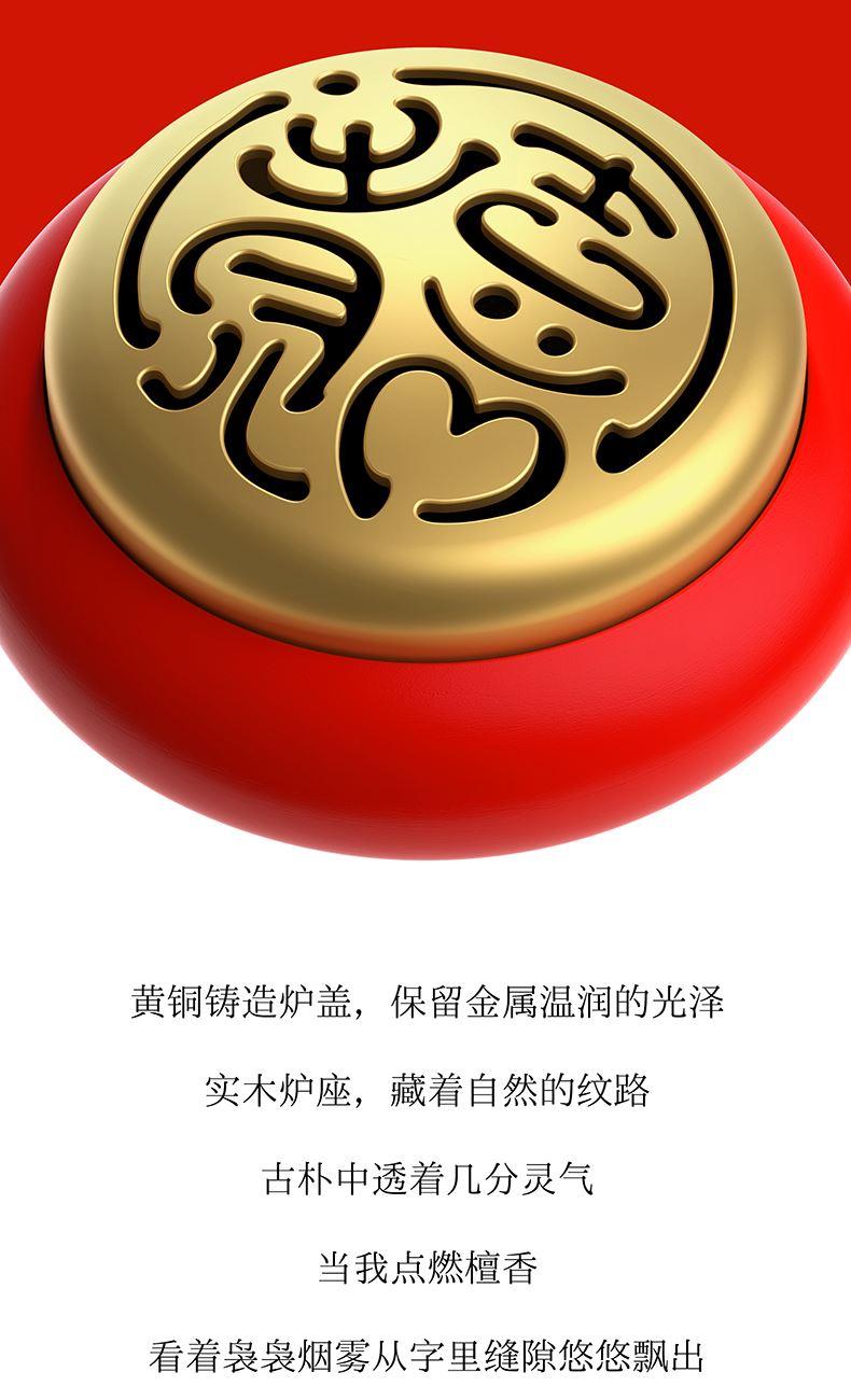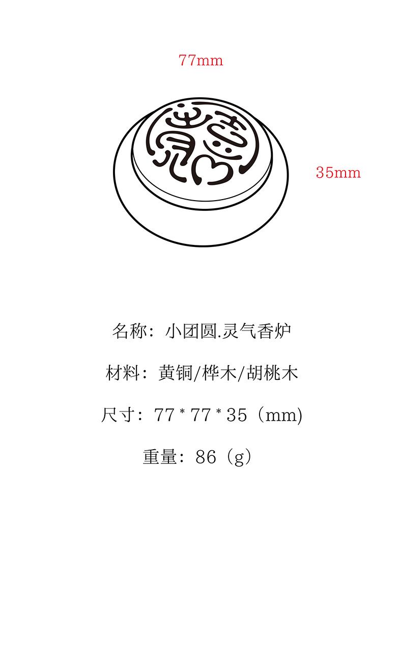 产品材质:黄铜+实木 产品尺寸:77*35MM 包装尺寸: 110*110*110mm 产品重量:86G 产品功能:香氛&盘香 使用时间:1卷/2小时 产品香型:印度老山檀 适用场景:居家、办公、酒店 产品特点:即是一个香氛,也是一个景观摆件,安神定心、喜庆、蕴意好