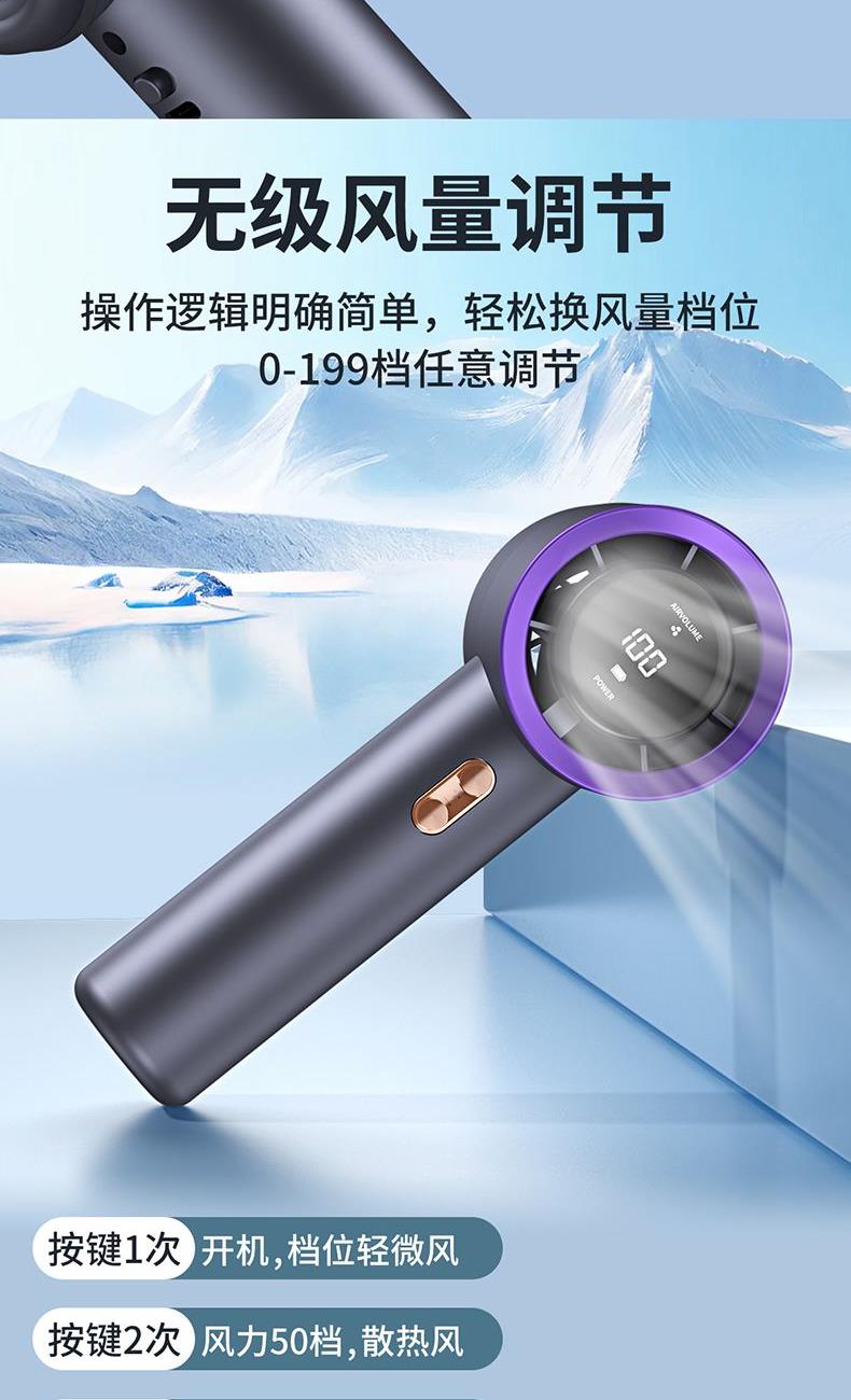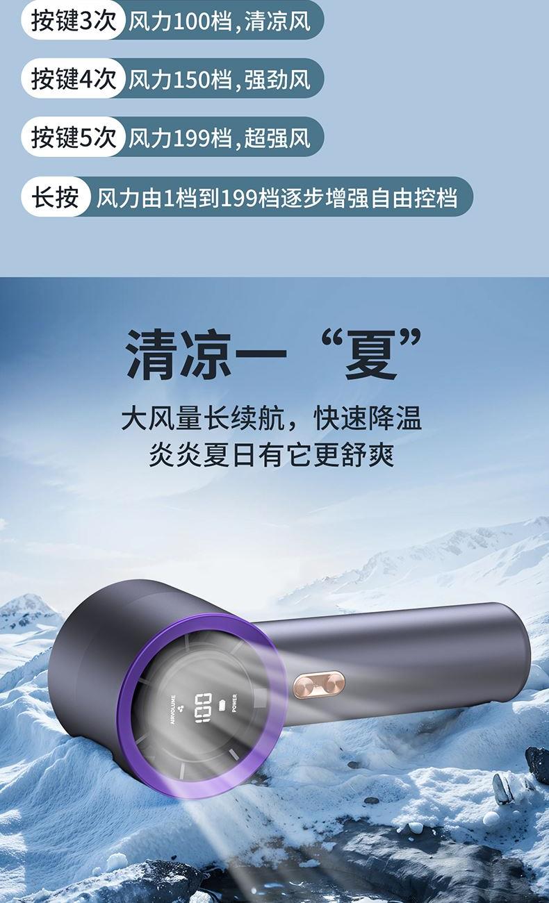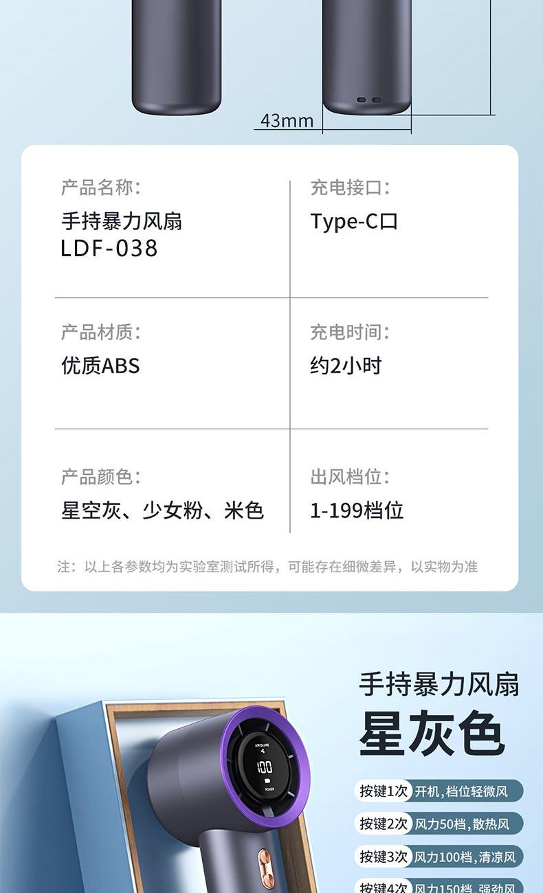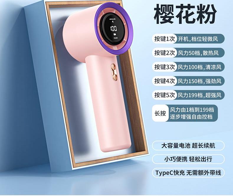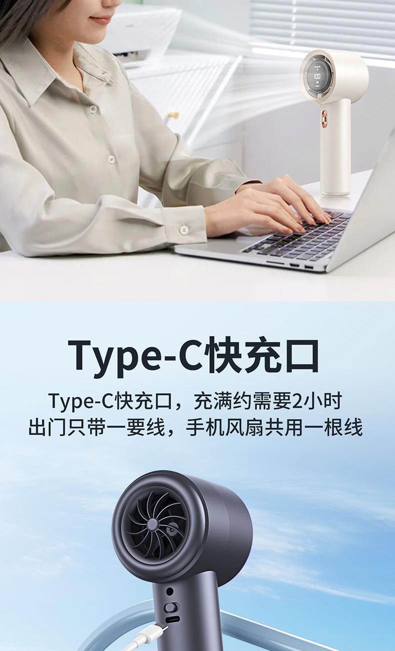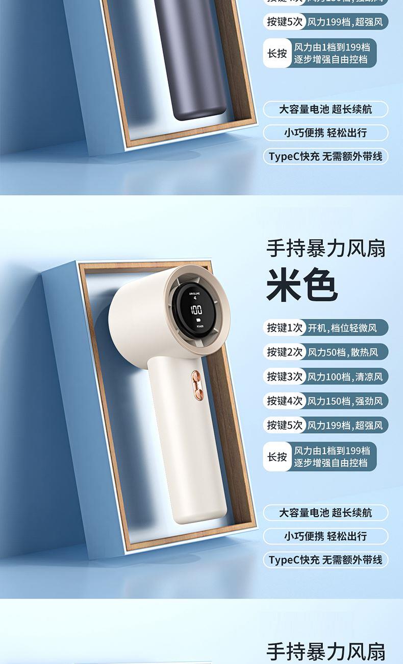 材质:优质ABS 电池类型:18650锂电池 电池容量:2000mAh 输入功率:5V-2.1A 充电时间:约2h 产品接口:TYFE-C快充 档位调节:多档风速调节 颜色:米色/星空灰/少女粉 新款手持暴力风扇、强劲风速、简约设计、质感在线轻巧便携;内置大容量电池,充电快续航久告别续航焦虑,清凉一整天,操作逻辑明确简单,轻松换风量档位0-199档任意调节;Type-C快充口,充满约需要2小时出门只带一要线,手机风扇共用一根线。