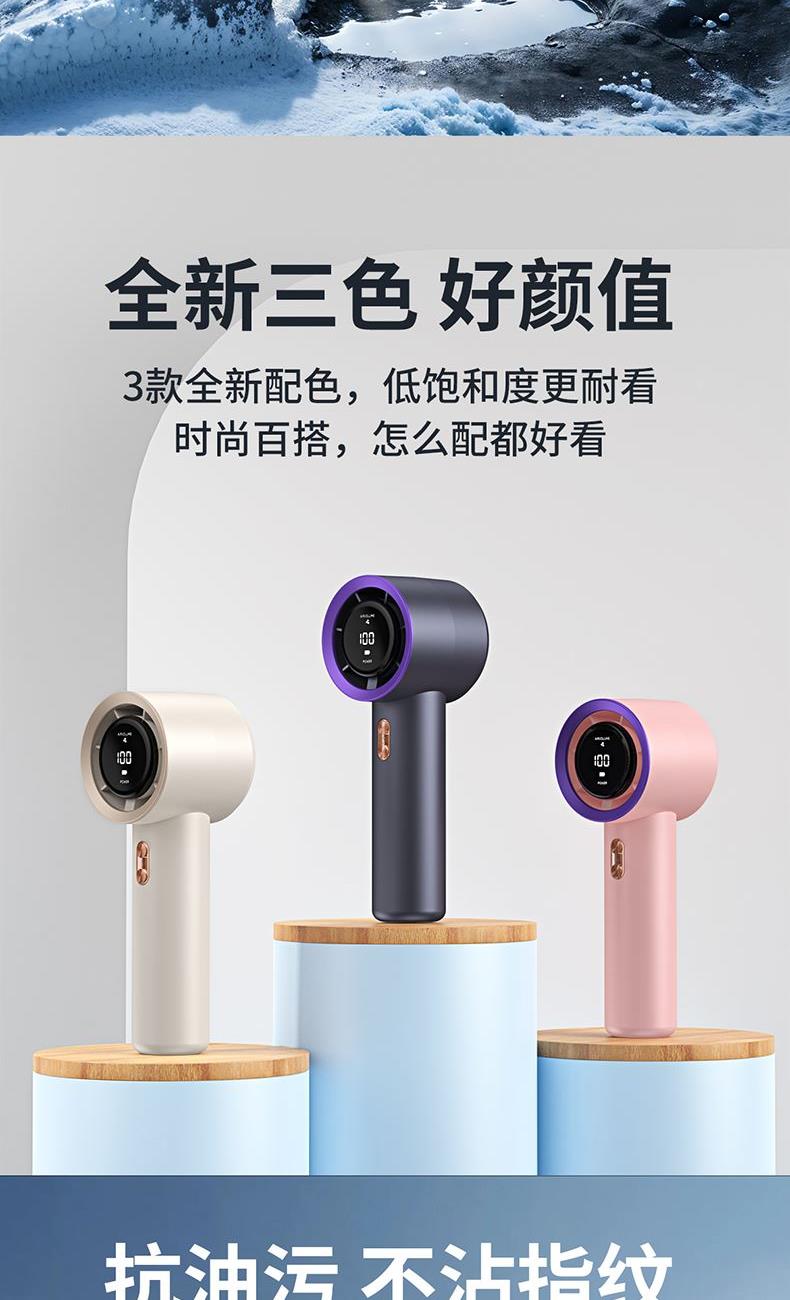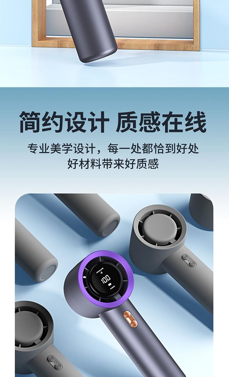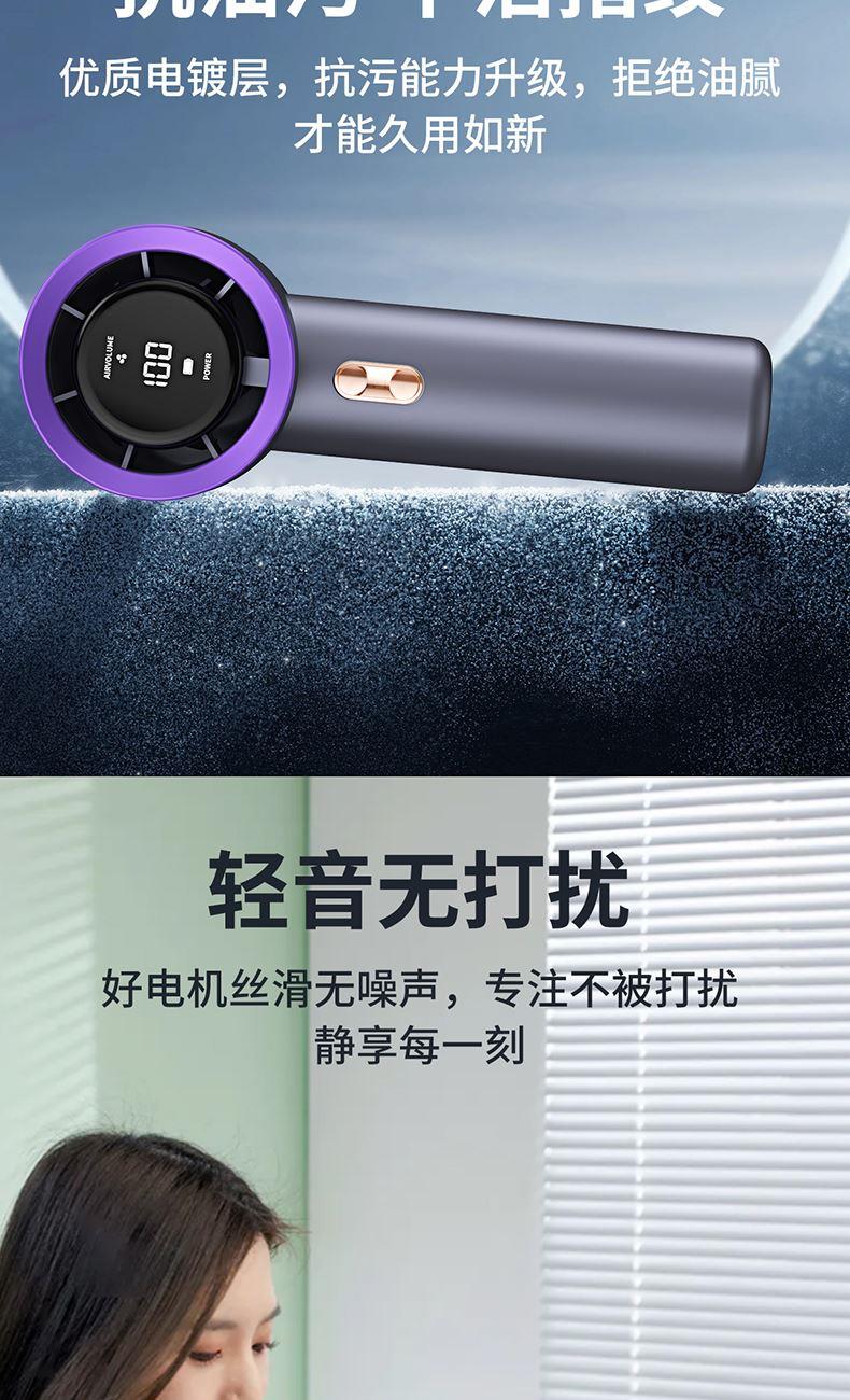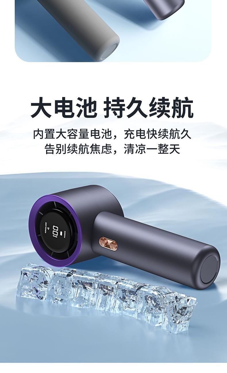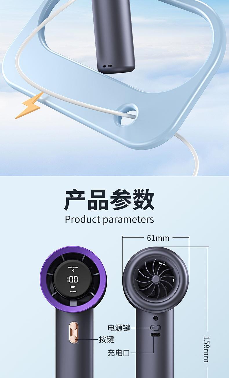 材质:优质ABS 电池类型:18650锂电池 电池容量:2000mAh 输入功率:5V-2.1A 充电时间:约2h 产品接口:TYFE-C快充 档位调节:多档风速调节 颜色:米色/星空灰/少女粉 新款手持暴力风扇、强劲风速、简约设计、质感在线轻巧便携;内置大容量电池,充电快续航久告别续航焦虑,清凉一整天,操作逻辑明确简单,轻松换风量档位0-199档任意调节;Type-C快充口,充满约需要2小时出门只带一要线,手机风扇共用一根线。