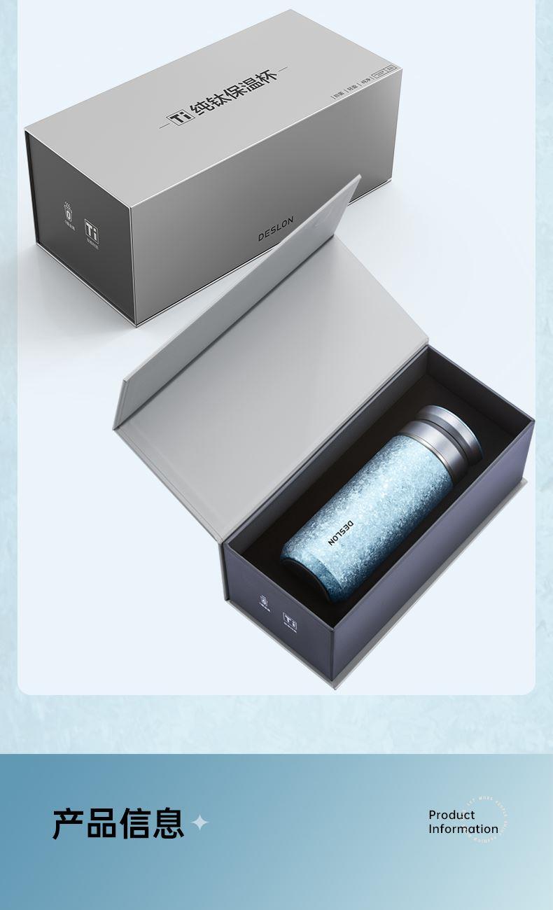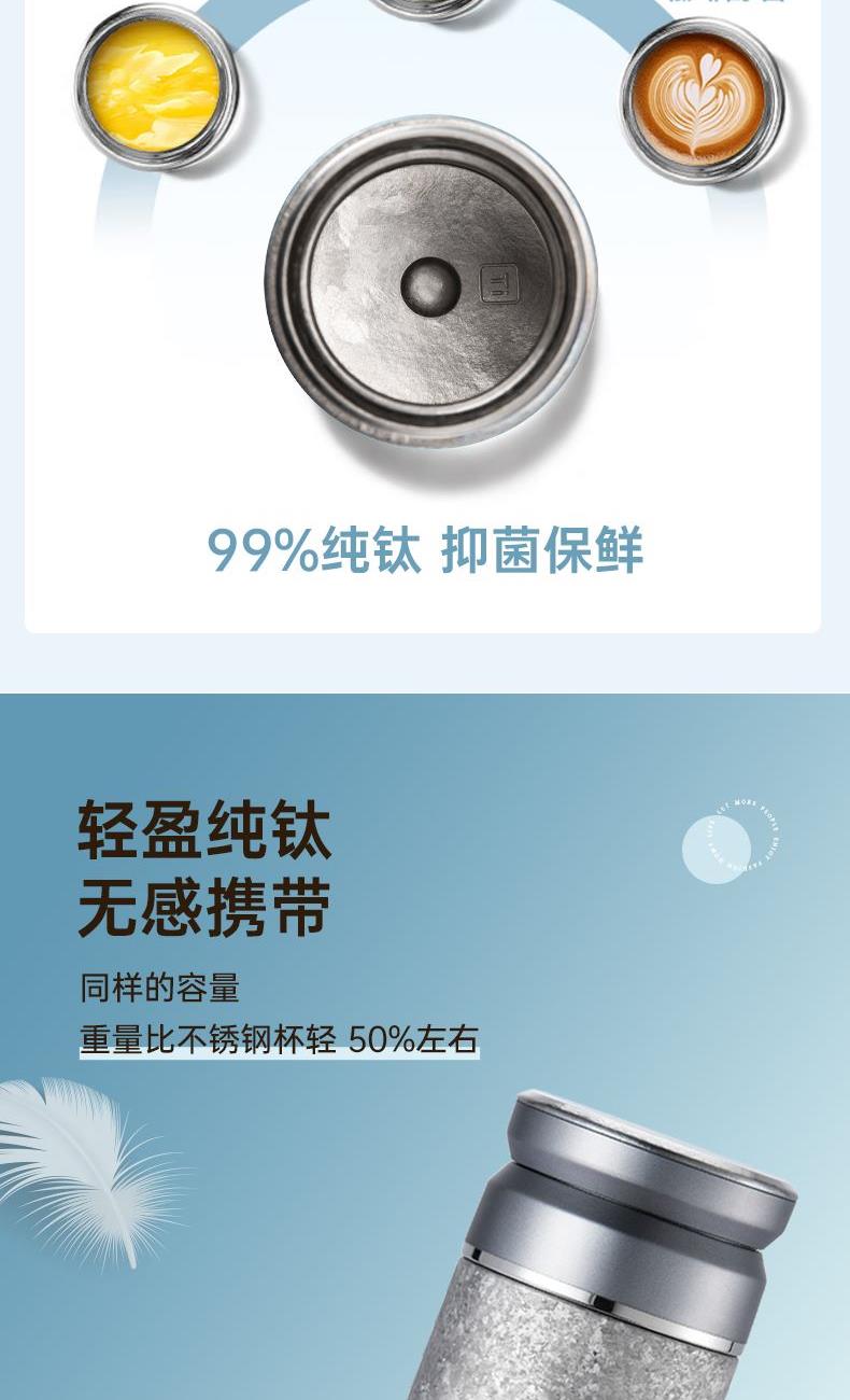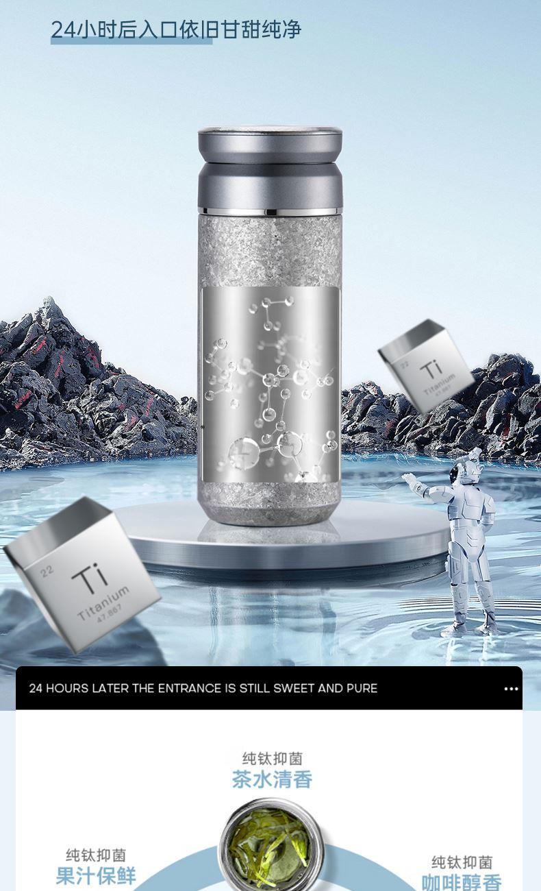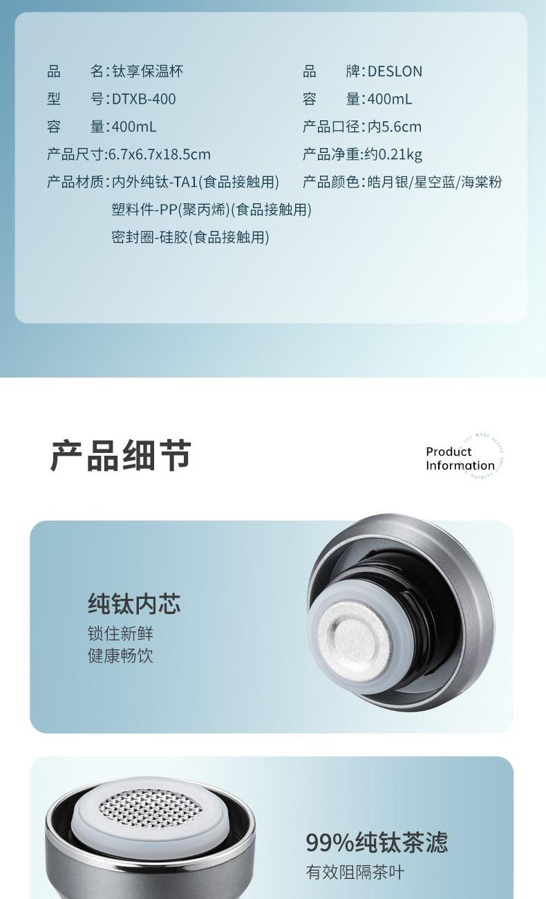 产品容量:400mL 产品口径:5.6cm 产品颜色:皓月银(WH) 、海棠粉(PK) 、星空蓝(BL) 杯体材质:内外99%纯钛+高温结晶(食品接触用) 滤网材质:99%纯钛(食品接触用) 密 封 圈:硅胶(食品接触用) 包装方式:礼盒+外箱 产品条码:6952020905428/6952020905435 6952020905442 产品特点: 1. 杯身内外采用99%纯钛材质,健康环保; 2. 高温锤炼,雪花肌理,物理结晶,自然之美; 3. 纯钛对比不锈钢具有更好的耐酸碱效果,可盛装各类饮品 4. 采用99%纯钛茶滤,饮茶更健康 5. 时尚外观设计,高贵大方,手感细腻光滑,质感非凡。