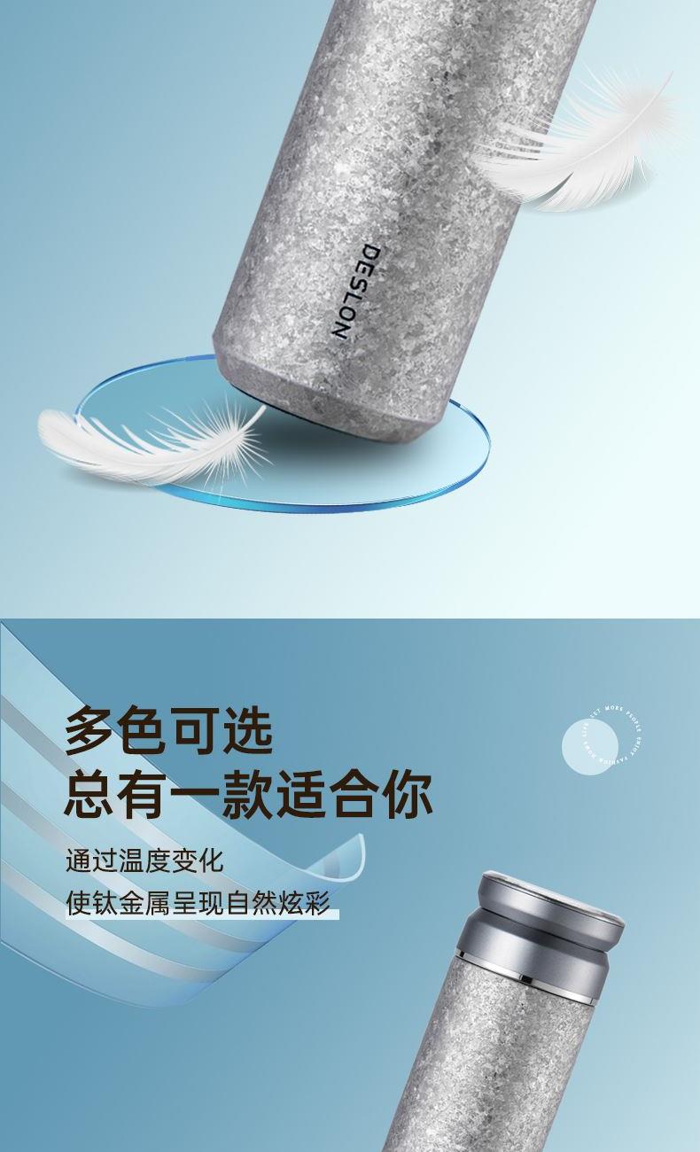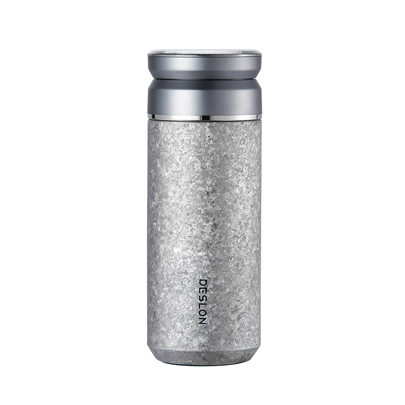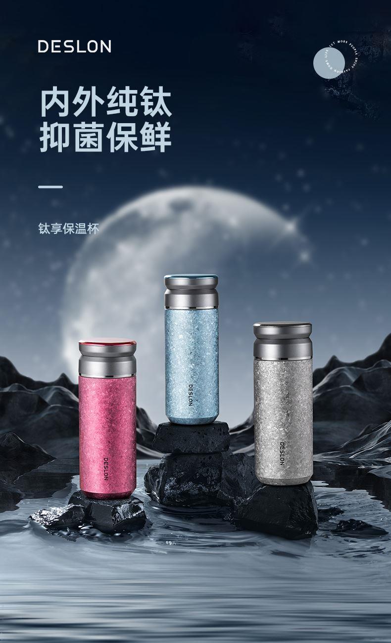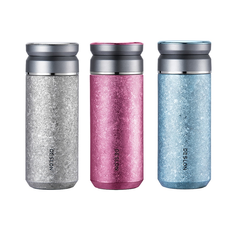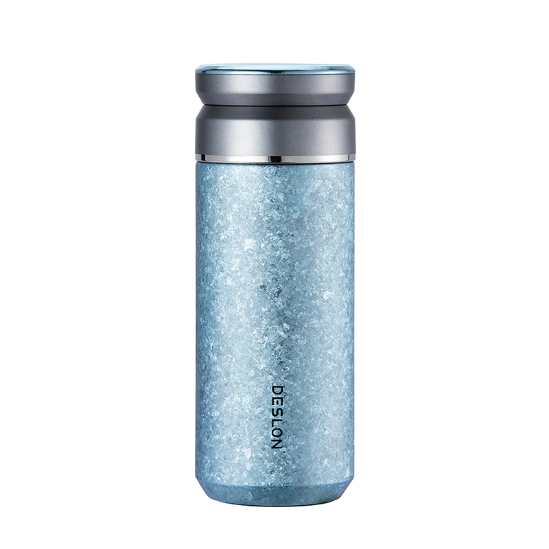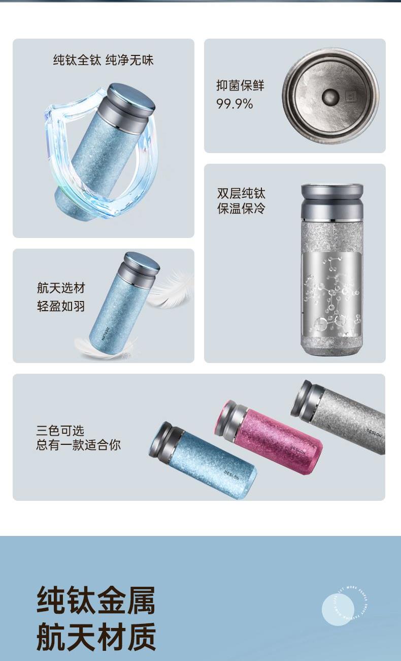产品容量:400mL 产品口径:5.6cm 产品颜色:皓月银(WH) 、海棠粉(PK) 、星空蓝(BL) 杯体材质:内外99%纯钛+高温结晶(食品接触用) 滤网材质:99%纯钛(食品接触用) 密 封 圈:硅胶(食品接触用) 包装方式:礼盒+外箱 产品条码:6952020905428/6952020905435 6952020905442 产品特点: 1. 杯身内外采用99%纯钛材质,健康环保; 2. 高温锤炼,雪花肌理,物理结晶,自然之美; 3. 纯钛对比不锈钢具有更好的耐酸碱效果,可盛装各类饮品 4. 采用99%纯钛茶滤,饮茶更健康 5. 时尚外观设计,高贵大方,手感细腻光滑,质感非凡。