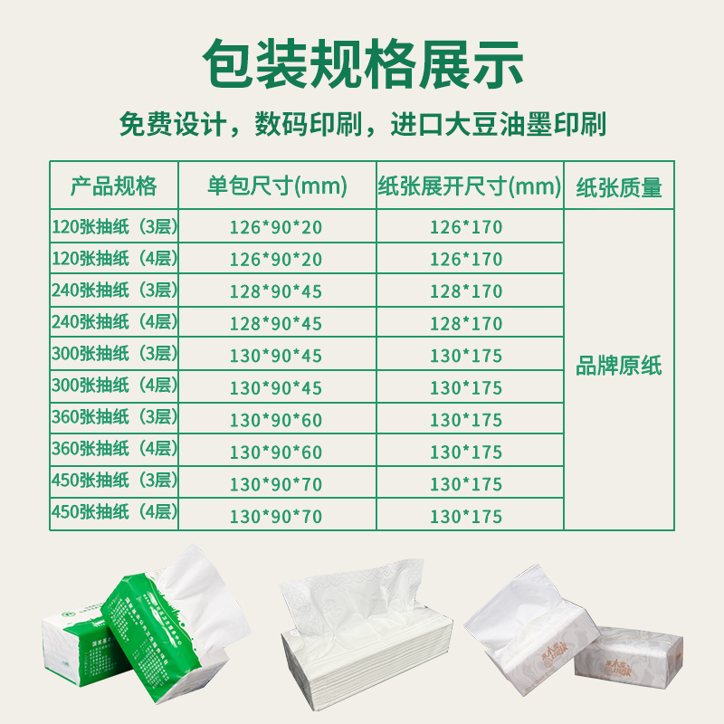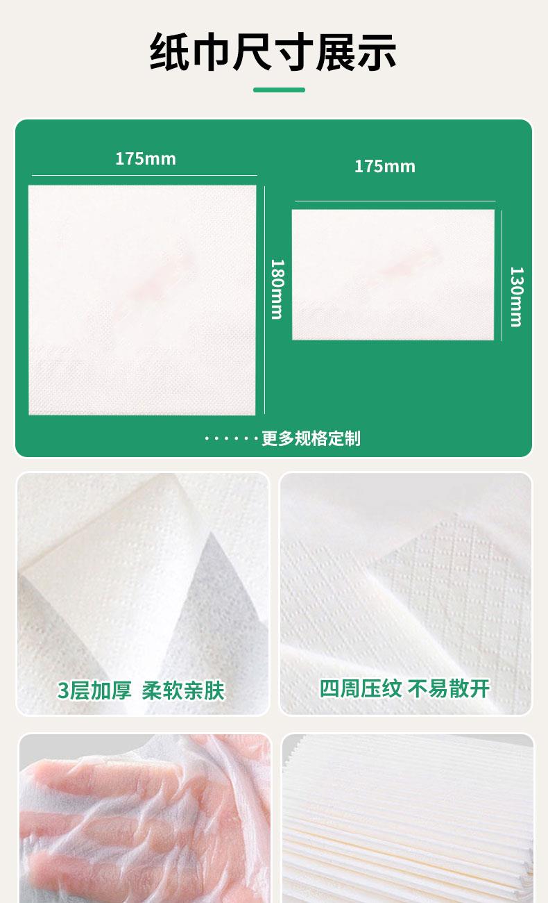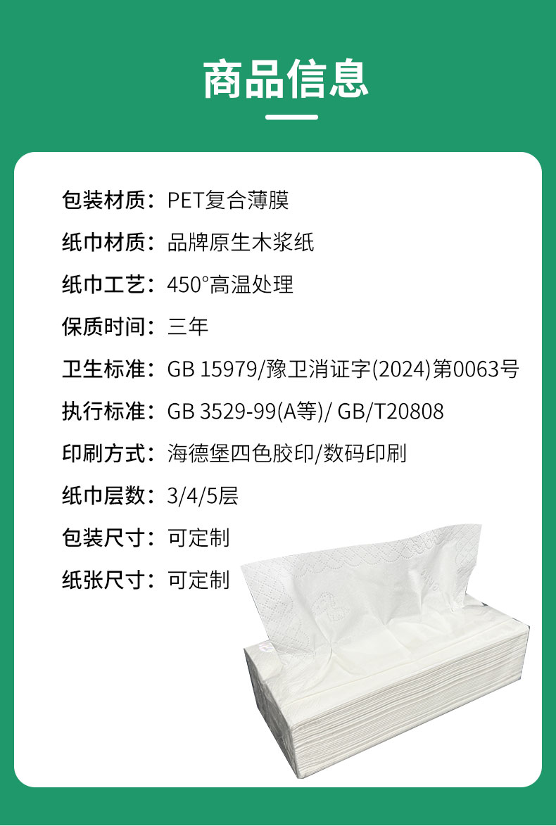 产品尺寸:130*90*52mm 内纸尺寸:130*175mm 净含量:120抽3层(360张) 外箱尺寸:64*50*65cm 主要成分:原生木浆 执行标准:GBT20808 卫生标准:GB15979 卫生许可证:(豫)卫消证字(2024)第0063号 产品等级:合格