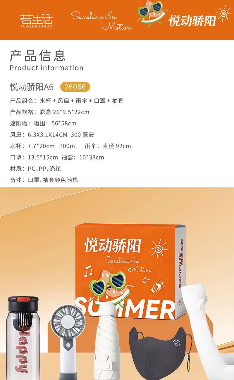 产品组合:水杯+风扇+雨伞+口罩+袖套 遮阳帽:帽围:56*58cm 风扇:6.3X3.1X14CM 300毫安 水杯:7.7*20cm 700ml 雨伞:直径92cm 口罩:13.5*15cm 袖套: 10*38cm 材质:PC、PP、涤纶 包装:彩盒