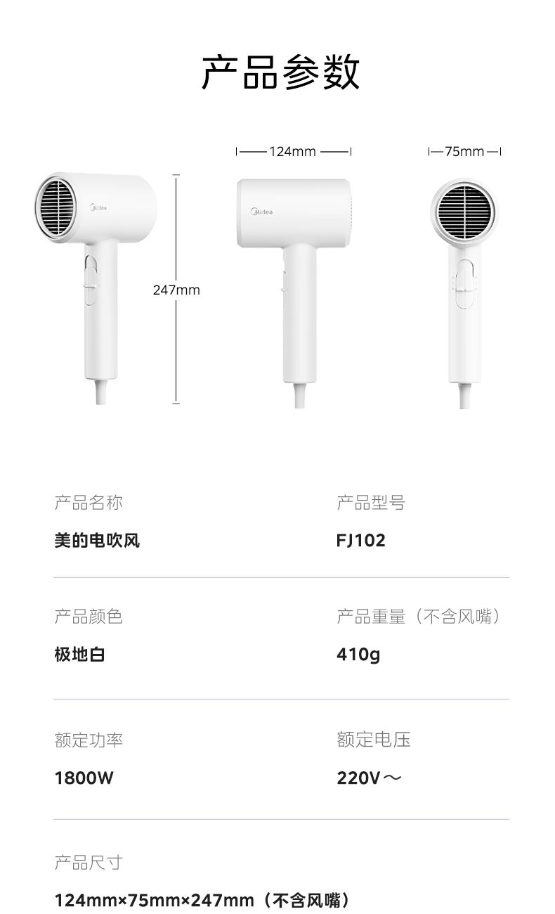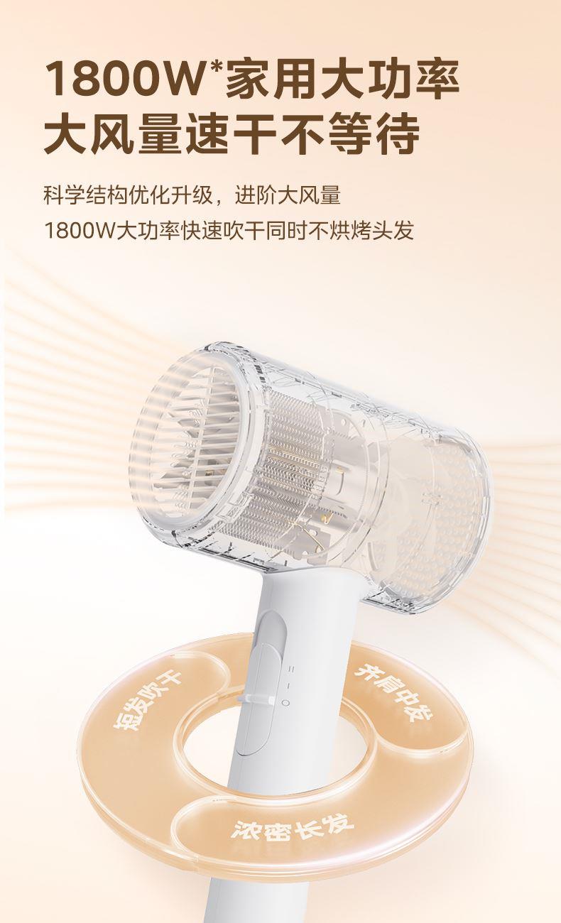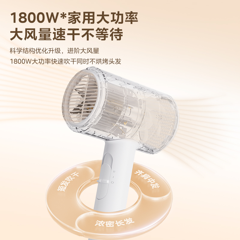 产品规格: 产品尺寸:124 x 75 x 247 mm 包装尺寸:125 x 85 x 260 mm 产品毛重: 0.4kg 产品特点: 极简风格,时尚百搭330g*轻量机身,厚重发量吹干不累手 科学结构优化升级,进阶大风量1800W大功率快速吹干同时不烘烤头发 20000转*动力,高效省时又呵护发丝 5000万*负离子护发,驯服毛燥,柔亮顺滑 6种吹发方案,3挡风温x2挡风速