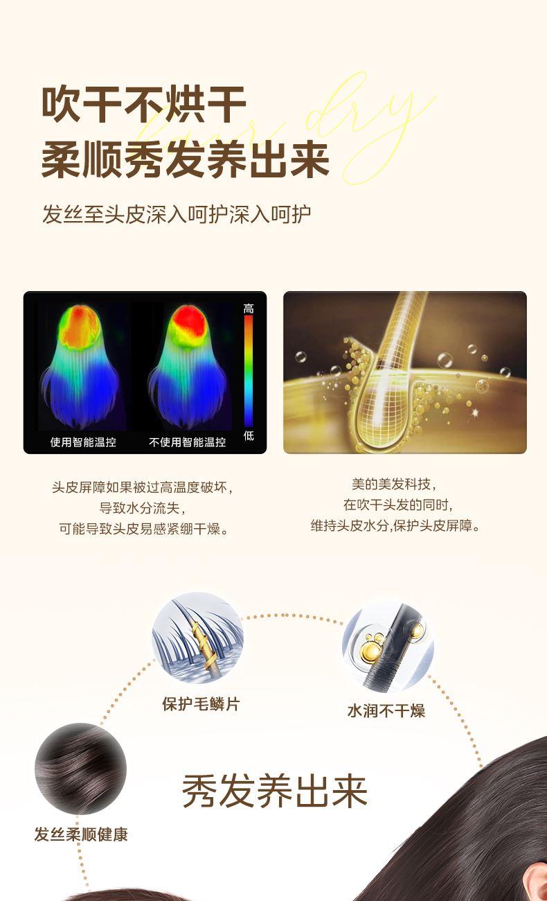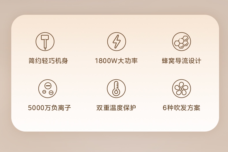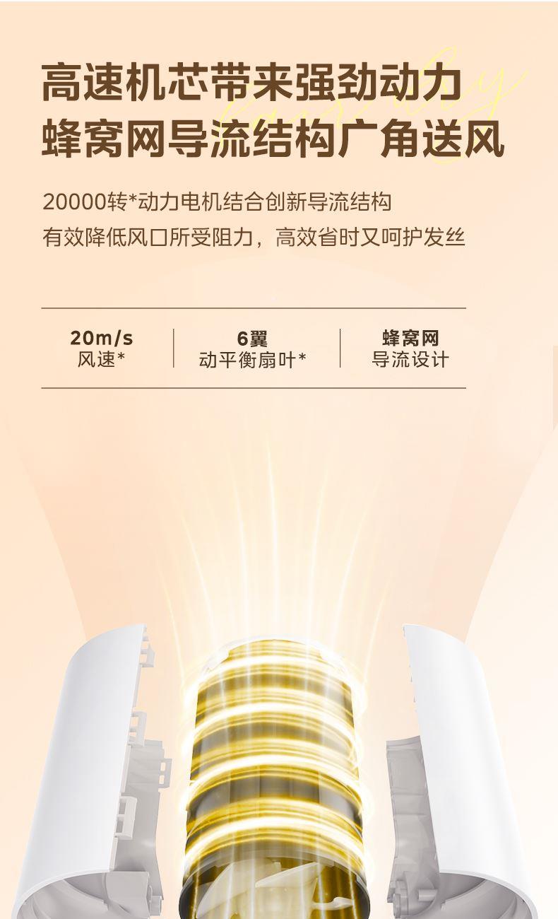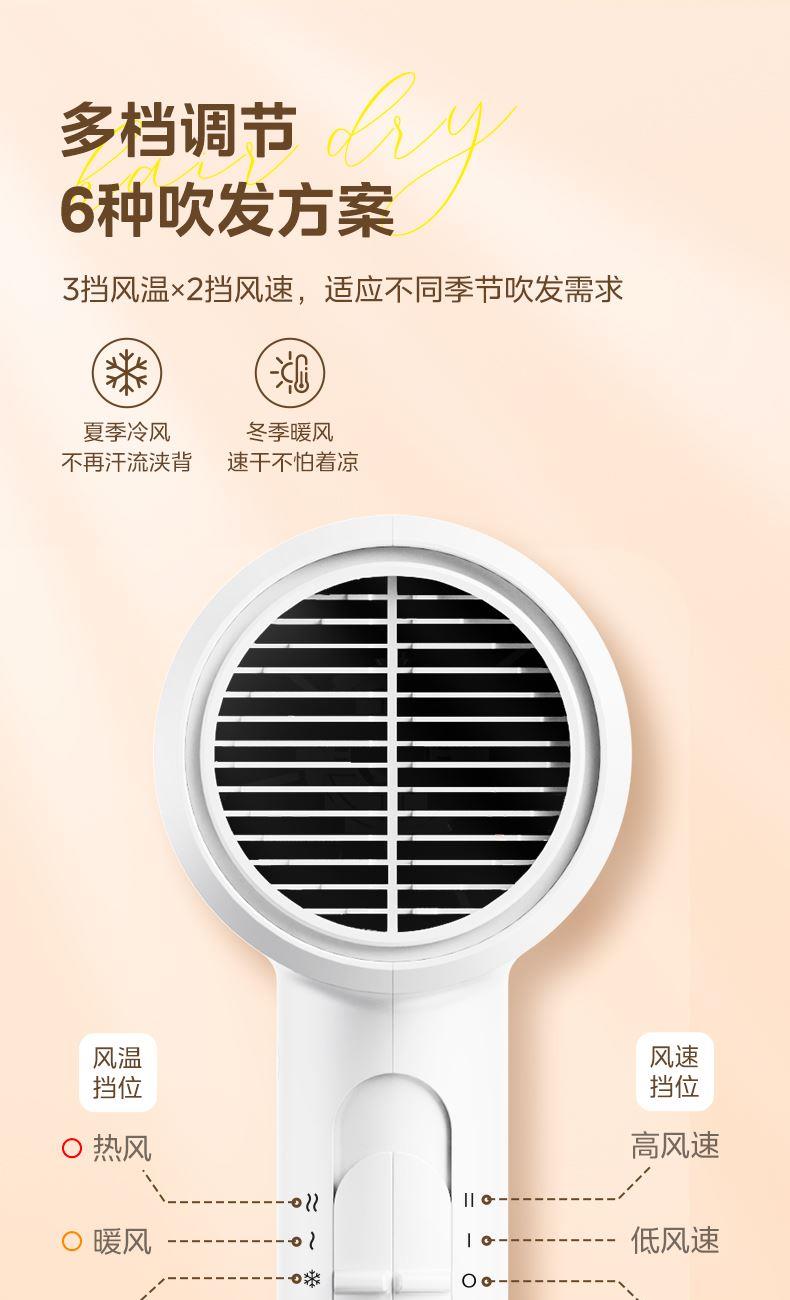 产品规格: 产品尺寸:124 x 75 x 247 mm 包装尺寸:125 x 85 x 260 mm 产品毛重: 0.4kg 产品特点: 极简风格,时尚百搭330g*轻量机身,厚重发量吹干不累手 科学结构优化升级,进阶大风量1800W大功率快速吹干同时不烘烤头发 20000转*动力,高效省时又呵护发丝 5000万*负离子护发,驯服毛燥,柔亮顺滑 6种吹发方案,3挡风温x2挡风速