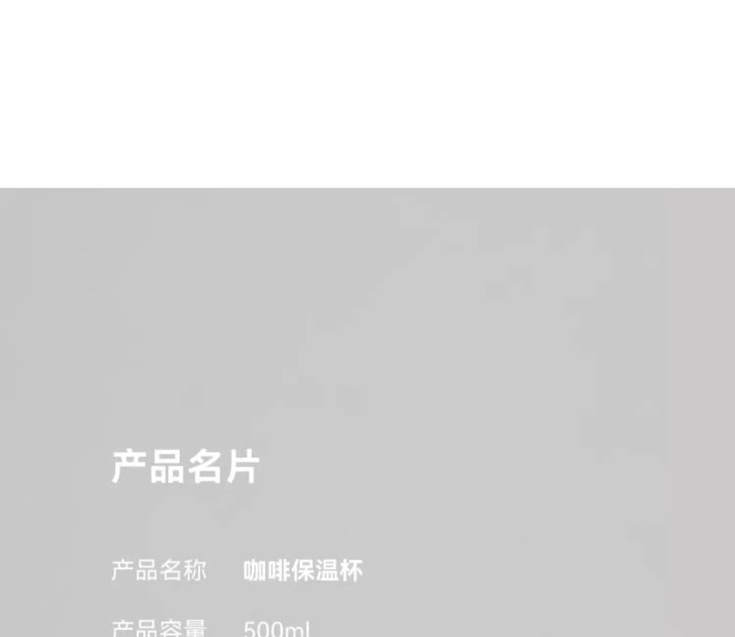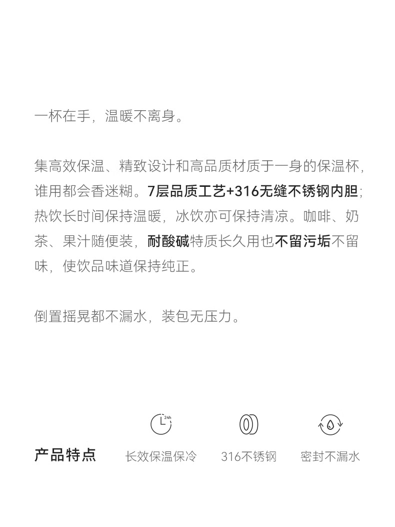 颜色:陶白 外包装尺寸(mm):98*98*191mm 毛重(kg):0.34 材质:316不锈钢 容量:500ml 保温时长:6小时以上 1. 集高效保温、精致设计和高品质材质于一身的保温杯,7层品质工艺+316无缝不锈钢内胆 2. 热饮长时间保持温暖,冰饮亦可保持清凉 3. 咖啡、奶茶、果汁随便装,耐酸碱特质长久用也不留污垢不留味