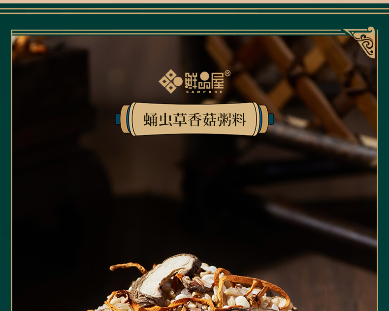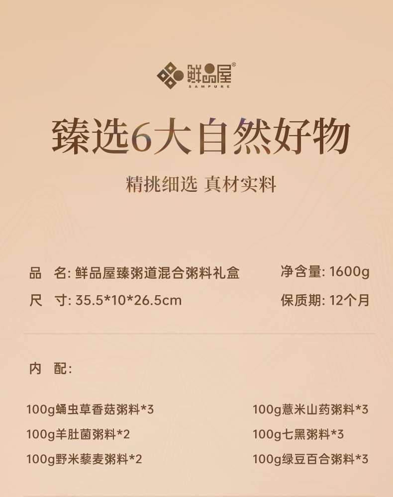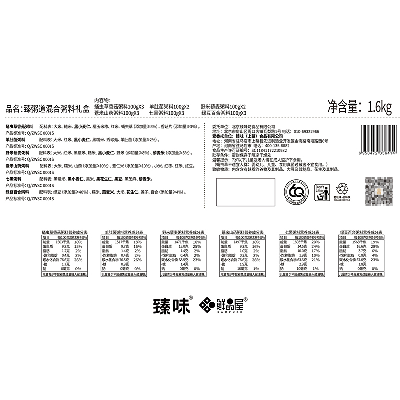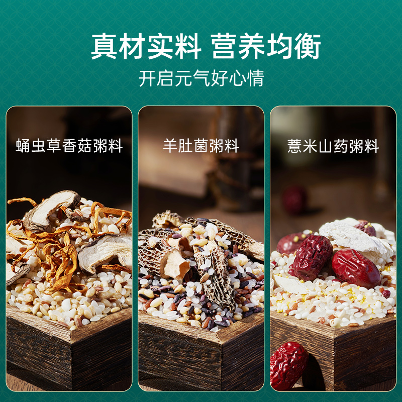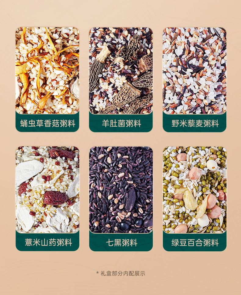 100g蛹虫草香菇粥料*3 100g羊肚菌粥料*2 100g野米藜麦粥料*2 100g薏米山药粥料*3 100g七黑粥料*3 100g绿豆百合粥料*3