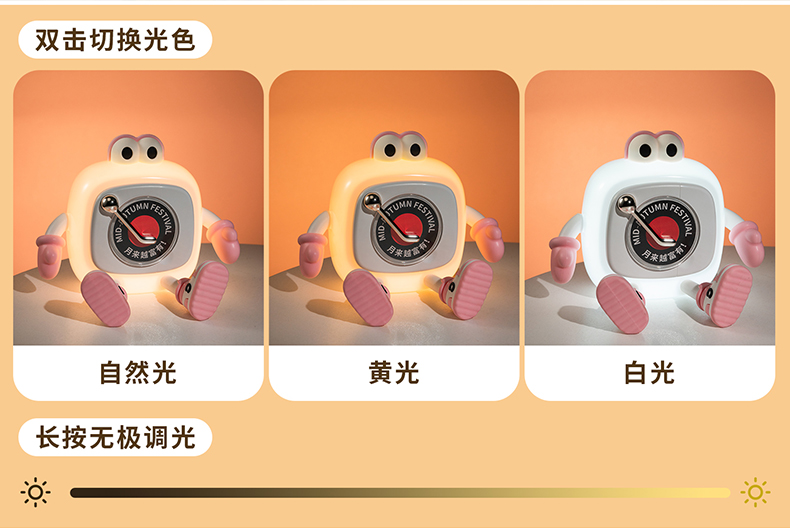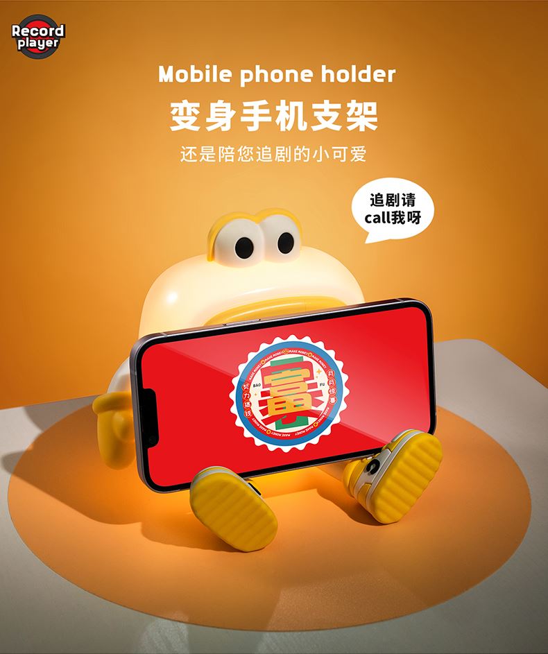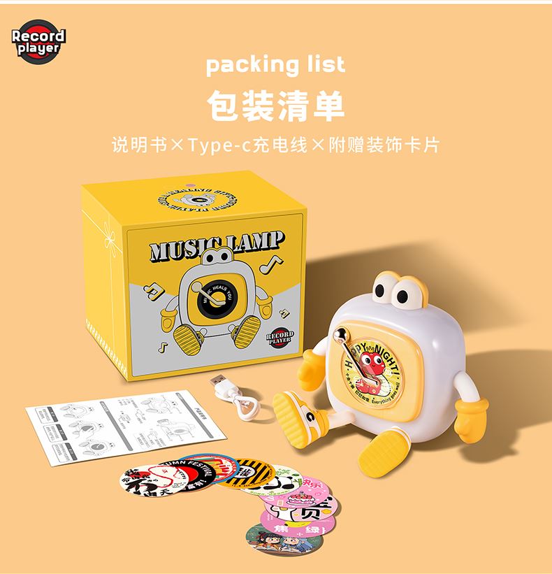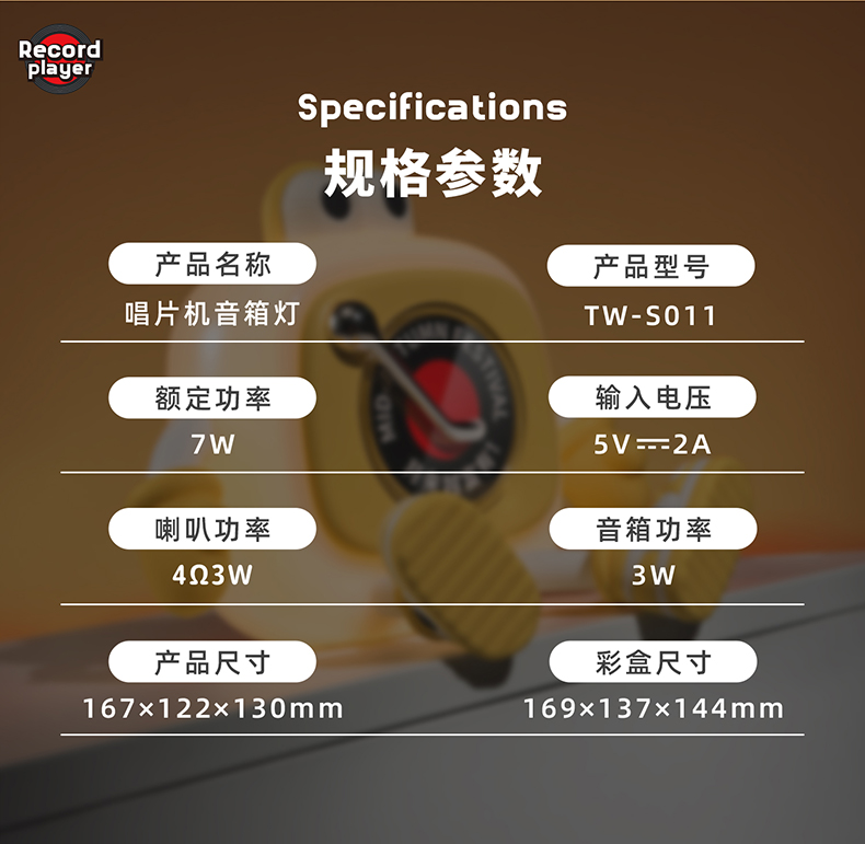 蓝牙款产品参数 产品:唱片机音箱灯 产品型号:TW-S011 蓝牙型号:TW-S011 输入电压:5V⎓2A LED功率:0.6W(32x0.2W/LED模块) 额定功率:7W 音箱功率:3W 喇叭功率:4Ω3W 蓝牙版本:5.1 色温:4000K/3000K/6000K 显色指数:Ra80 电池容量:2000mAh 充电时间:≈3-4H 音箱续航时间:≈5H 灯光续航时间:≈14-125H 音箱+灯光续航时间:≈3.5-5H 支持边充边用,充电时间不受影响 产品规格:143x151x135mm 包装规格:145x152x141mm 包装材料:牛皮纸+铜版纸 产品材料:ABS+PC+PP+PVC+硅胶 产品配件:说明书+Type-c电源线+附赠10款卡片图案 产品净重:350g 产品毛重:491g 信息: 净重:17.6kg 毛重:18.6kg 箱数:36PCS 外箱尺寸:527*431*601mm