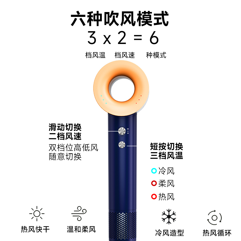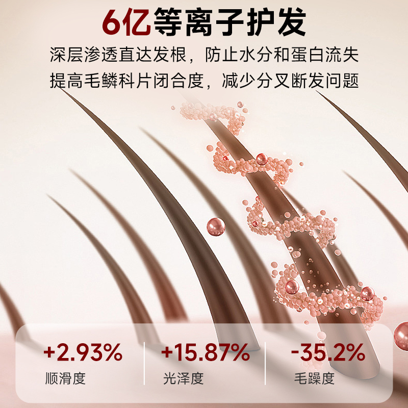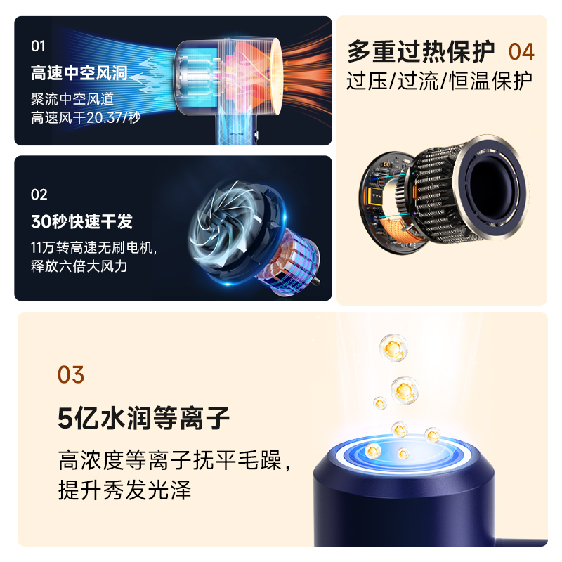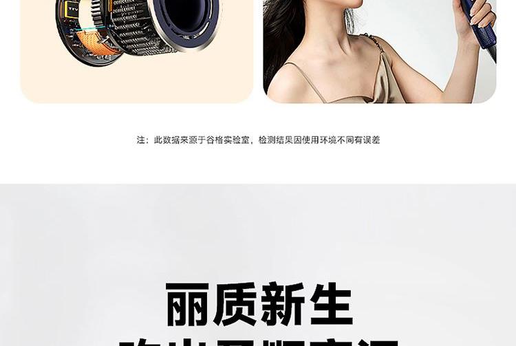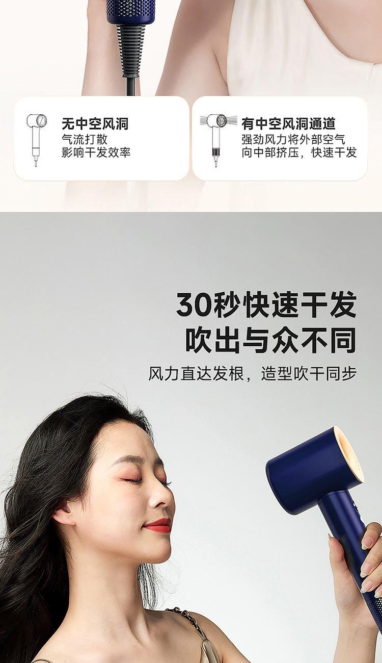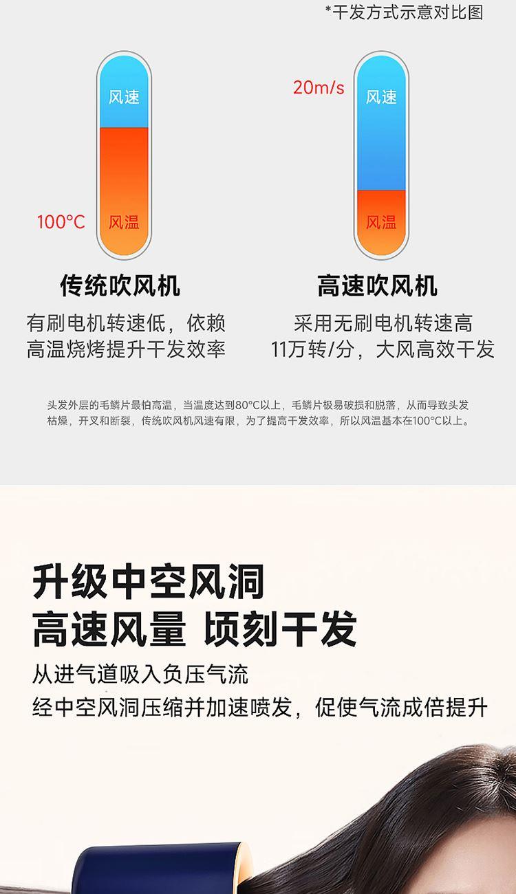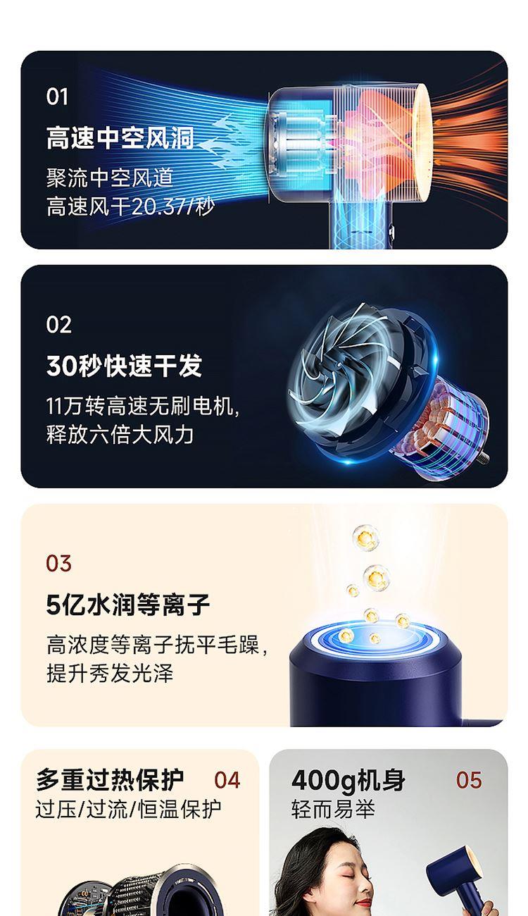 额定功率:1300W 额定频率:50HZ 额定电压:220V 产品净重:0.4kg 产品尺寸:243*95*73mm 电源线长:1.8m(含插头) 包装方式:礼盒+邮箱 产品尺寸:243*95*73 邮包尺寸:350*150*90 产品净重:0.4kg 产品毛重:0.945kg ● 高速无刷电机,自主研发11万转高速无刷电机,大码率速干。 ● 等离子护发技术,千万等离子,柔顺光滑,改善发质,远离静电。 ● 智能温控系统,温度记忆功能,防止过热损伤,呵护发质光泽。 ● 三档温度,两档风速组合,LED指示灯。 ● 降噪设计,打造愉悦吹风体验。 ● 电机反转工作可自动进入清洁模式;可拆卸过滤罩,易拆卸清洗