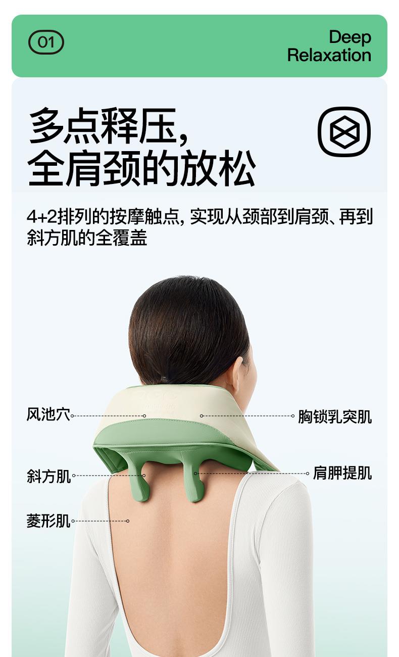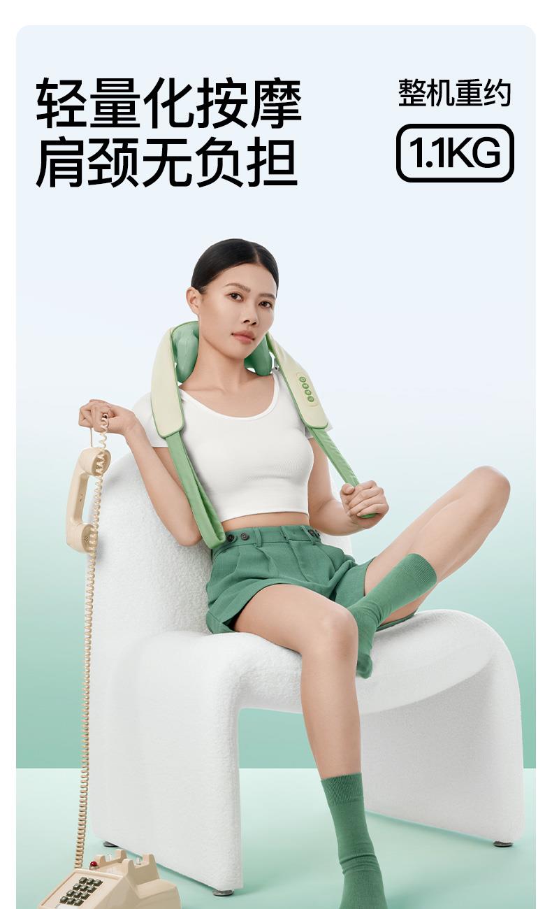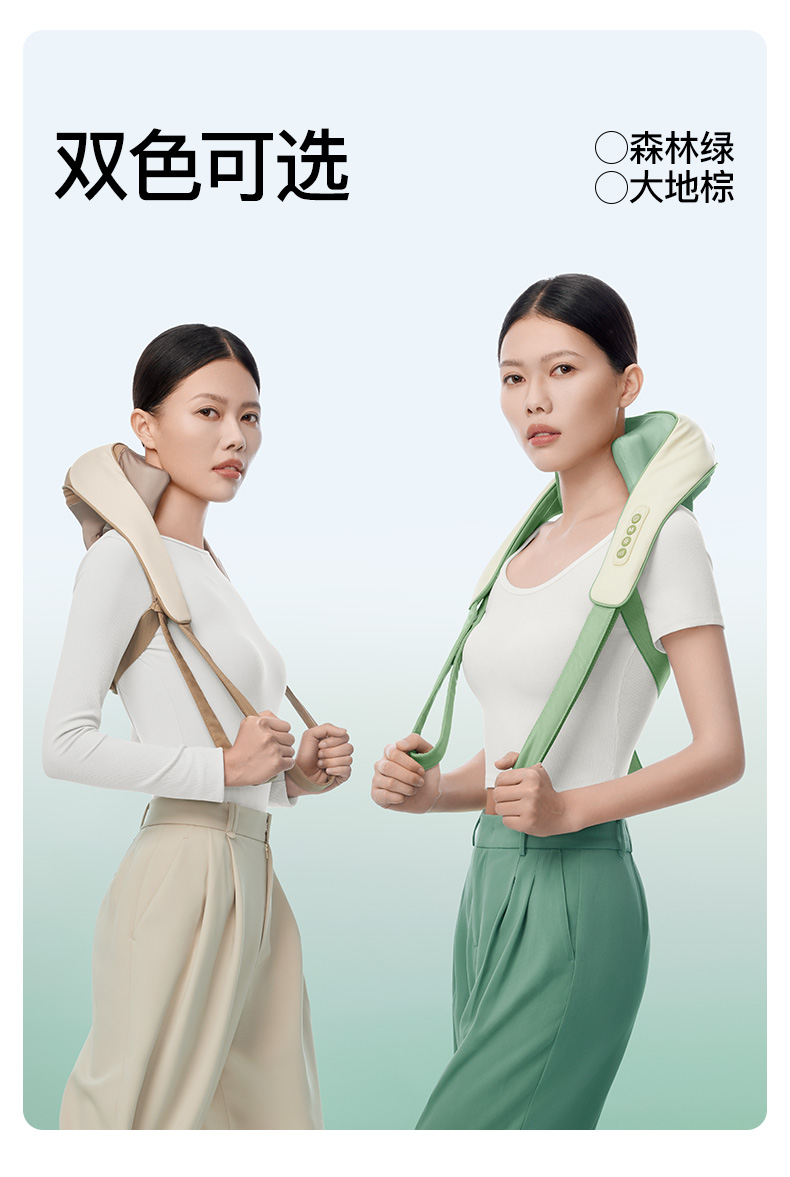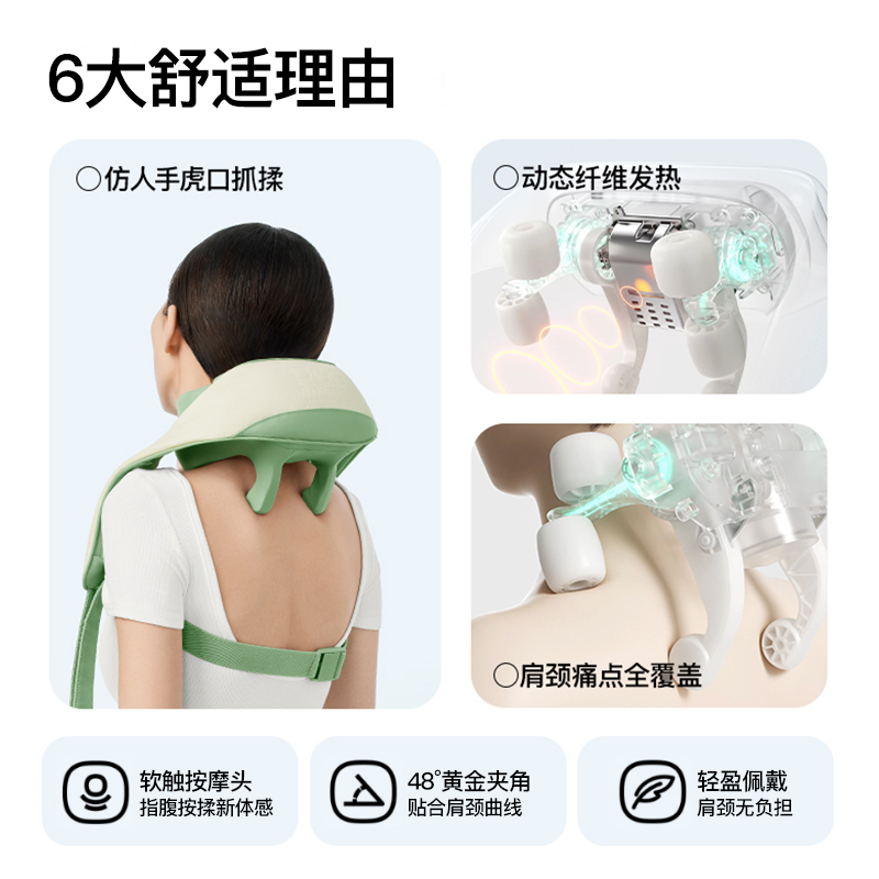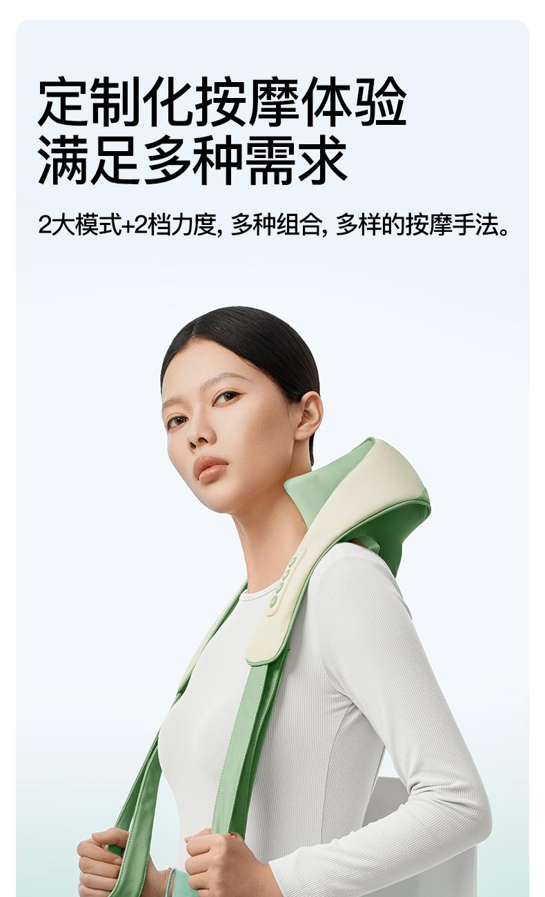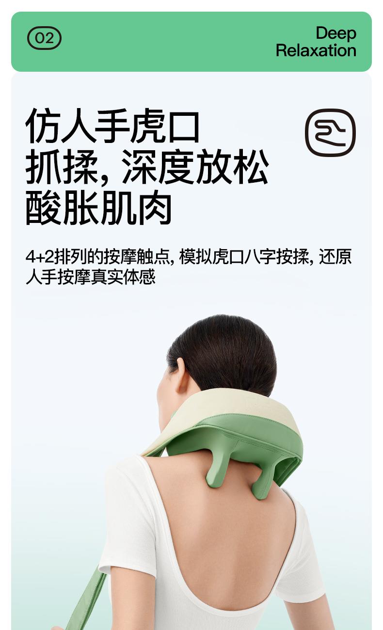 产品颜色 大地棕、森林绿 产品材质 皮革/布料/硅胶 产品重量 1185g 电池容量 2000mAh 充电时间 3.5~4.5H 模式调节 2种 续航时间 单次使用时长:满电状态下使用70~90分钟 额定输入 5V/2A 热敷温度 40~45℃ 产品功能 ●6维按摩,全肩颈的放松,加长按摩头,6维多触点按摩,实现从颈部到斜 方肌、再到肩膀 的全覆盖。 ●仿虎口开合抓揉,深度放松酸胀肌肉,通过精密的转轴和4+2排列的按摩头,模拟人手虎 口八字开合按摩,一抓一揉,还原老师傅按揉 真实体感。4臂6爪 机械手臂,大力 拉伸舒爽 有劲 微型机械手施力,根据3维坐标运动轨迹 施力,大力拉伸肌肉,卸下肩颈压力。 ●软触按摩头, 指腹按揉新体感 微型机械手施力,根据3维坐标运动轨迹施力,大力拉伸肌肉,卸下肩颈压力。 ●动态纤维发热, 暖透易疲肌肉群 通过科学排列组合,研发的波浪式动态发热技术,在快 速发热的同时,让热感随着按摩深入 肌肉筋膜层。