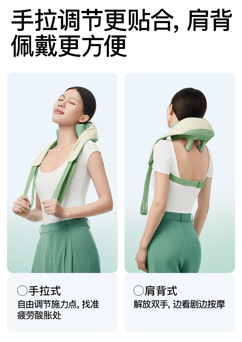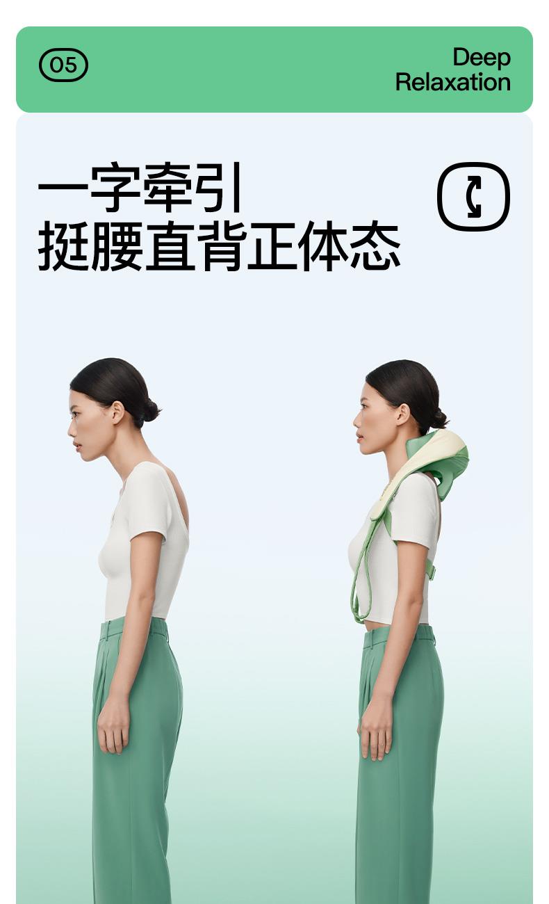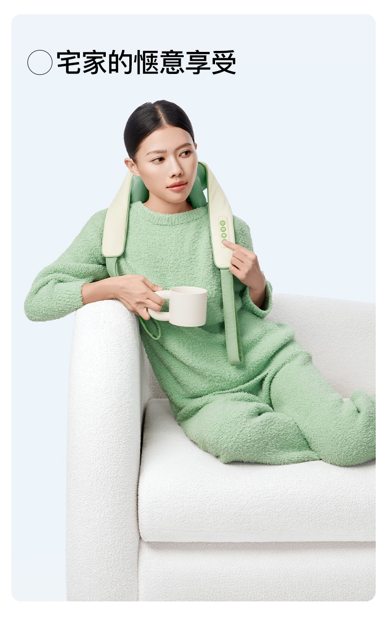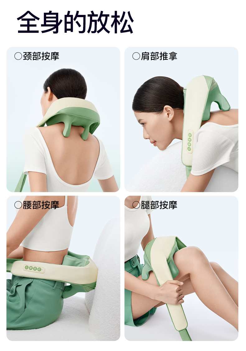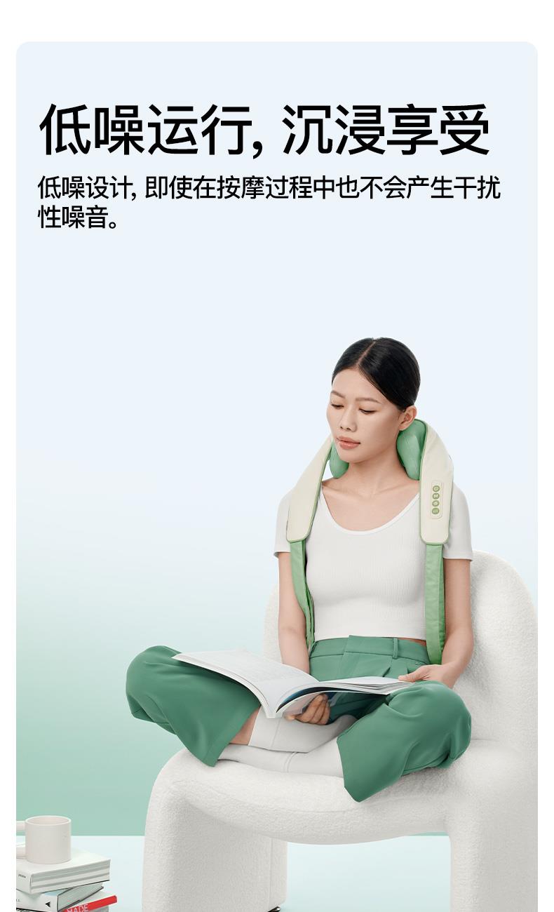 产品颜色 大地棕、森林绿 产品材质 皮革/布料/硅胶 产品重量 1185g 电池容量 2000mAh 充电时间 3.5~4.5H 模式调节 2种 续航时间 单次使用时长:满电状态下使用70~90分钟 额定输入 5V/2A 热敷温度 40~45℃ 产品功能 ●6维按摩,全肩颈的放松,加长按摩头,6维多触点按摩,实现从颈部到斜 方肌、再到肩膀 的全覆盖。 ●仿虎口开合抓揉,深度放松酸胀肌肉,通过精密的转轴和4+2排列的按摩头,模拟人手虎 口八字开合按摩,一抓一揉,还原老师傅按揉 真实体感。4臂6爪 机械手臂,大力 拉伸舒爽 有劲 微型机械手施力,根据3维坐标运动轨迹 施力,大力拉伸肌肉,卸下肩颈压力。 ●软触按摩头, 指腹按揉新体感 微型机械手施力,根据3维坐标运动轨迹施力,大力拉伸肌肉,卸下肩颈压力。 ●动态纤维发热, 暖透易疲肌肉群 通过科学排列组合,研发的波浪式动态发热技术,在快 速发热的同时,让热感随着按摩深入 肌肉筋膜层。