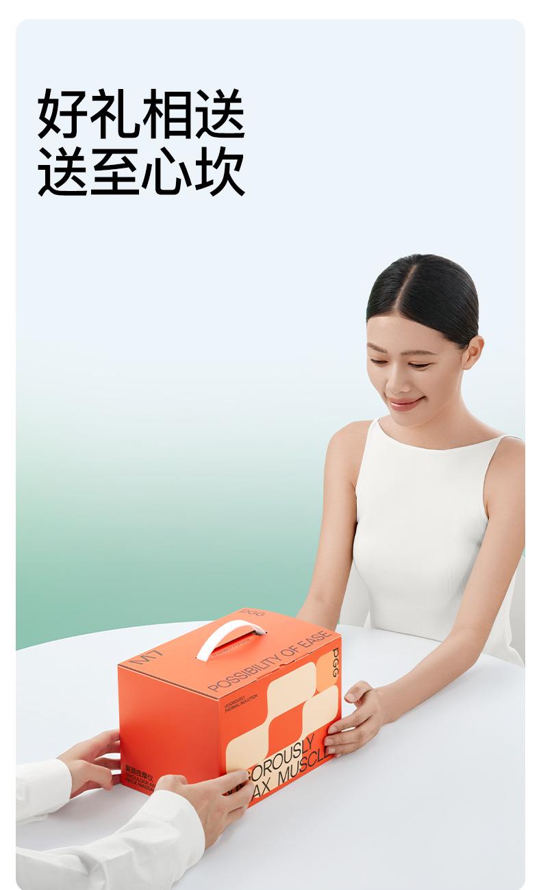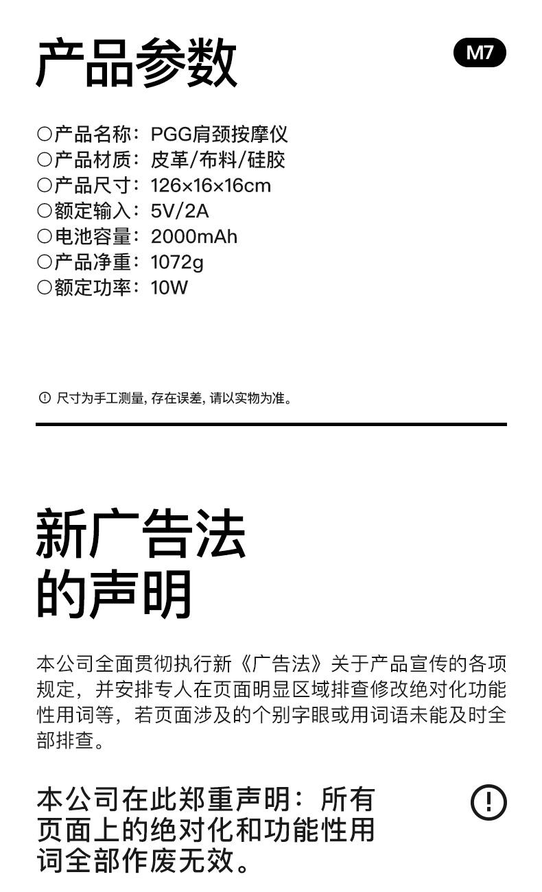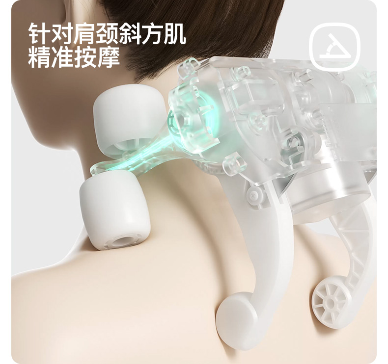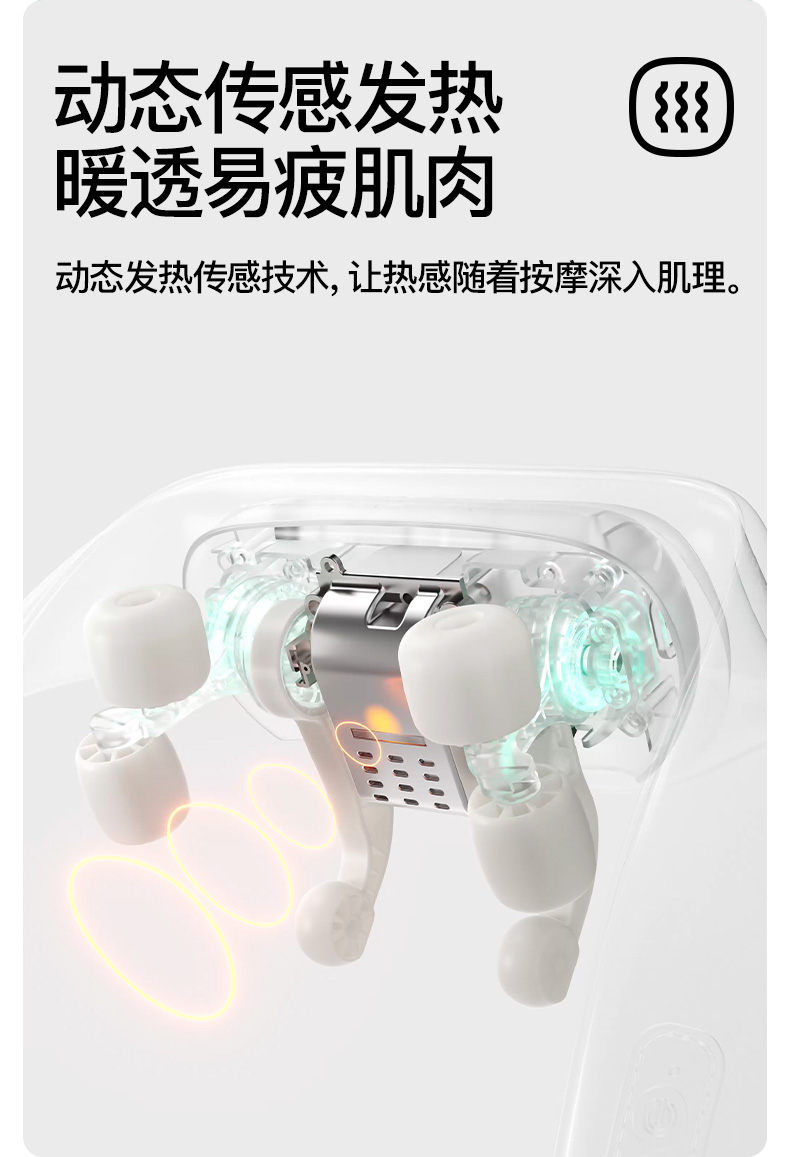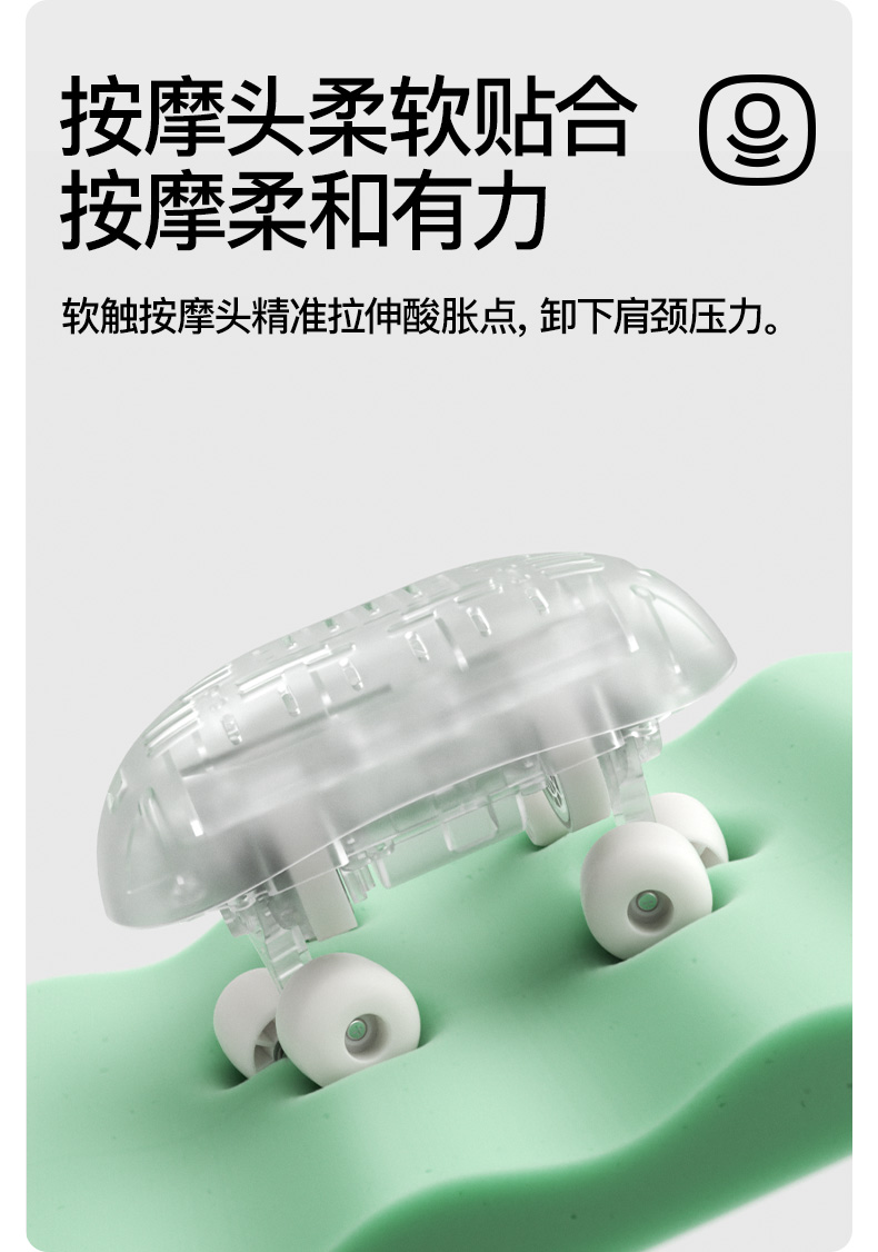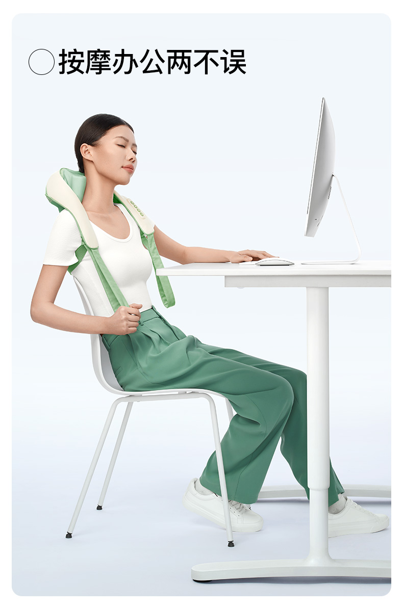 产品颜色 大地棕、森林绿 产品材质 皮革/布料/硅胶 产品重量 1185g 电池容量 2000mAh 充电时间 3.5~4.5H 模式调节 2种 续航时间 单次使用时长:满电状态下使用70~90分钟 额定输入 5V/2A 热敷温度 40~45℃ 产品功能 ●6维按摩,全肩颈的放松,加长按摩头,6维多触点按摩,实现从颈部到斜 方肌、再到肩膀 的全覆盖。 ●仿虎口开合抓揉,深度放松酸胀肌肉,通过精密的转轴和4+2排列的按摩头,模拟人手虎 口八字开合按摩,一抓一揉,还原老师傅按揉 真实体感。4臂6爪 机械手臂,大力 拉伸舒爽 有劲 微型机械手施力,根据3维坐标运动轨迹 施力,大力拉伸肌肉,卸下肩颈压力。 ●软触按摩头, 指腹按揉新体感 微型机械手施力,根据3维坐标运动轨迹施力,大力拉伸肌肉,卸下肩颈压力。 ●动态纤维发热, 暖透易疲肌肉群 通过科学排列组合,研发的波浪式动态发热技术,在快 速发热的同时,让热感随着按摩深入 肌肉筋膜层。