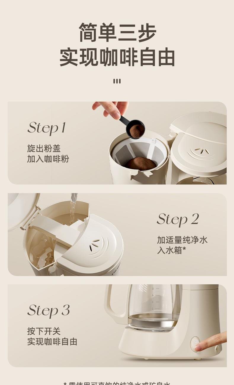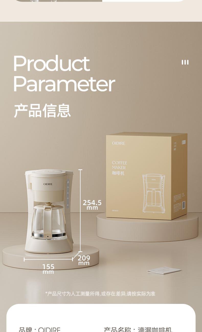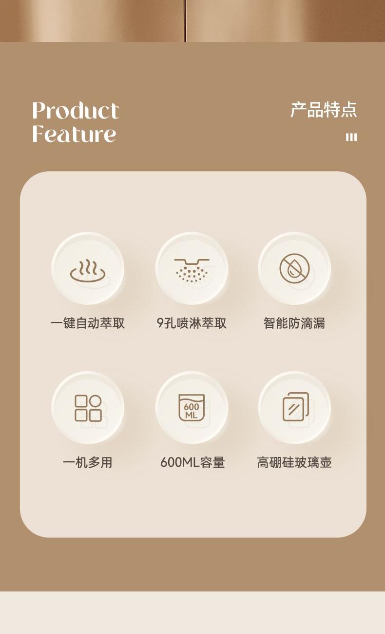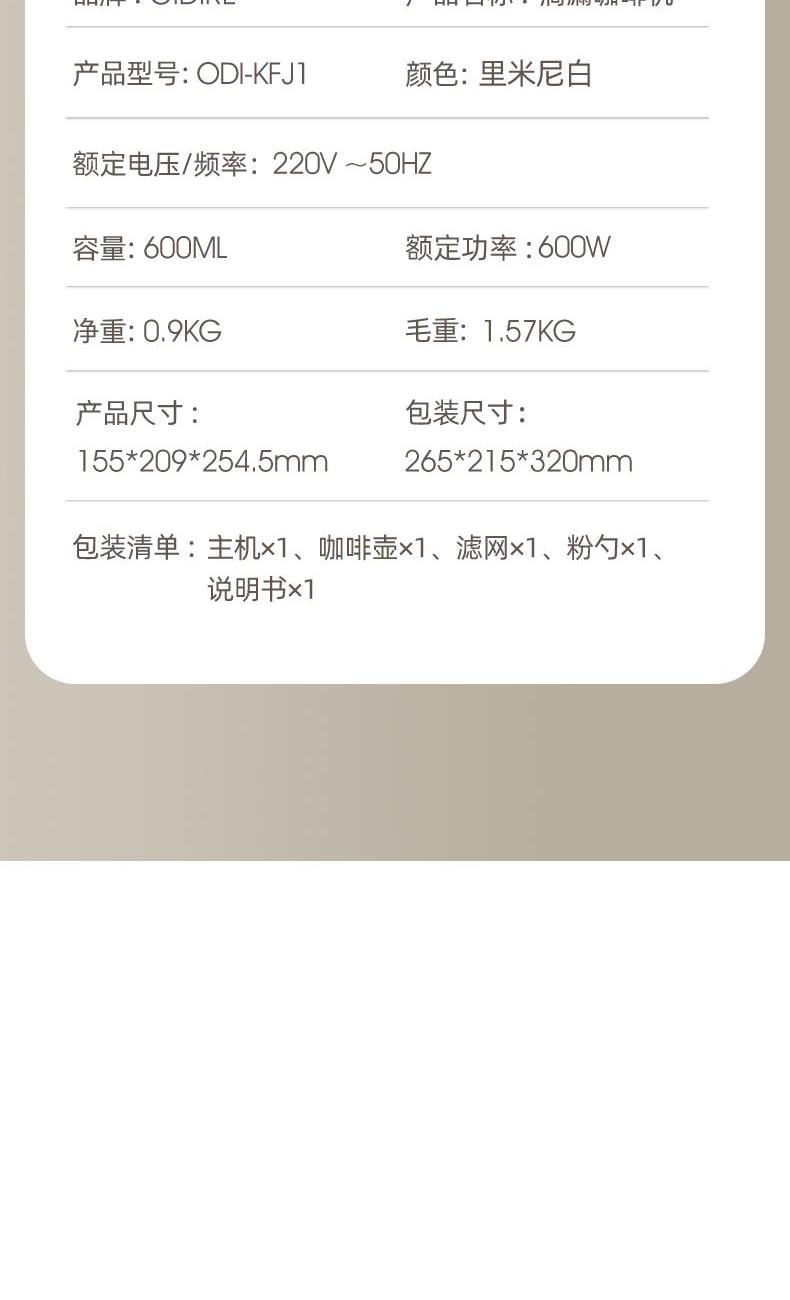 主要材质:PP+玻璃 电压:220V 功率:550W 容量:600ml 产品尺寸: 155*209*254.5mm 邮购箱:65*215*320mm 单台净重:0.9kg 单台毛重:1.57kg 规格:6台/箱 包装方式:3层彩盒+3层邮购箱+3层牛卡大箱 1.高密度滤网,留住微小粉末,口感更细腻 2.高温萃取,保留咖啡香气 3.底部设有保温盘,实时保温 4.600ml水箱容量,能出5杯120ml咖啡