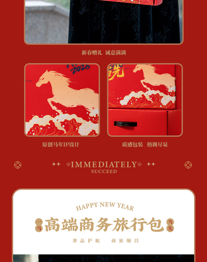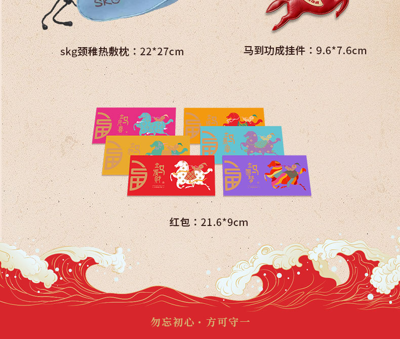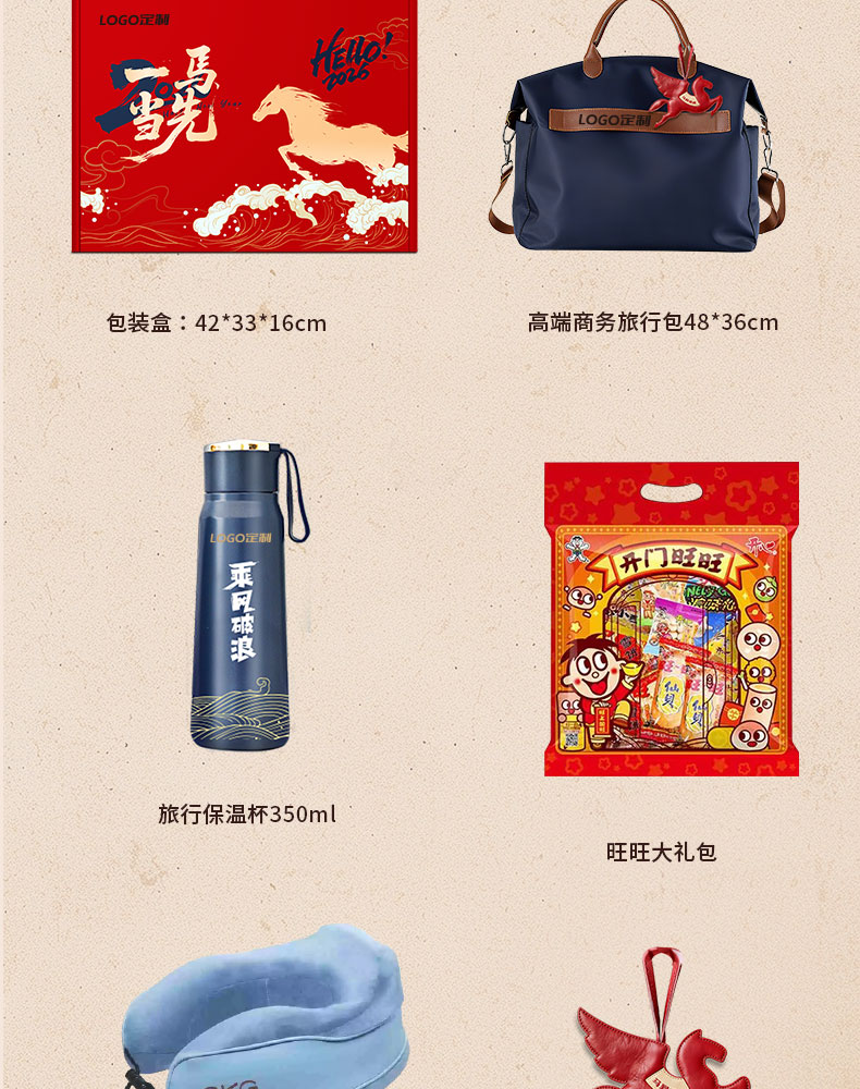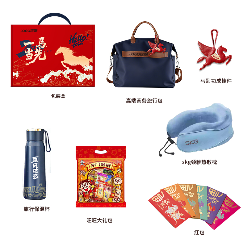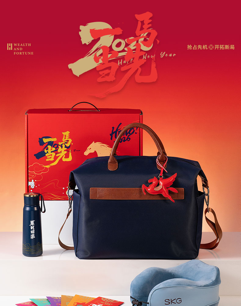 • 商务旅行包装下出行所需 • 专属飞马钥匙扣挂于包上,每一次出发都有好运随行; • 乘风破浪保温杯,旅途中总有暖意相伴; • SKG枕颈,缓解奔波疲惫,让每段旅程都有舒适依靠; • 借“旺”的好彩头,为孩子、为全家加持一整年的好运,愿新岁事事顺、样样旺; • 6个红包藏满新年期许