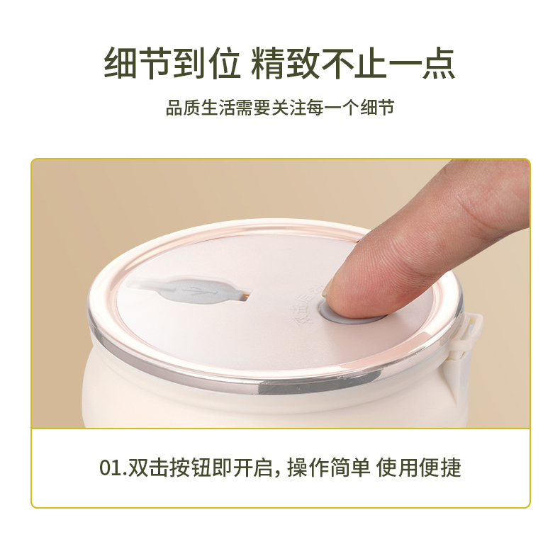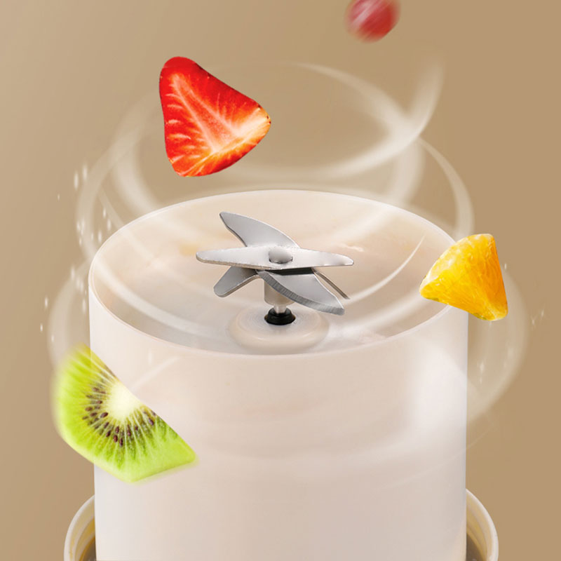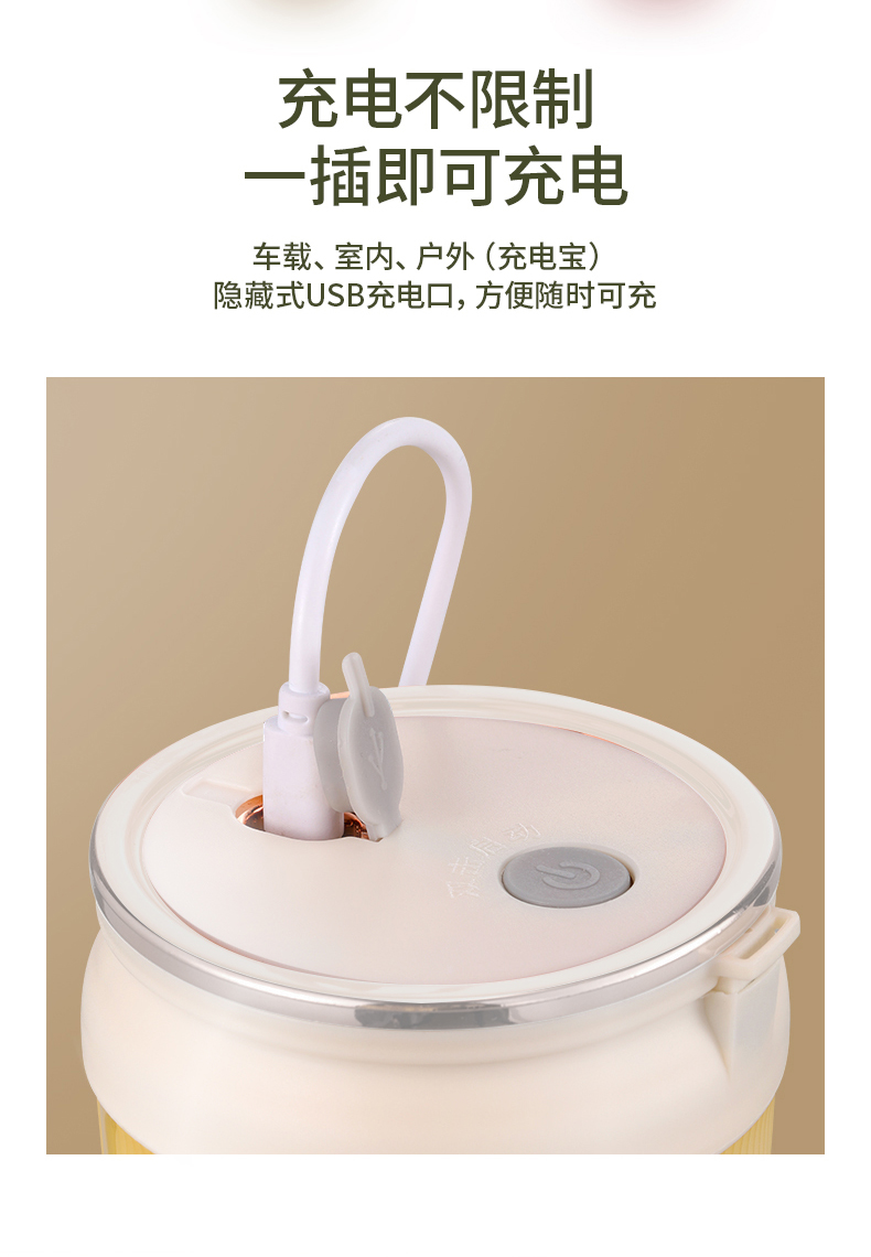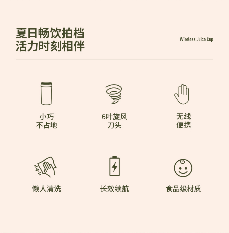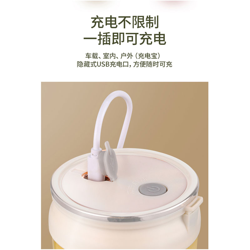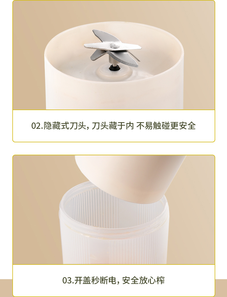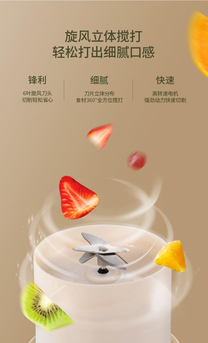产品重量:净重0.3kg / 毛重0.36kg 产品容量:350ml 包装尺寸:106*106*195mm 产品尺寸:80*80*173mm 颜色:米白色/薄荷绿 额定功率:35W 产品卖点: 1、350ml容量,轻巧杯体,随行携带,开盖即饮,鲜榨现喝 ; 2、充电便携,六叶不锈钢刀头,搅打效果更细腻; 3、优质电机,强劲动力,快速成汁 ; 4、设置安全保护,旋开杯体,马上停止工作; 5、双击启动,操作简单,防误触启动; 6、易清洗,冲一冲就干净。