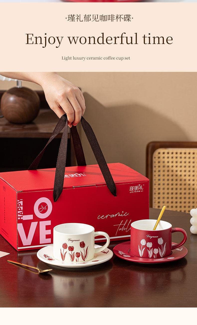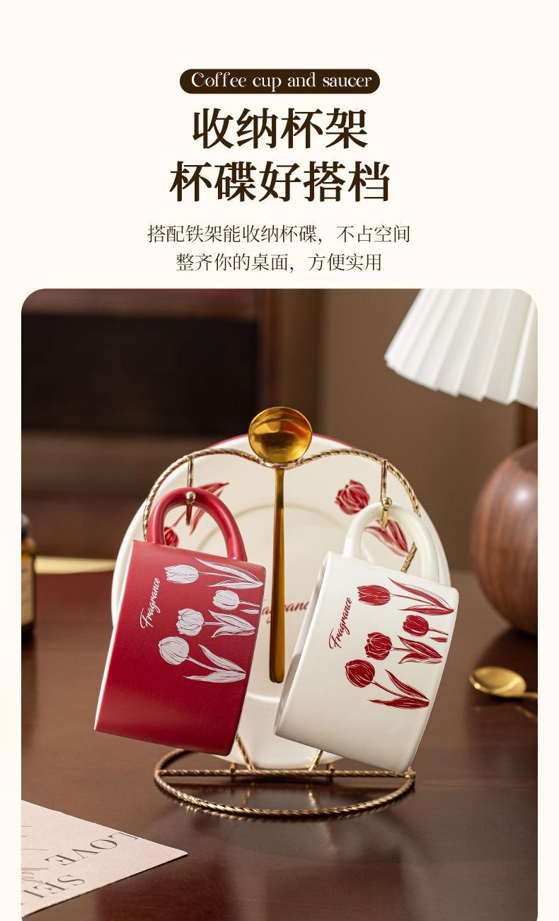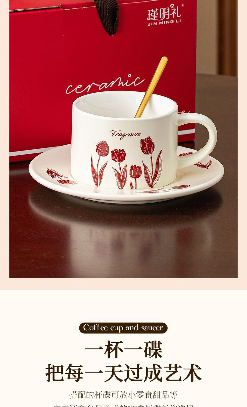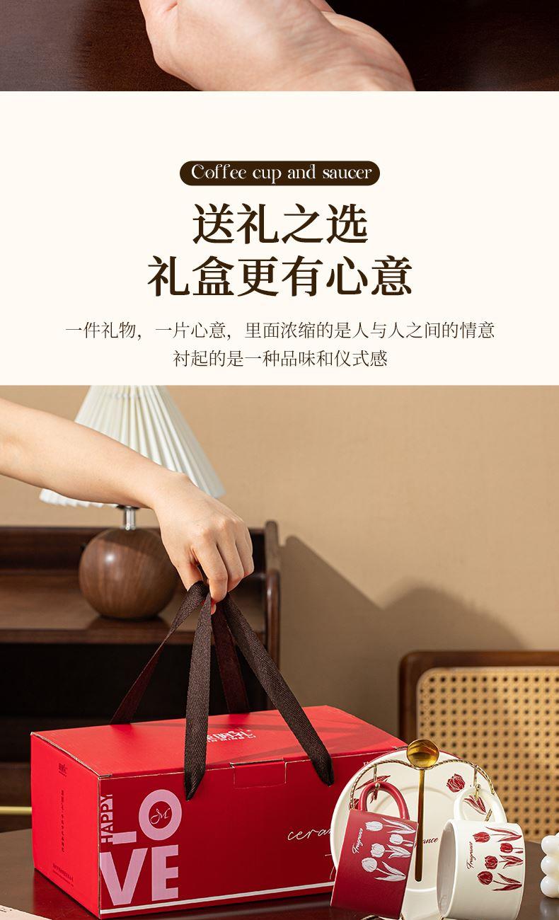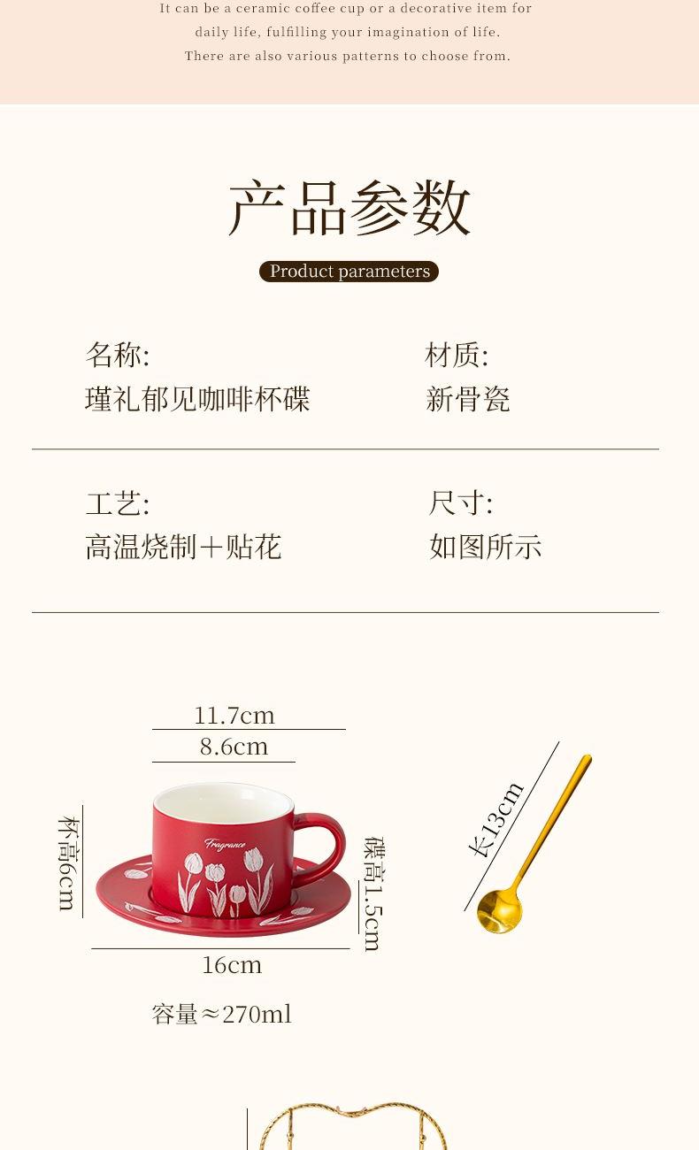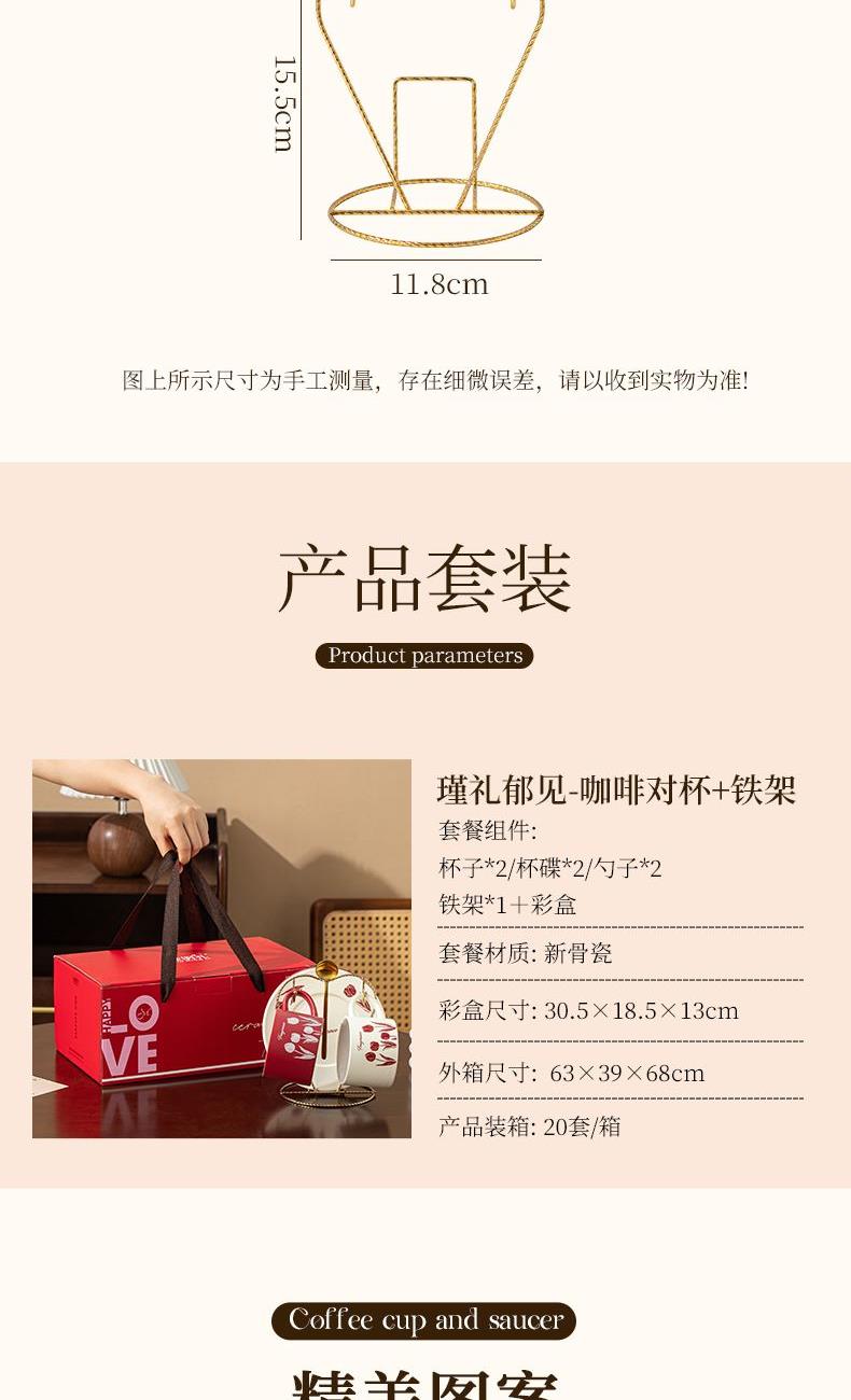 瑾礼郁见-咖啡对杯-2杯2碟2勺1铁架 - 产品组成:整套=2杯2碟2勺1铁架+彩盒 产品材质:新骨瓷 容量:270ml 产品规格:杯=口径8.6cm,高度=6cm;碟=长度16cm,金勺=长13cm;铁架=口径11.8cm,高度=15.5cm, 彩盒尺寸:30.5*18.5*13cm 产品毛重:1.3kg 整箱毛重:28.3kg 外箱尺寸:63*39*68cm - 杯碟以郁金香为花面主题,郁金香优雅、浪漫的形象为产品注入了浓郁的艺术气息,为使用者营造出充满诗意的氛围。无论是在悠闲的午后还是忙碌的清晨,看到杯碟上绽放的郁金香,都能带来愉悦的视觉享受。让咖啡时间,沉浸在郁金香的浪漫花园中。