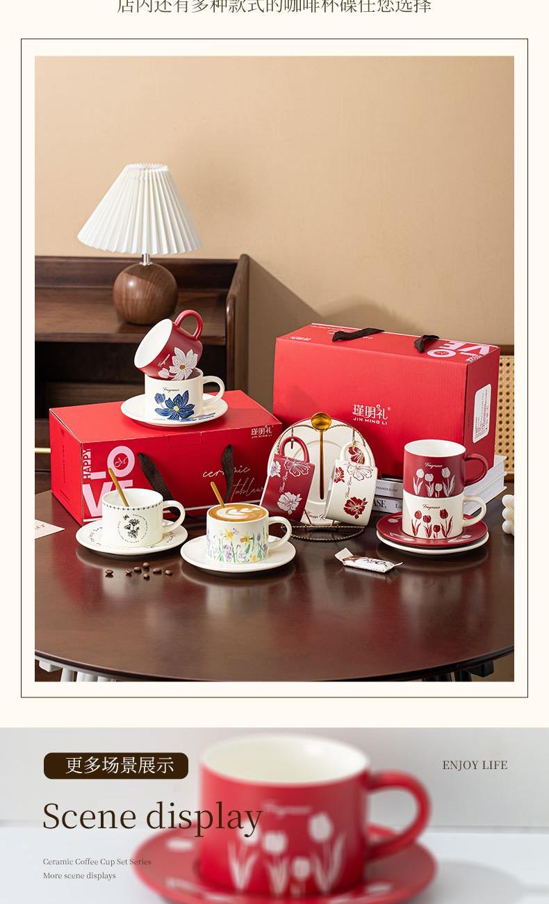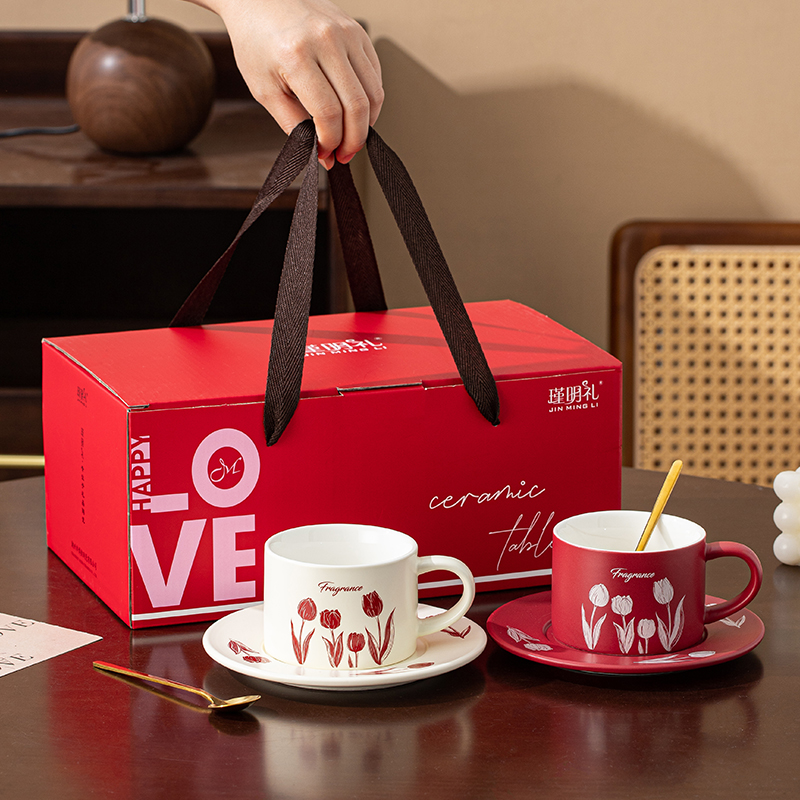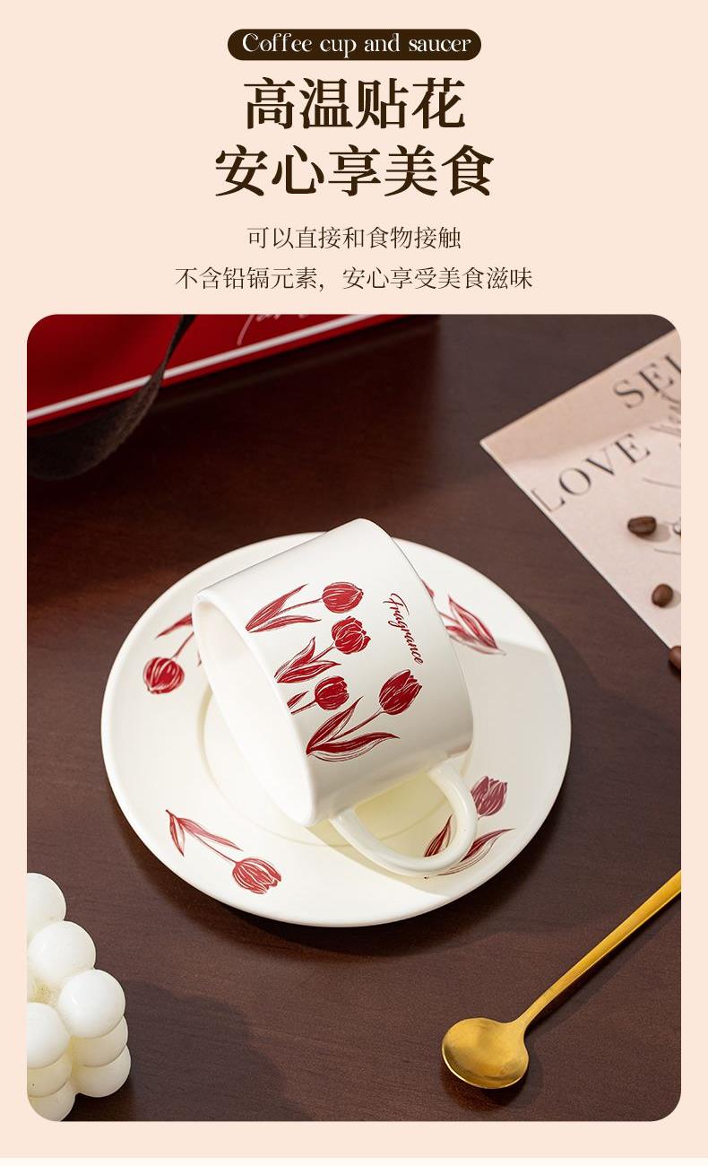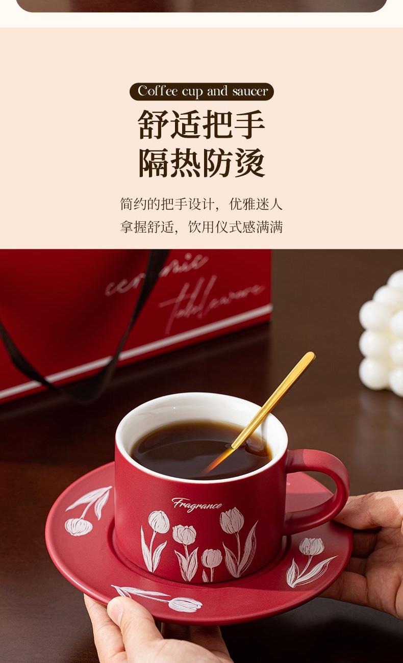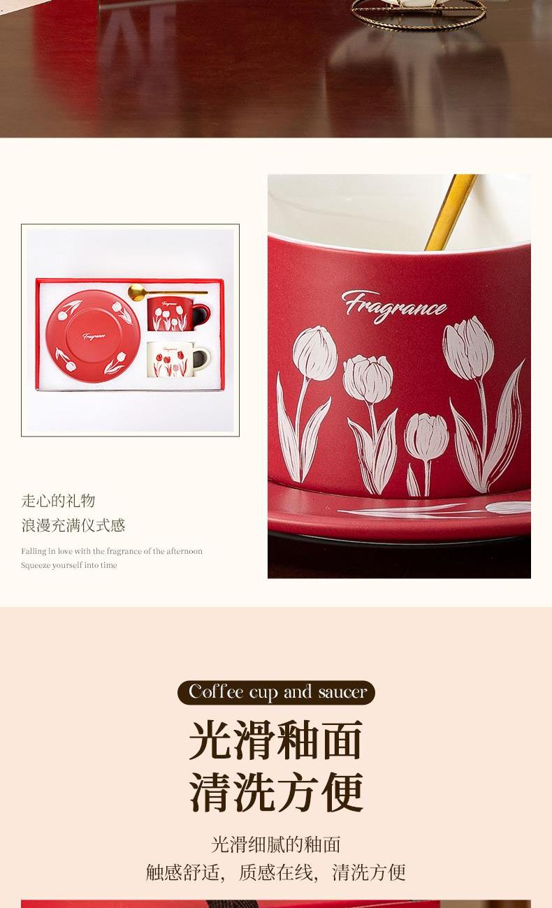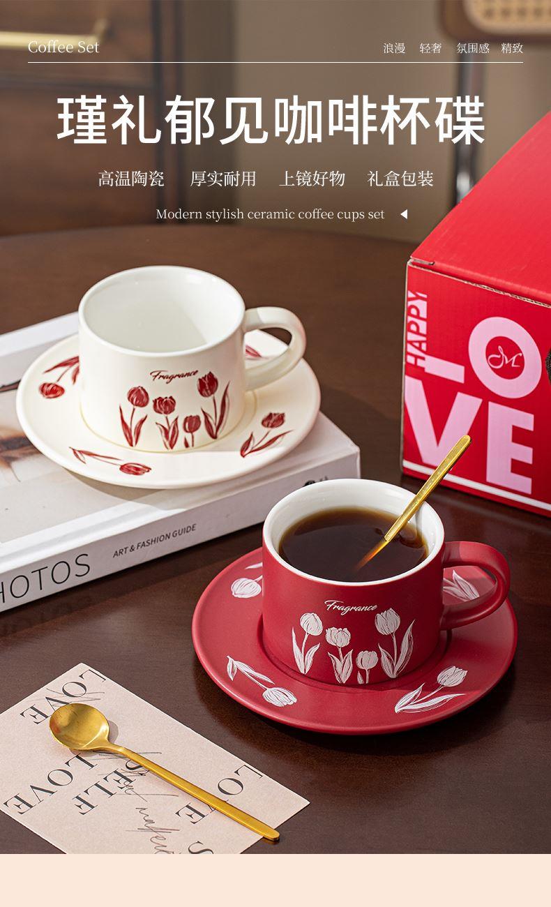 瑾礼郁见-咖啡对杯-2杯2碟2勺1铁架 - 产品组成:整套=2杯2碟2勺1铁架+彩盒 产品材质:新骨瓷 容量:270ml 产品规格:杯=口径8.6cm,高度=6cm;碟=长度16cm,金勺=长13cm;铁架=口径11.8cm,高度=15.5cm, 彩盒尺寸:30.5*18.5*13cm 产品毛重:1.3kg 整箱毛重:28.3kg 外箱尺寸:63*39*68cm - 杯碟以郁金香为花面主题,郁金香优雅、浪漫的形象为产品注入了浓郁的艺术气息,为使用者营造出充满诗意的氛围。无论是在悠闲的午后还是忙碌的清晨,看到杯碟上绽放的郁金香,都能带来愉悦的视觉享受。让咖啡时间,沉浸在郁金香的浪漫花园中。