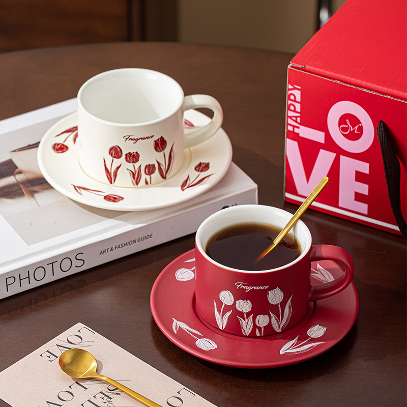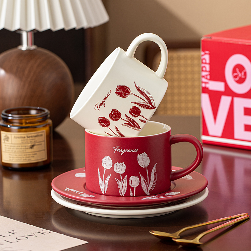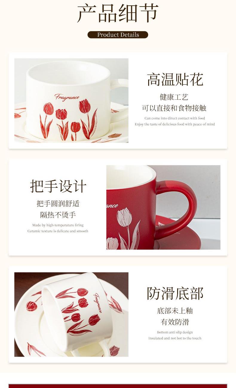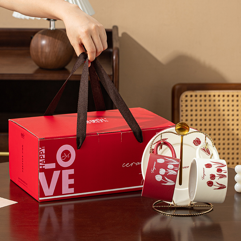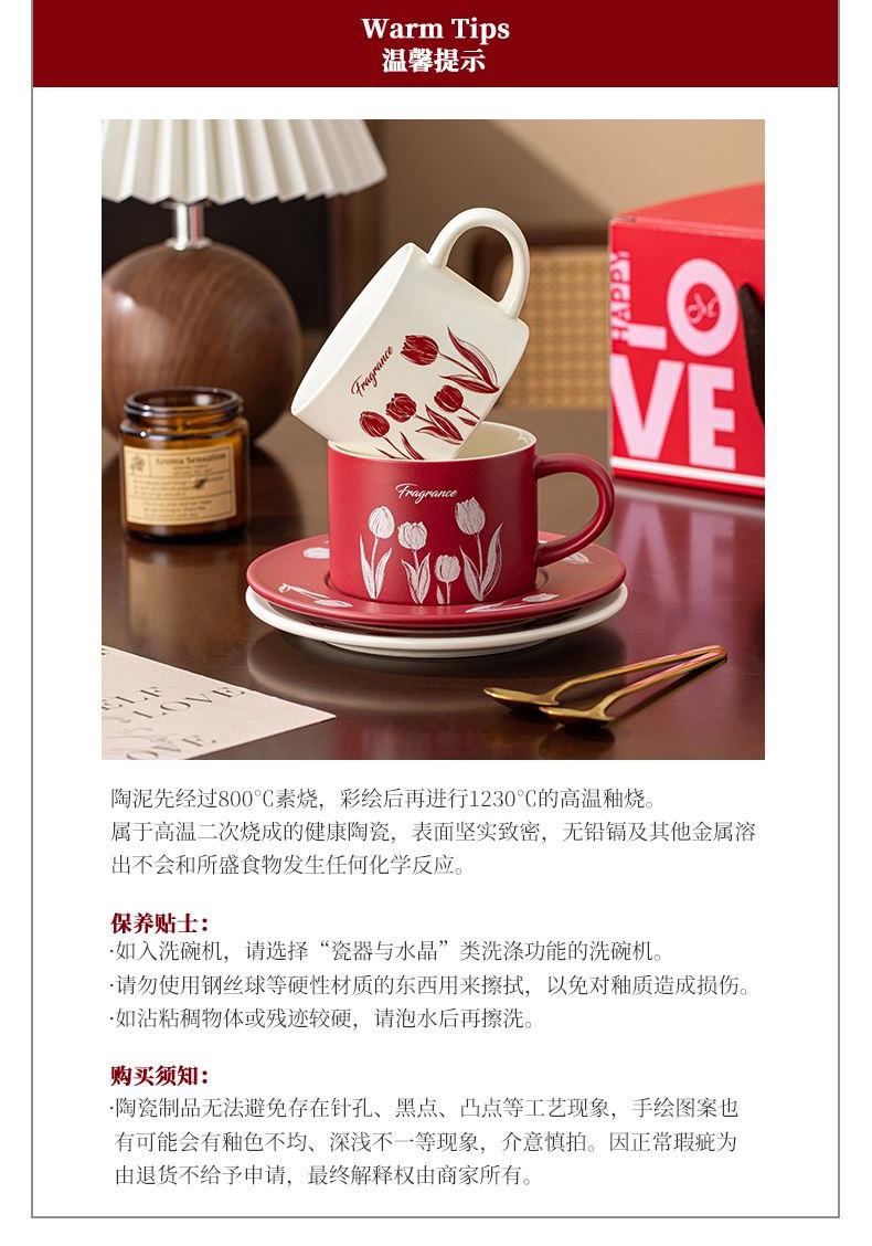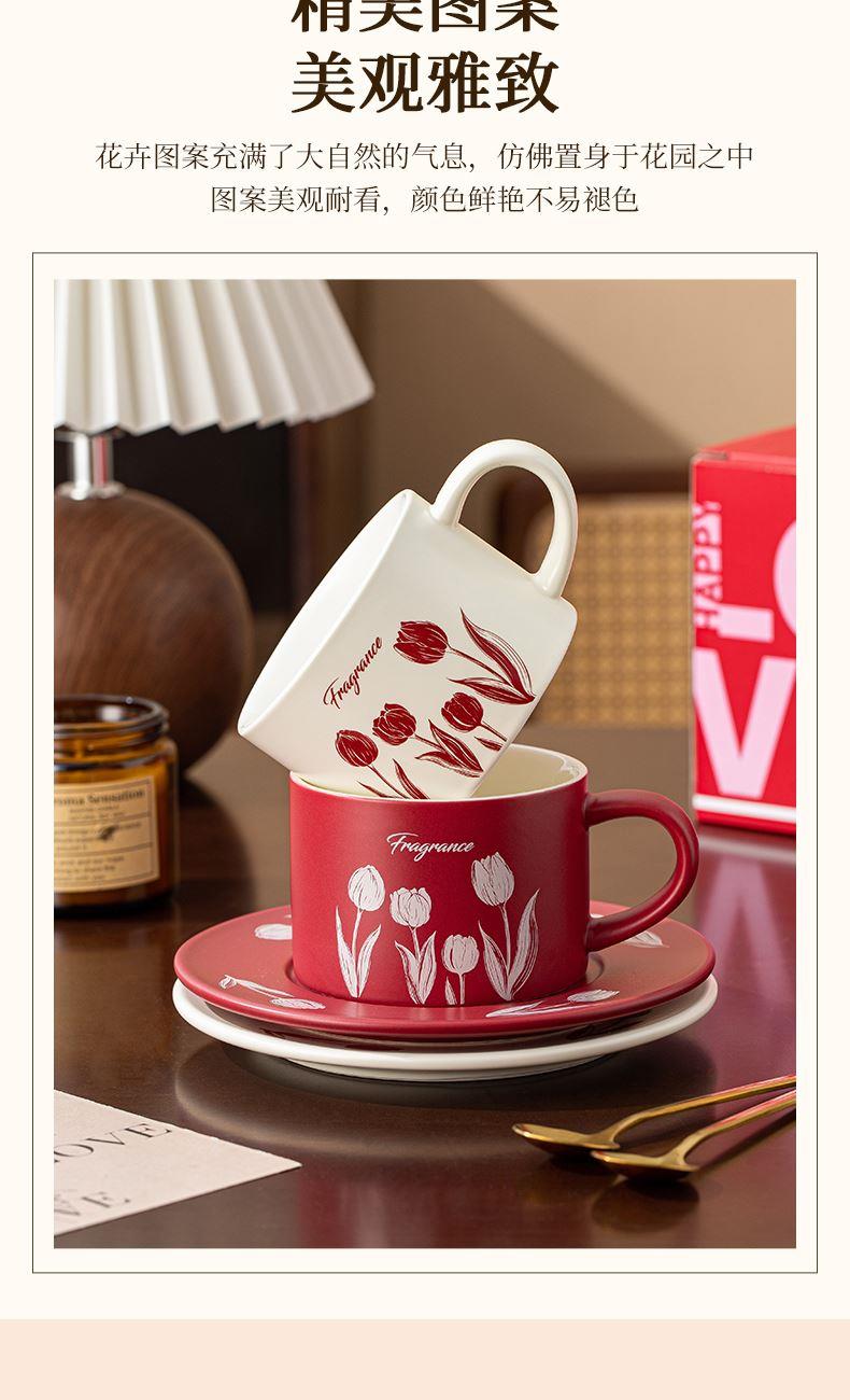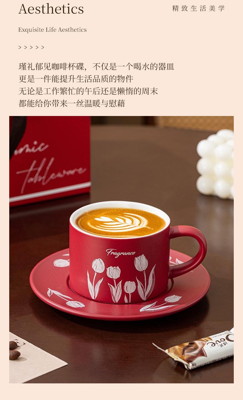 瑾礼郁见-咖啡对杯-2杯2碟2勺1铁架 - 产品组成:整套=2杯2碟2勺1铁架+彩盒 产品材质:新骨瓷 容量:270ml 产品规格:杯=口径8.6cm,高度=6cm;碟=长度16cm,金勺=长13cm;铁架=口径11.8cm,高度=15.5cm, 彩盒尺寸:30.5*18.5*13cm 产品毛重:1.3kg 整箱毛重:28.3kg 外箱尺寸:63*39*68cm - 杯碟以郁金香为花面主题,郁金香优雅、浪漫的形象为产品注入了浓郁的艺术气息,为使用者营造出充满诗意的氛围。无论是在悠闲的午后还是忙碌的清晨,看到杯碟上绽放的郁金香,都能带来愉悦的视觉享受。让咖啡时间,沉浸在郁金香的浪漫花园中。