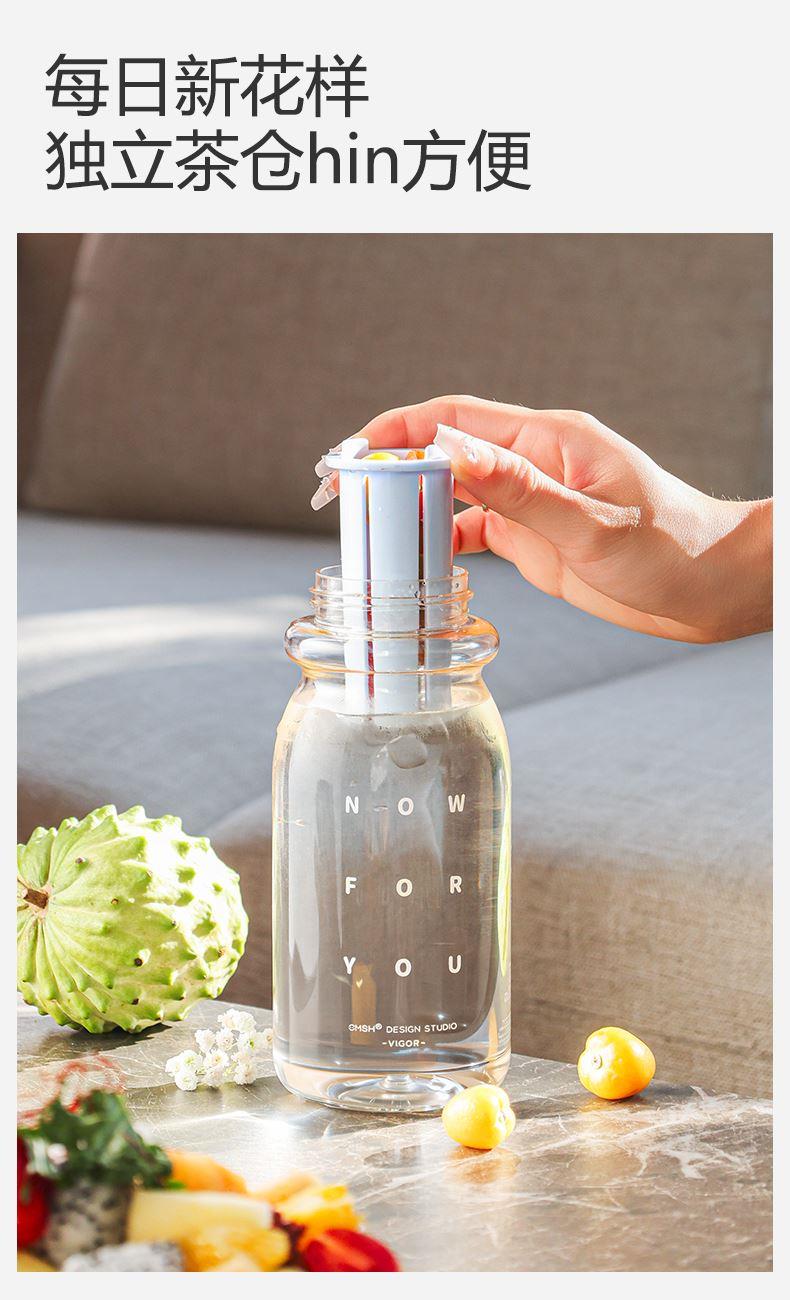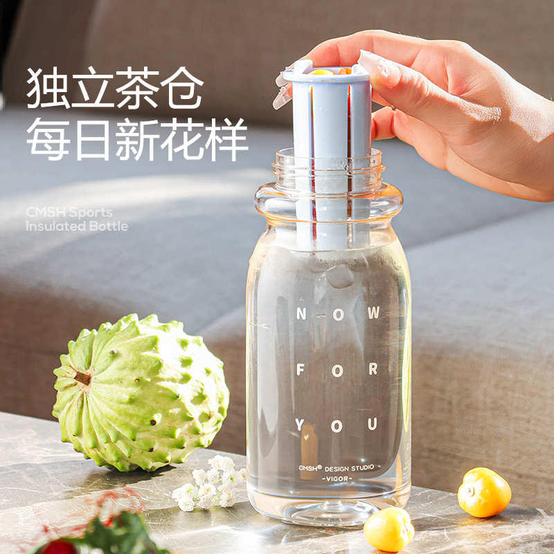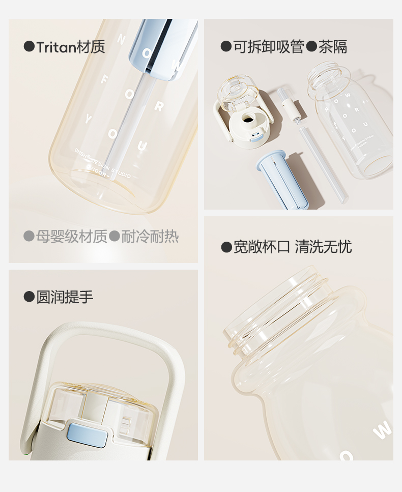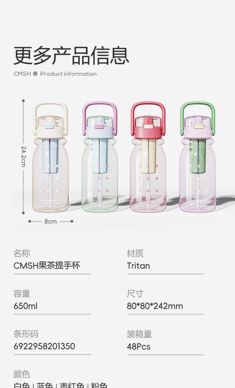 杯身材质:Tritan 杯盖材质:PC+PP 茶隔材质:PP 提绳材质:PC 产品容量:650ml 产品尺寸:80*80*242mm 产品净重:198g 产品颜色:白色,蓝色,粉色,枣红色 装 箱 量:48pcs 包装方式:独立彩盒包装 产品卖点: 650ml大容量 全天候补水无忧。 更出色,更自由:补充每日多巴胺。 一冲就干净,全身可拆洗,无死角。 每日新花样独立茶仓hin方便。 Tritan材质,不含双酚A饮水更安心。
