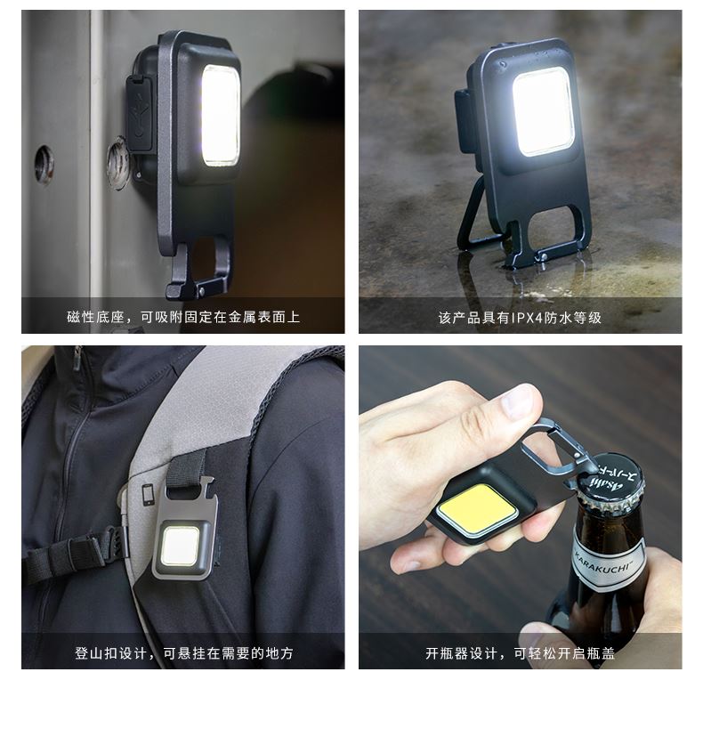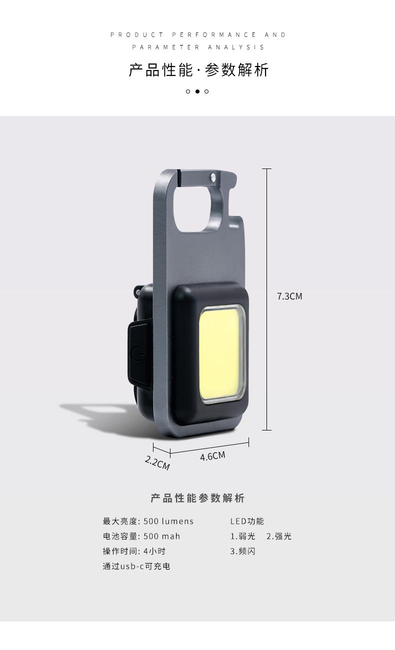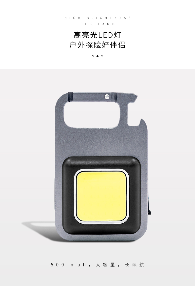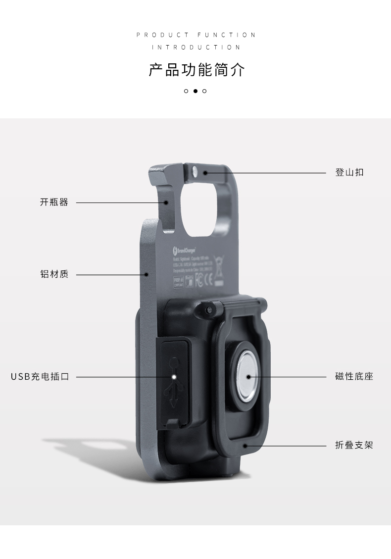 1、三档调节亮度,高亮,中亮,频闪急救。 2、USB充电,500毫安电池,持续5个小时亮度 3、500流明,超级亮,可照亮50平方房间 3、户外用途:可挂包上,钥匙扣、开瓶器、相机支架用于补光灯,背后磁吸固定 4、4级防水设计,雨中一样轻松使用 5、全身为会收铝制成,真环保♻♻♻ 6、可以斜挎,可以挂脖子 7、尺寸: 7.3x4.6x2.2厘米