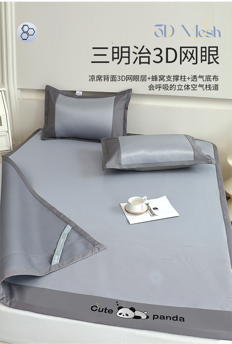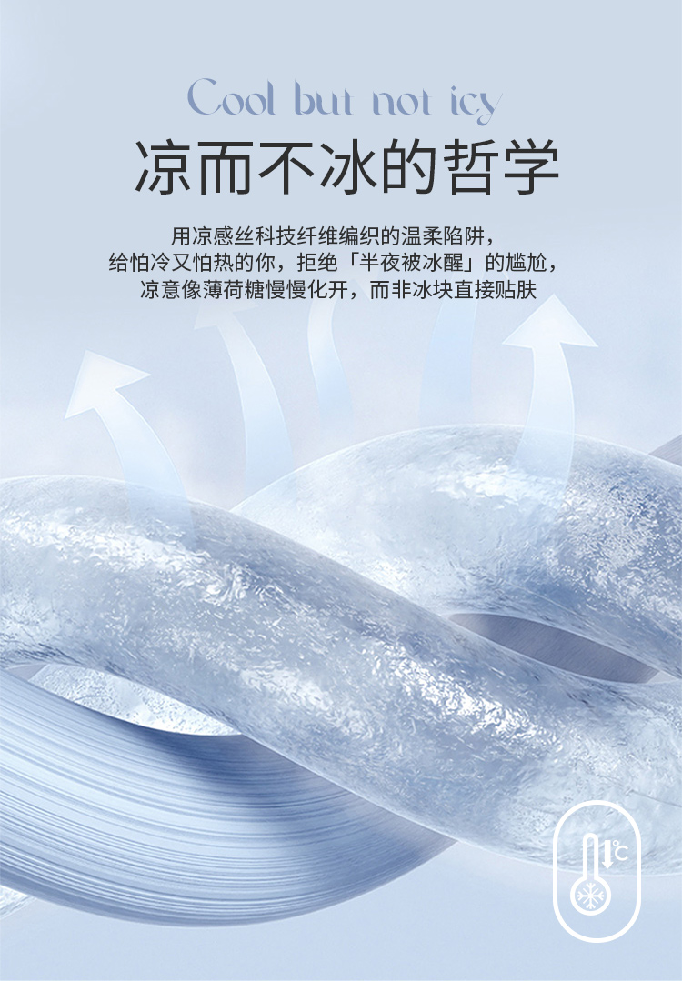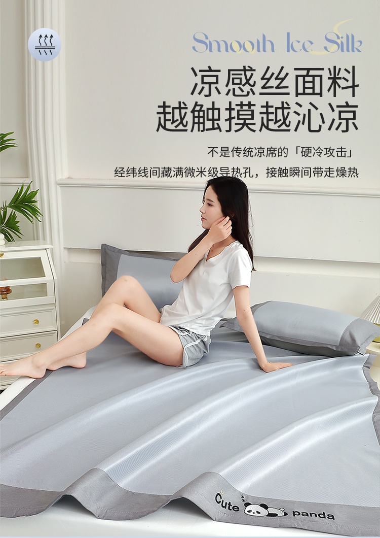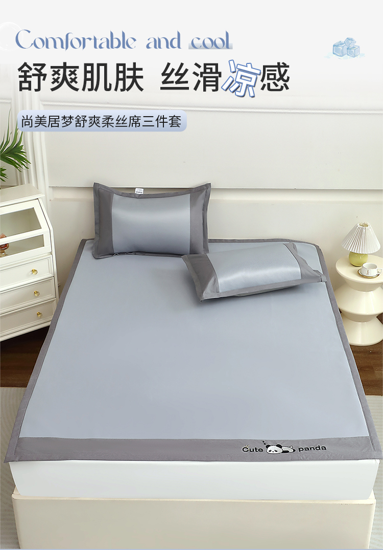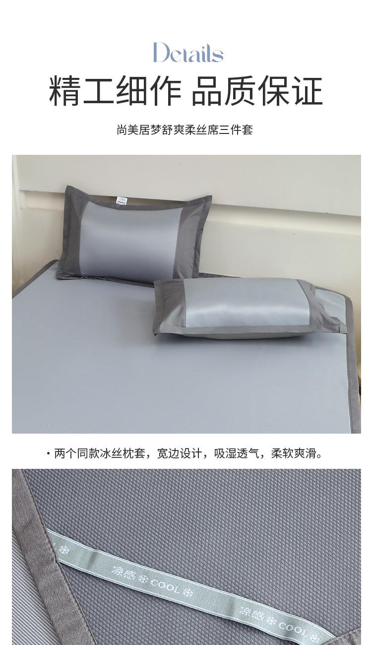 品 名: 尚美居梦舒爽柔丝席三件套 型 号: HS-X-XW25801 面 料: 凉感丝( 聚酯纤维) 底 布: 聚酯纤维 规 格: 凉席150*200cm 枕套48*74cm 产品说明: 春夏凉感柔丝席三件套 ,采用 300D 碳化冰丝织造工艺 ,能将自 身热量快速传导到空气中而保持身 体及触感凉爽干燥 , 凉而不冰 ,反 面采用三明治透气网格面料 , 散热 性优。 色布包边工艺 ,简约立体。 柔软可折叠 ,无折痕无压印 ,机洗 不变形 ,是一款适合夏季使用的凉 感床品。