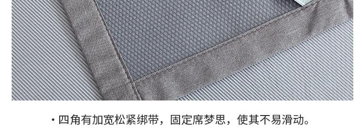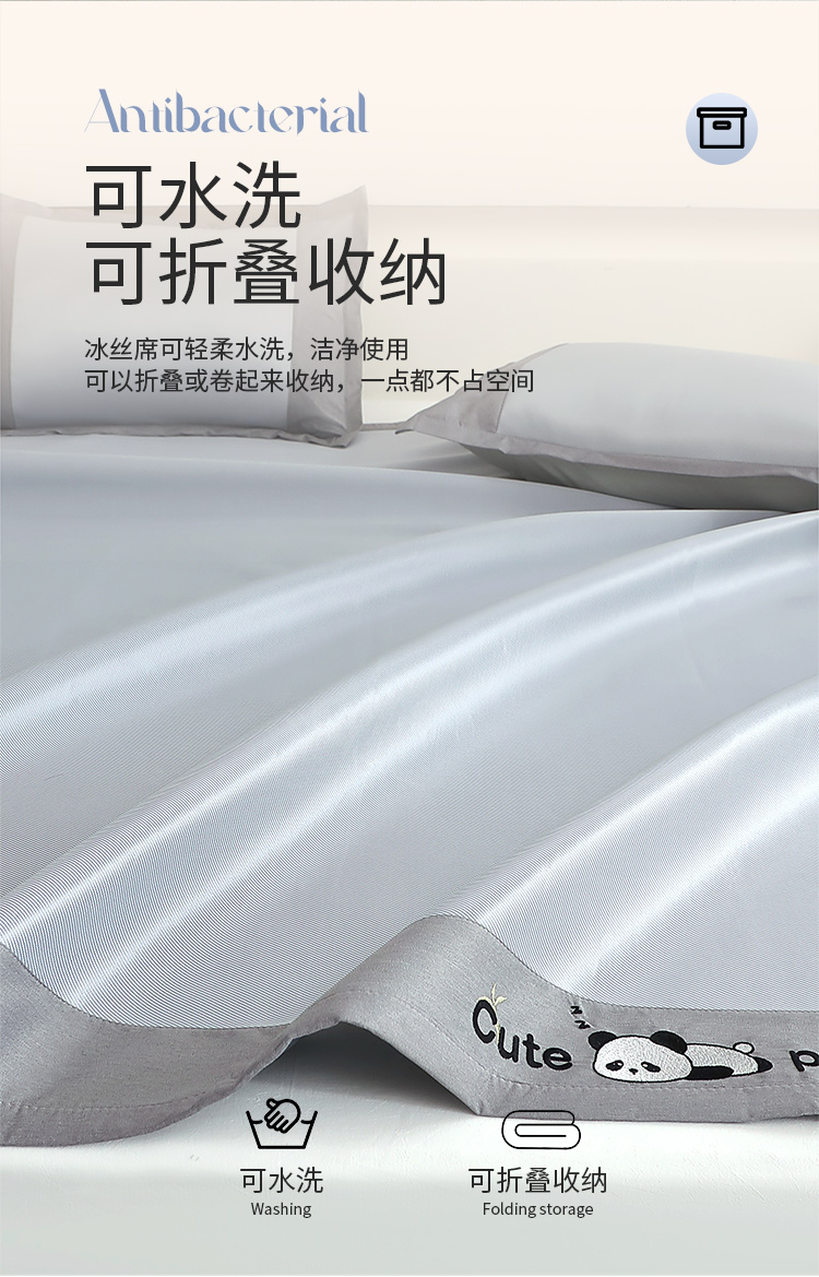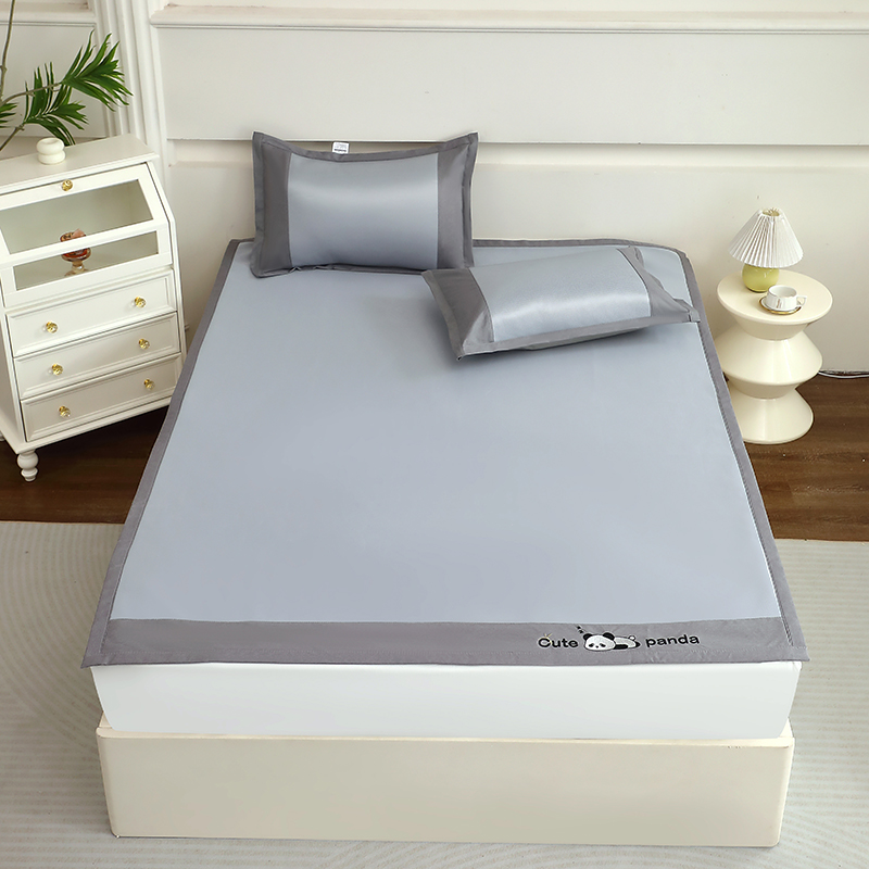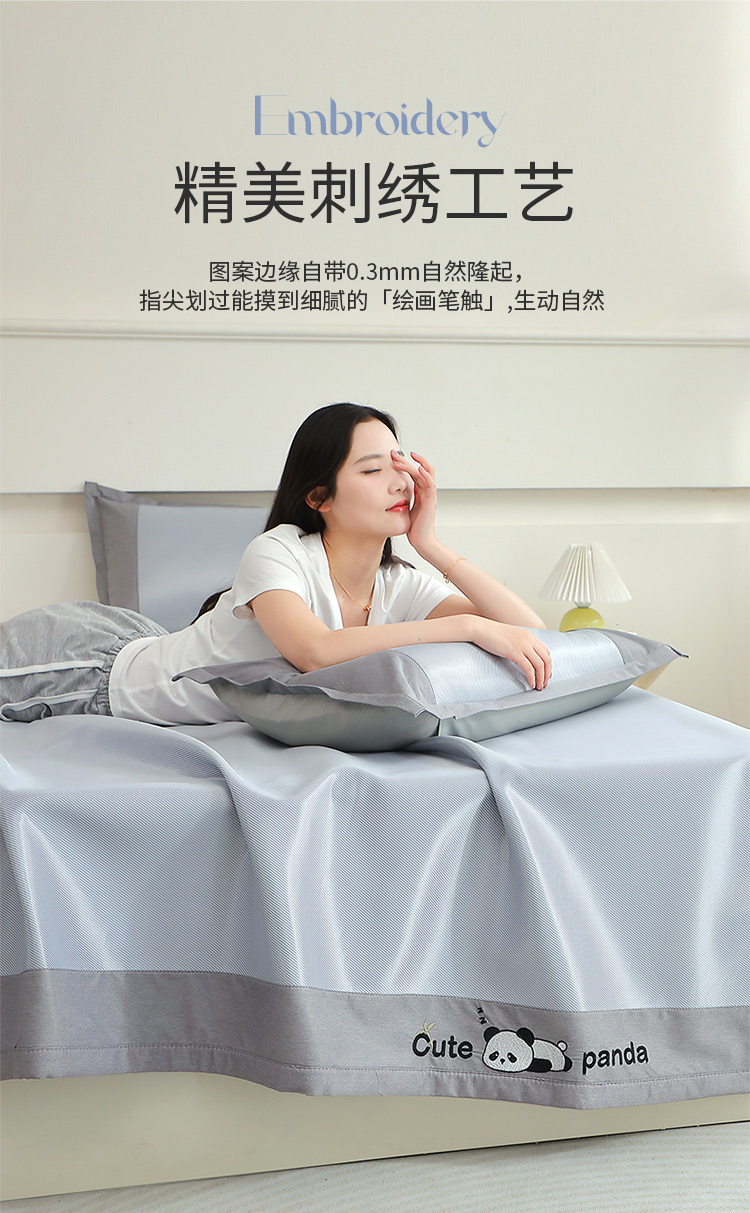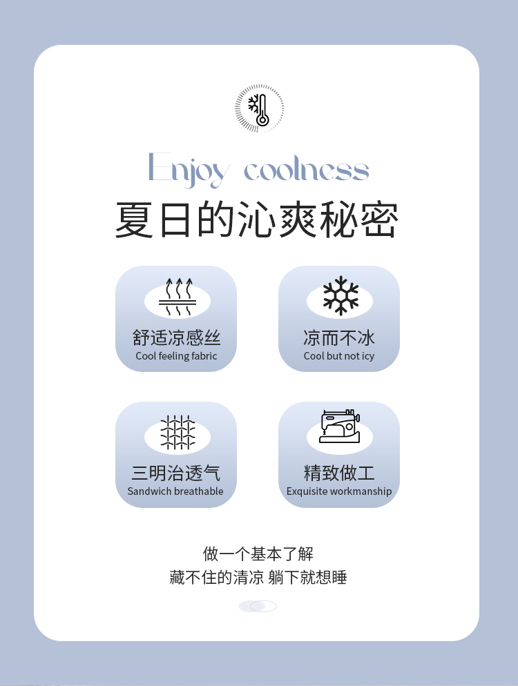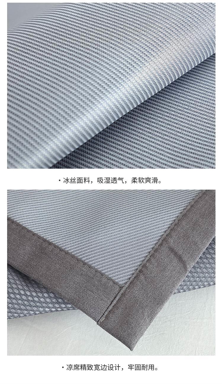 品 名: 尚美居梦舒爽柔丝席三件套 型 号: HS-X-XW25801 面 料: 凉感丝( 聚酯纤维) 底 布: 聚酯纤维 规 格: 凉席150*200cm 枕套48*74cm 产品说明: 春夏凉感柔丝席三件套 ,采用 300D 碳化冰丝织造工艺 ,能将自 身热量快速传导到空气中而保持身 体及触感凉爽干燥 , 凉而不冰 ,反 面采用三明治透气网格面料 , 散热 性优。 色布包边工艺 ,简约立体。 柔软可折叠 ,无折痕无压印 ,机洗 不变形 ,是一款适合夏季使用的凉 感床品。